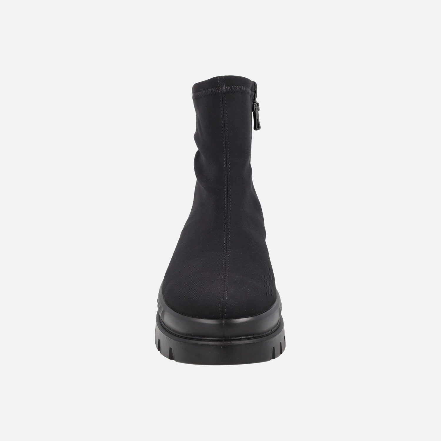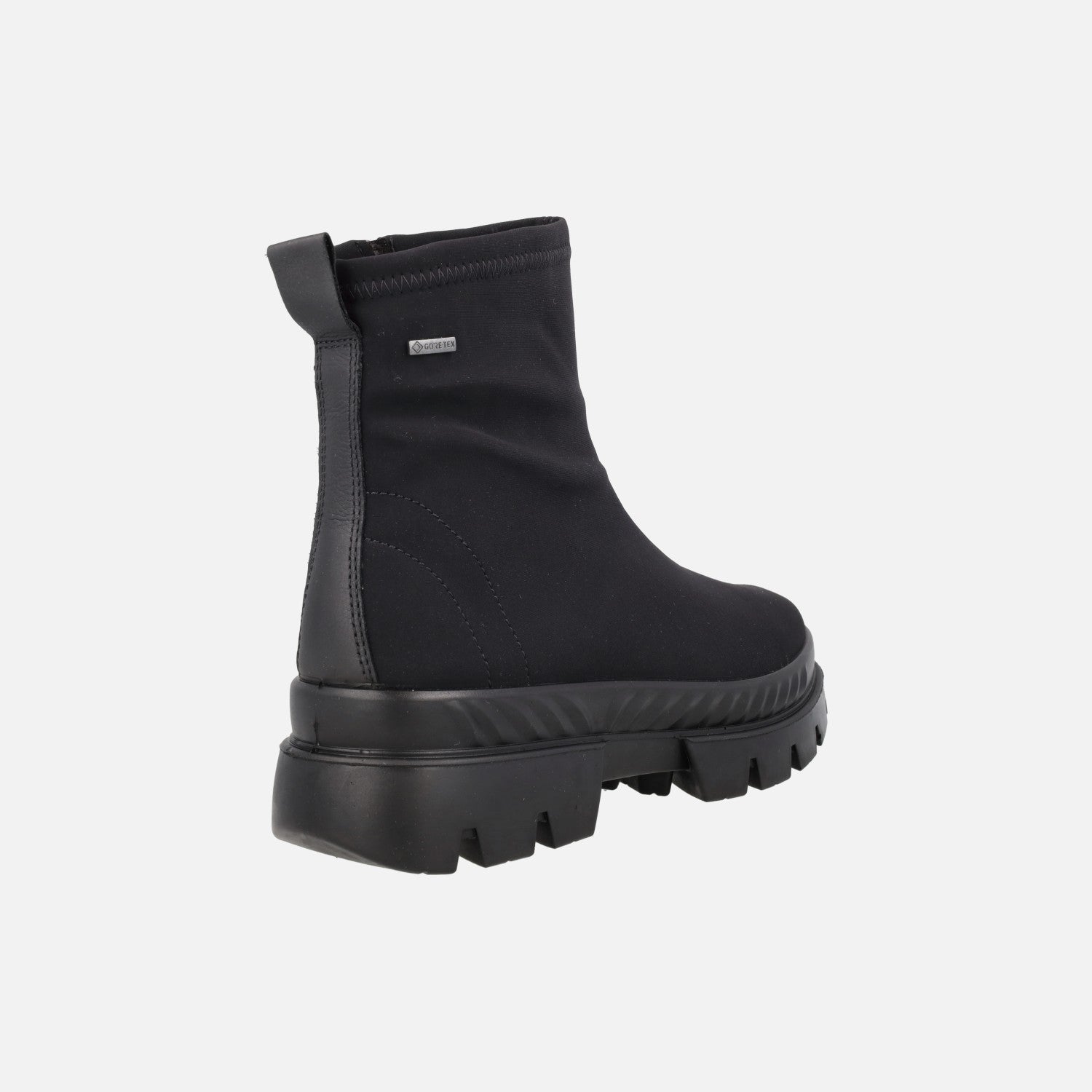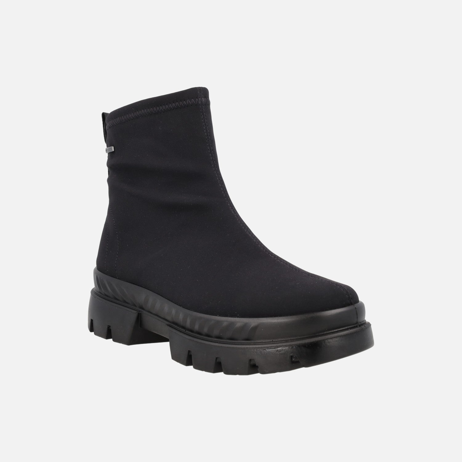 Botines negros en tejido lycra de la marca Ara, modelo 1214102-01 Schwarz. Botines para mujer elaborados en tejido elástico negro, con interior textil (similar a borreguito) y membrana interior impermeable de GORE TEX. Plantillas extraíbles. Caña de aproximadamente 13 cm de altura. Piso track, de 5,5 cm de altura trasera (2 cm parte delantera).