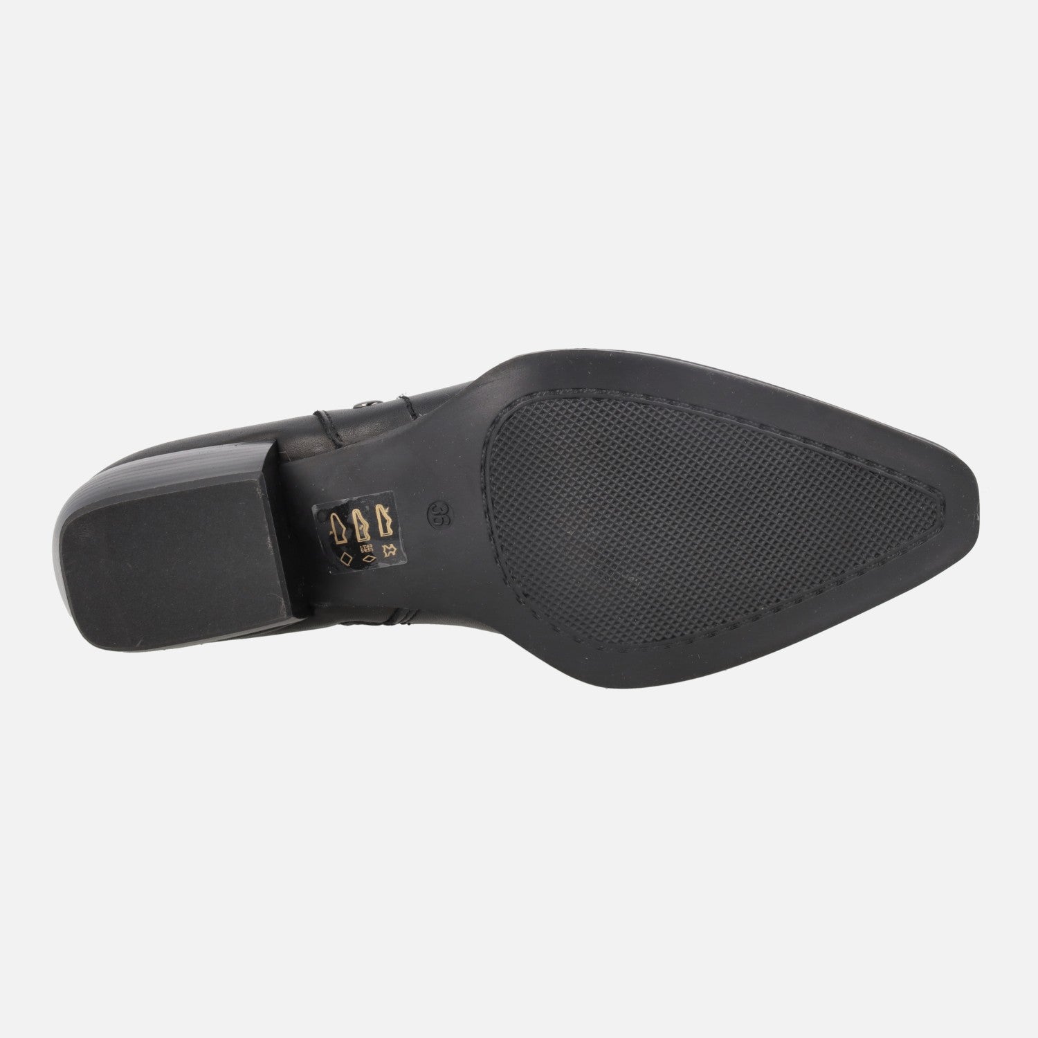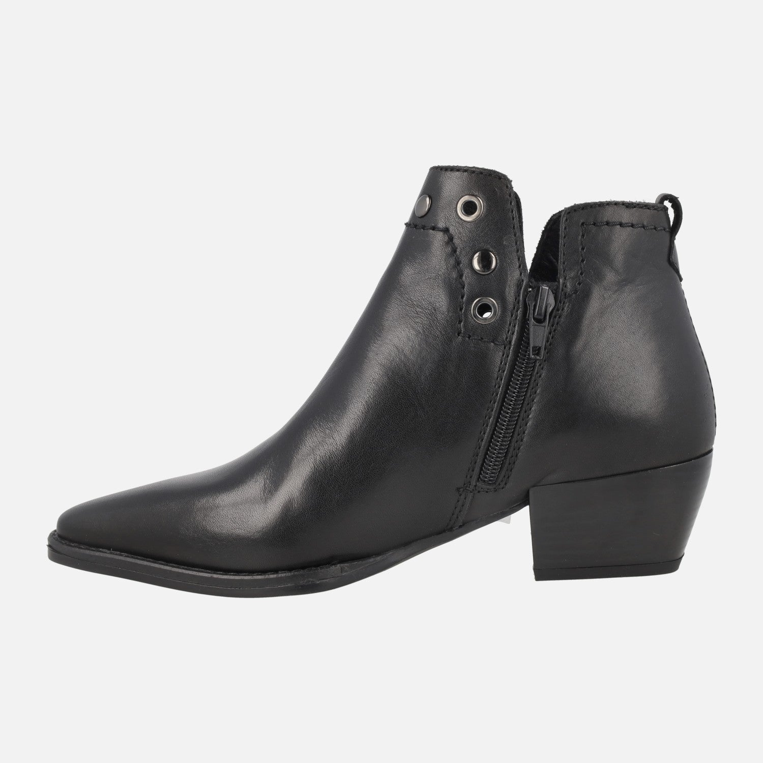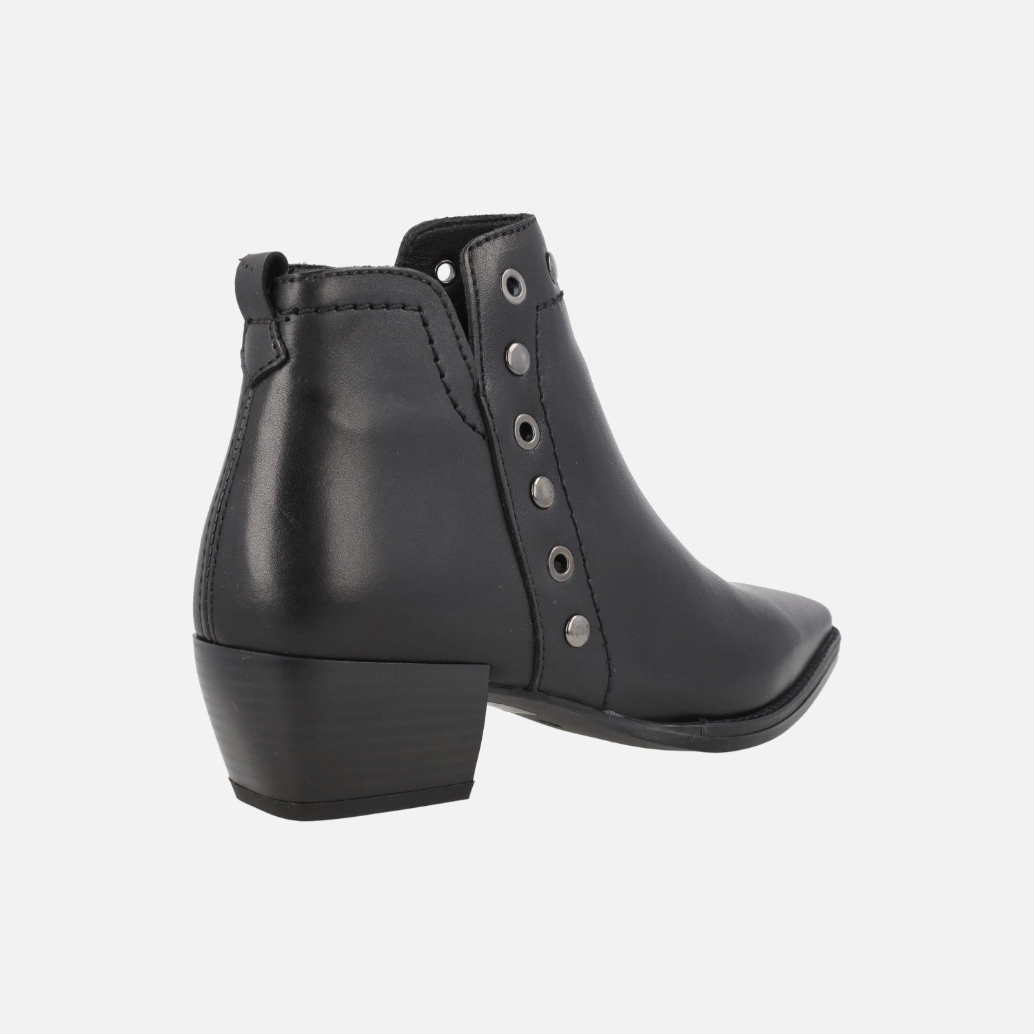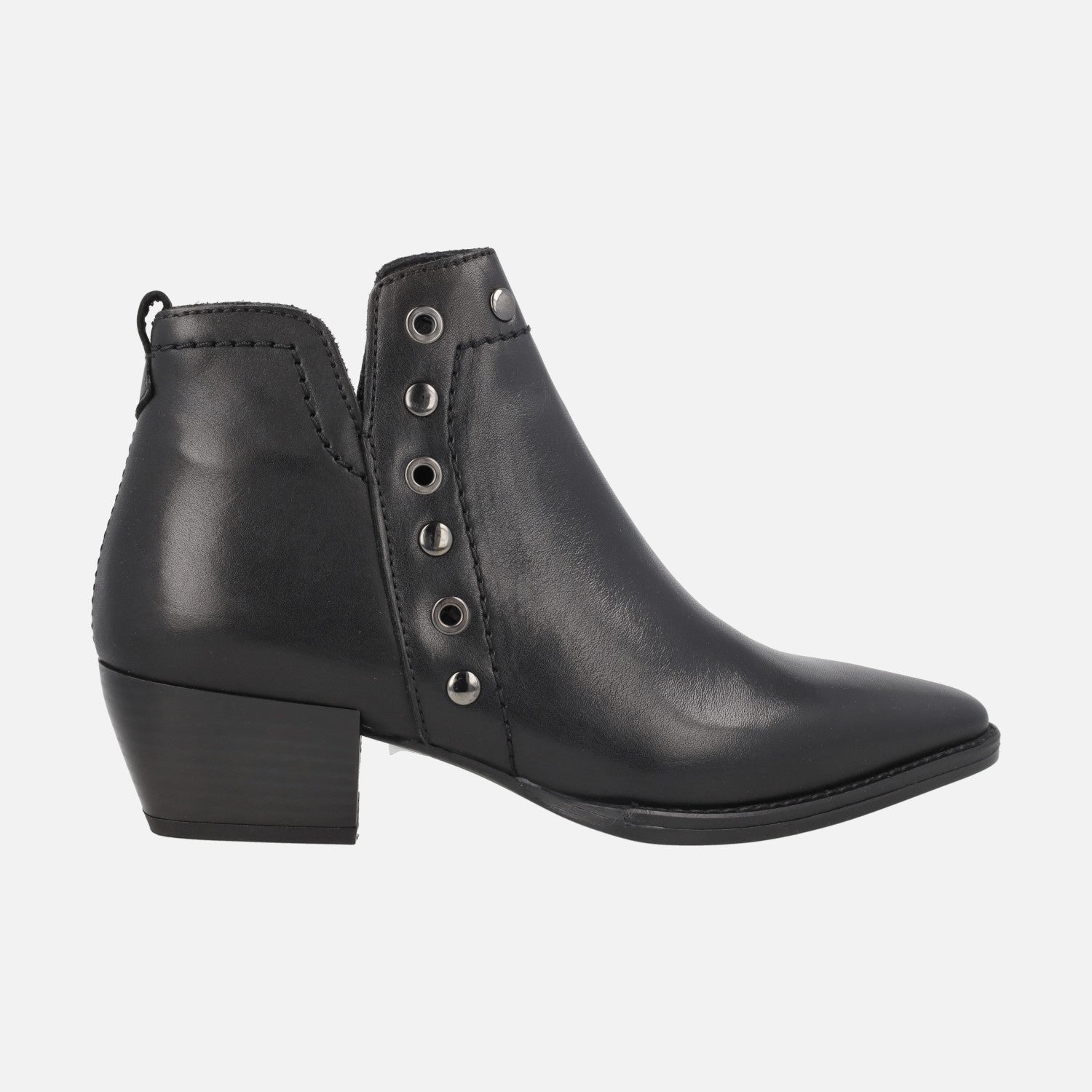 Botines negros de piel estilo cowboy de la marca Lol shoes modelo ADELE 7430 Piel negra. Botines de piel con adorno de remaches metálicos plateados. Cierre de cremallera en el lado interior. Interiores en combinado de tejido y sintéticos. Tacones de 4,5 cm de altura.