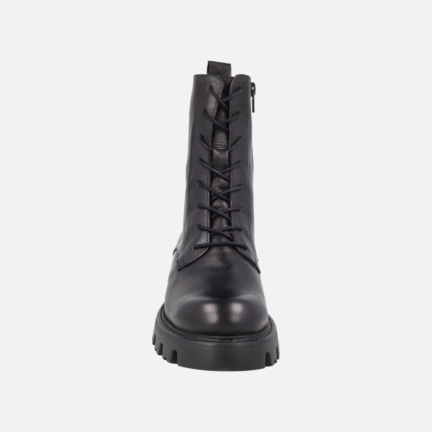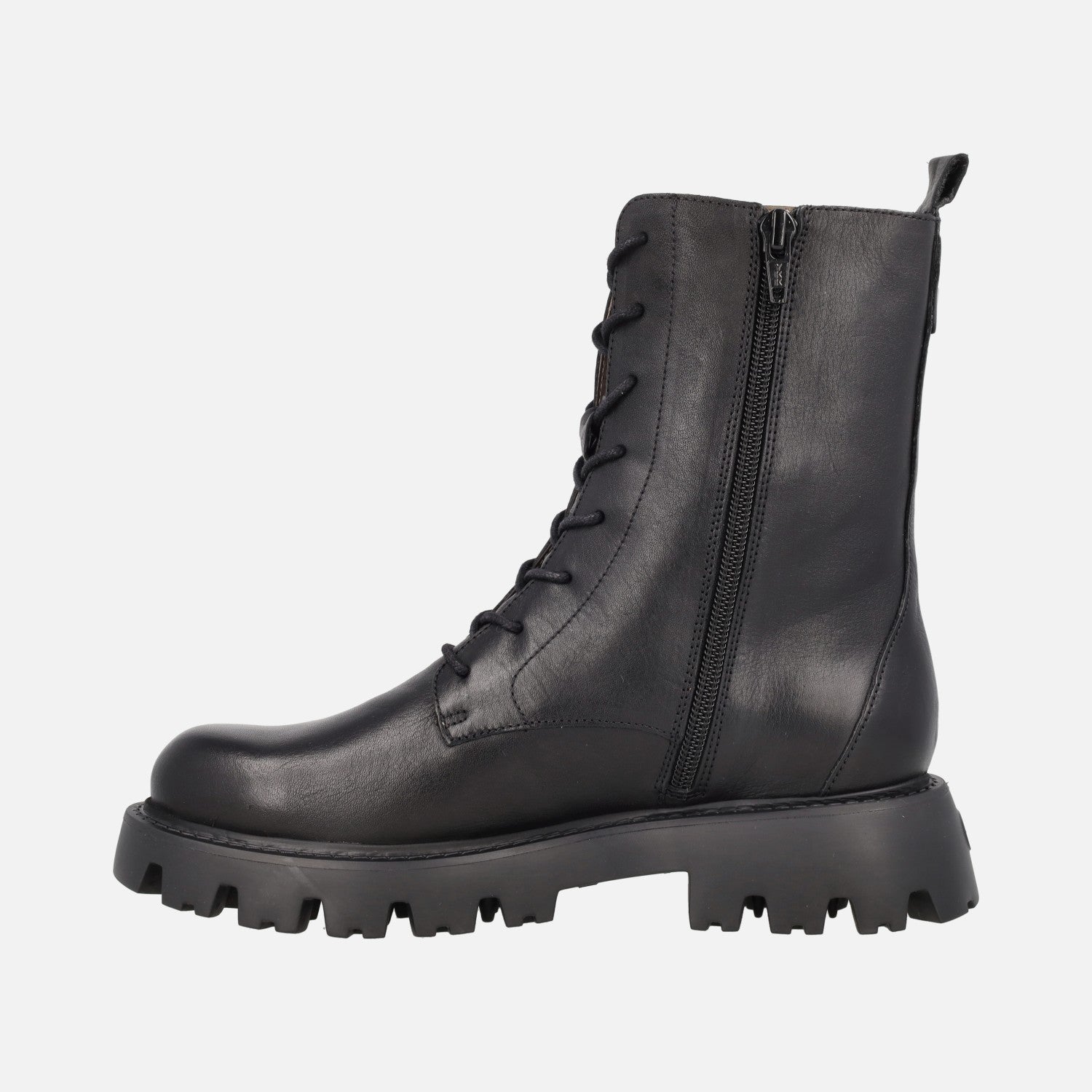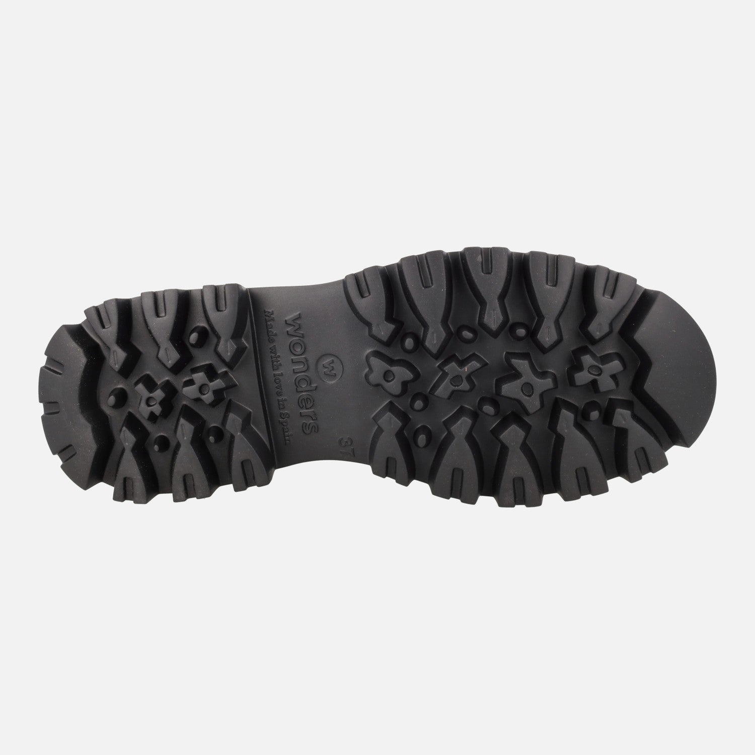 Botines negros de piel de la marca Wonders, modelo Goodfly 10 c-7510 Bulut negro. Botines negros, de piel, con cordones en la parte delantera y cremallera en el lateral interior. Piso sintético, EXTRALIGHT, de gran ligereza y comodidad. Interiores forrados en piel y tejido. Caña de 18 cm de altura, con tirador trasero. Altura de tacón 4 cm (2,5 cm plataforma delantera).