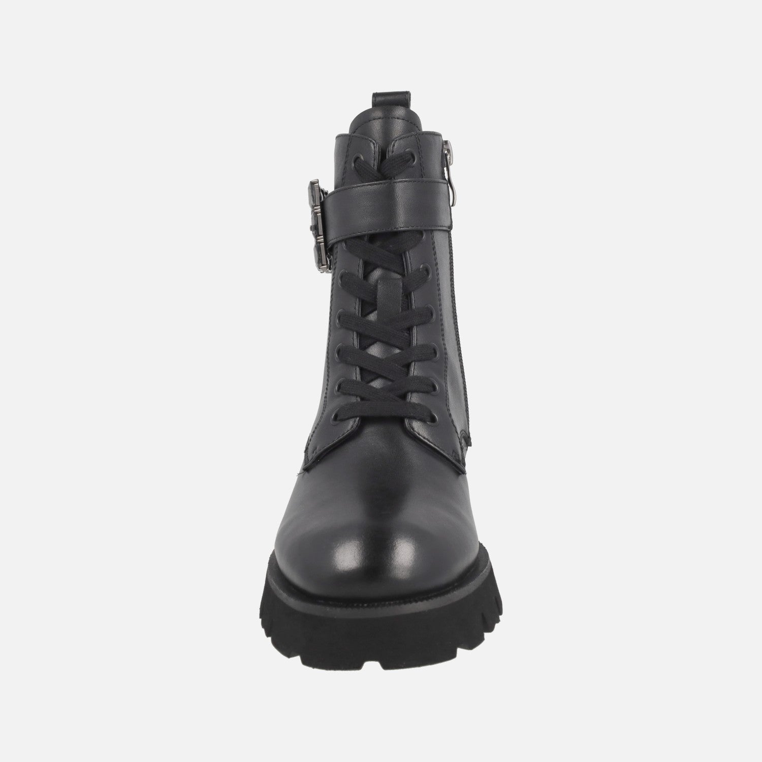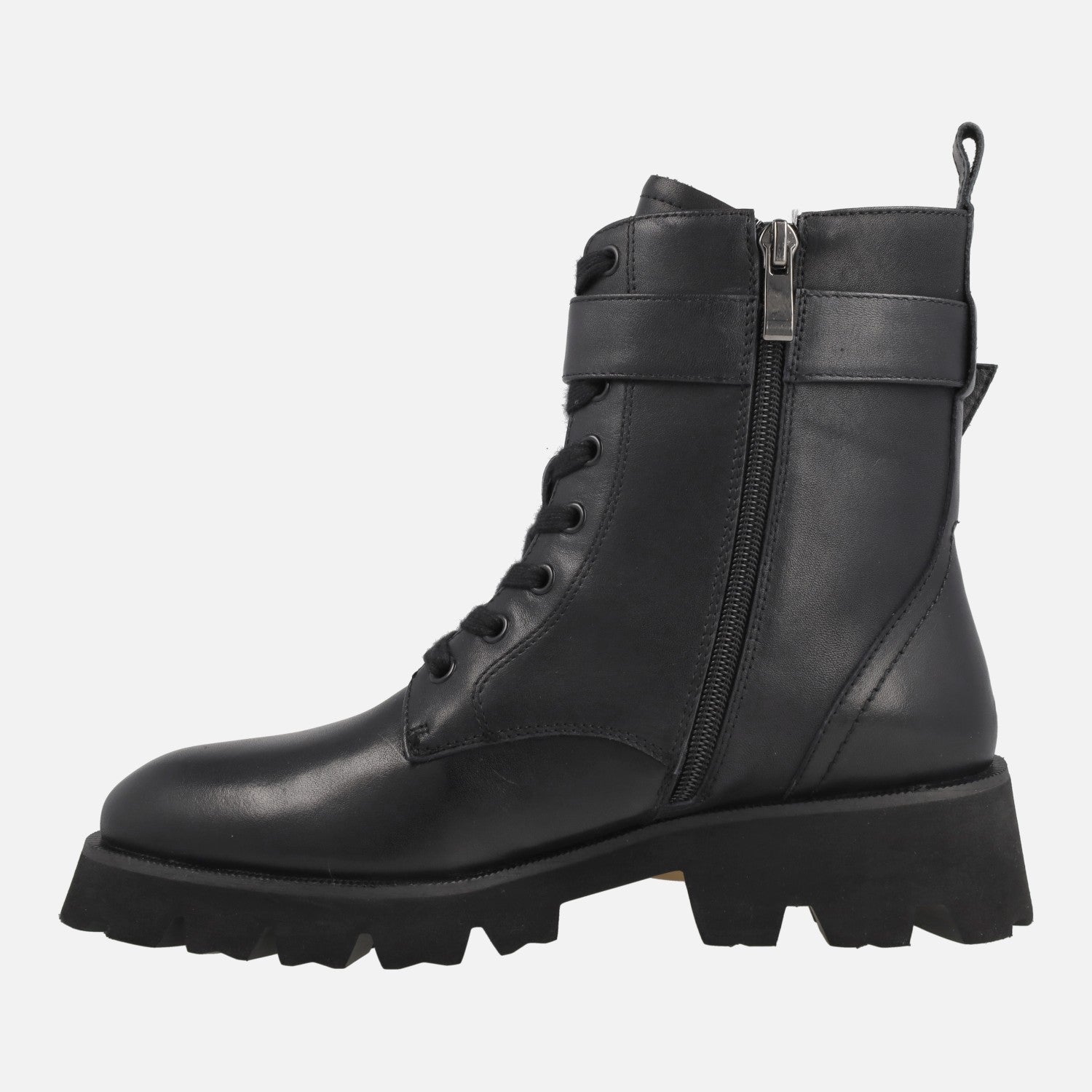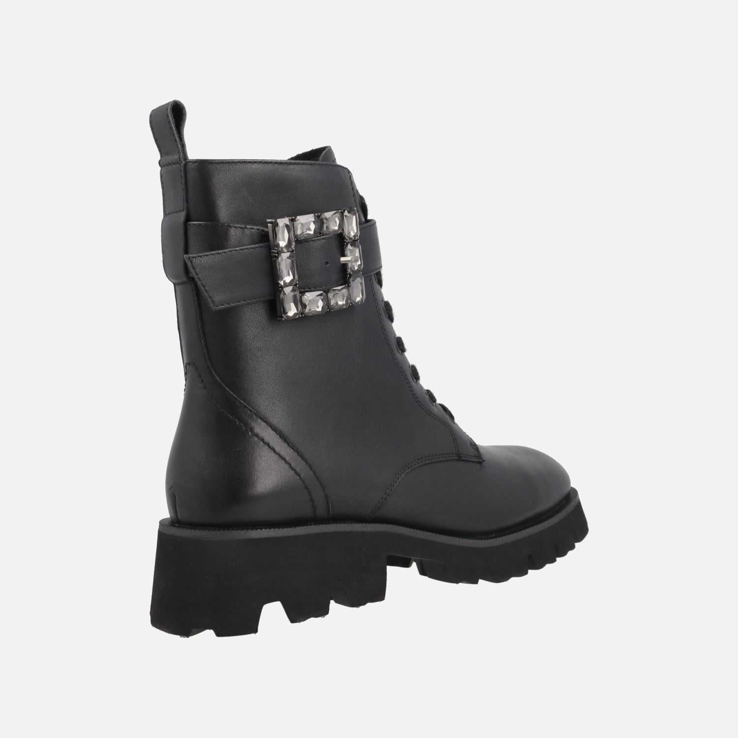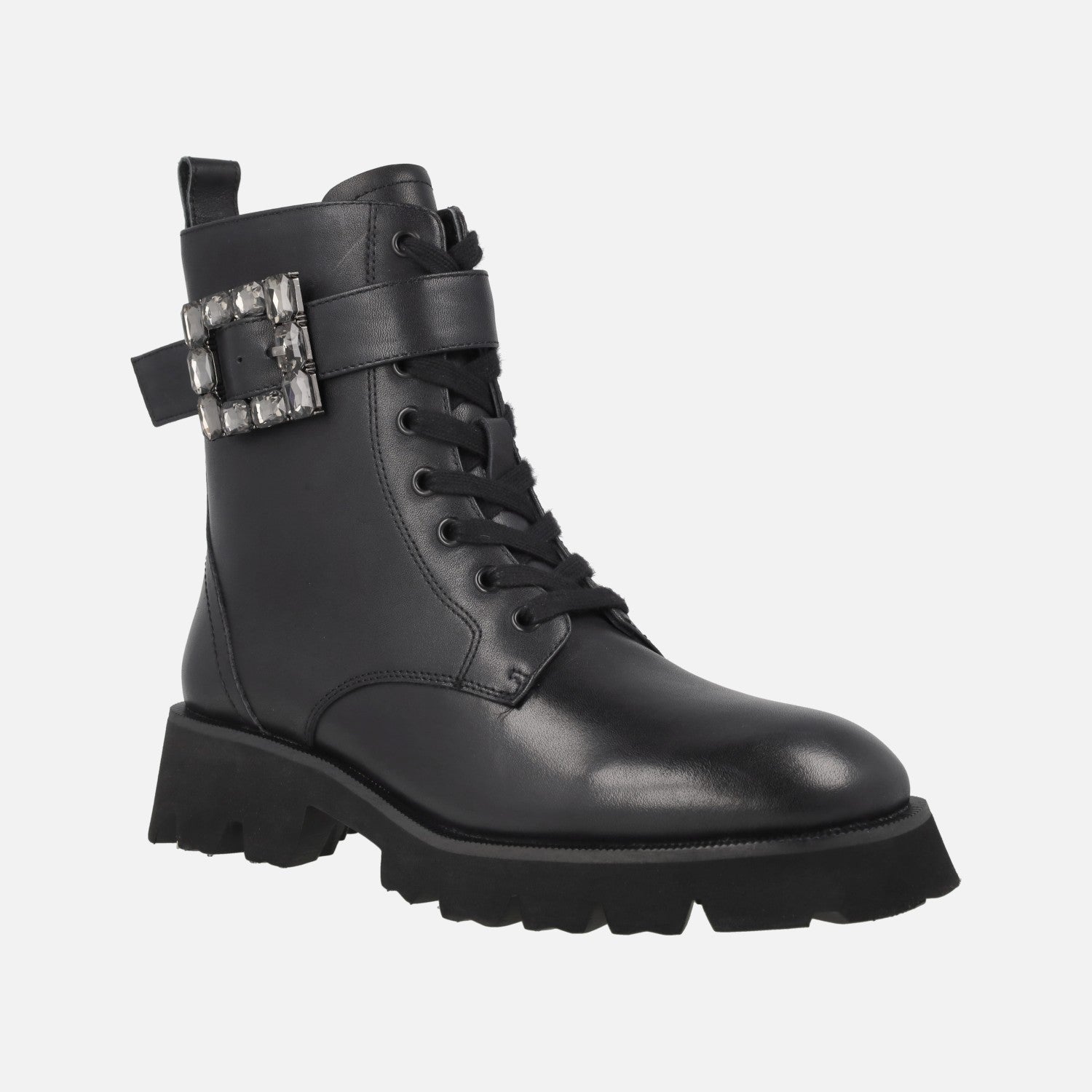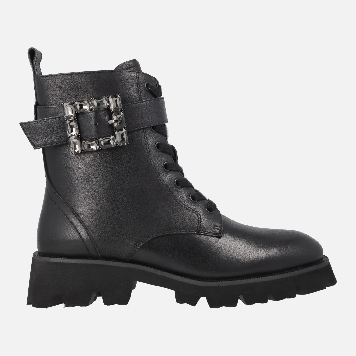 Preciosos botines para mujer de la marca Whynn modelo ELISA SHX241302117KL Negro. Botines negros de piel, con cierre de cordones en la parte frontal y además cremallera en el lado interior para calzarlo con mayor facilidad. Caña de 15 cm de altura. Hebilla joya de pedrería en el lado exterior. Interior mixto en piel y tejido. Piso sintético con 4 cm de altura trasera (2 cm plataforma delantera).