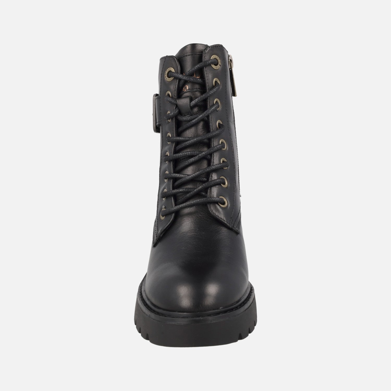 Botines de tacón para mujer de la marca Carmela shoes, modelo 162568 Negro. Botines negros de piel, con cierre de cordones en la parte delantera y cremallera en el lateral interior. Adorno de hebilla dorada. Interiores en piel y tejido, con plantillas forradas de piel. Piso track, con tacones de 6 cm (2 cm parte delantera). Caña de 14 cm.