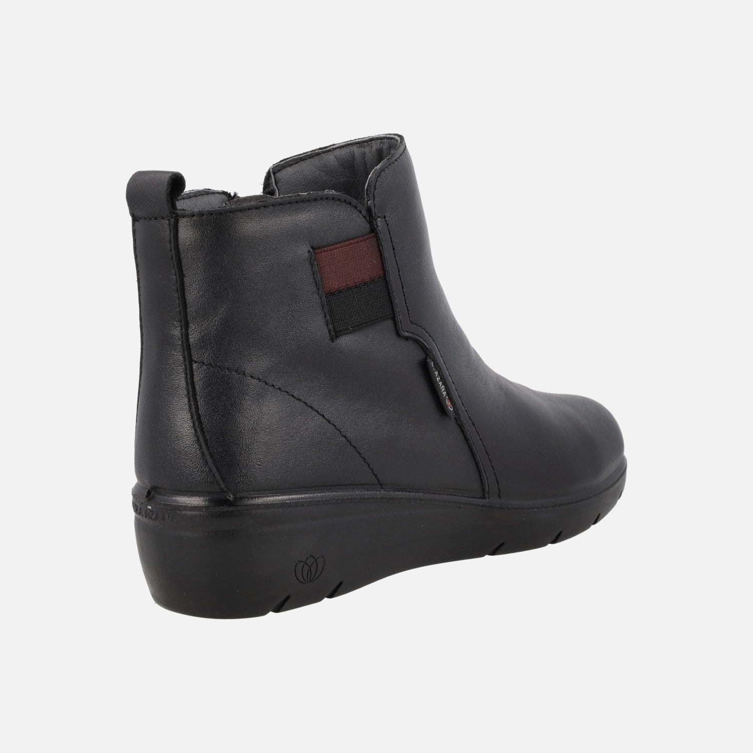 Botines confort para mujer de la marca Laura Azaña modelo LA26811NA Negro. Botines negros de piel con cierre de cremallera en el lado interior y detalle de elástico bicolor negro y burdeos en el lado exterior. Interior textil con plantillas extraíbles. Piso de goma, con 4 cm de altura trasera (2 cm parte delantera). Caña de 1 2cm de altura.