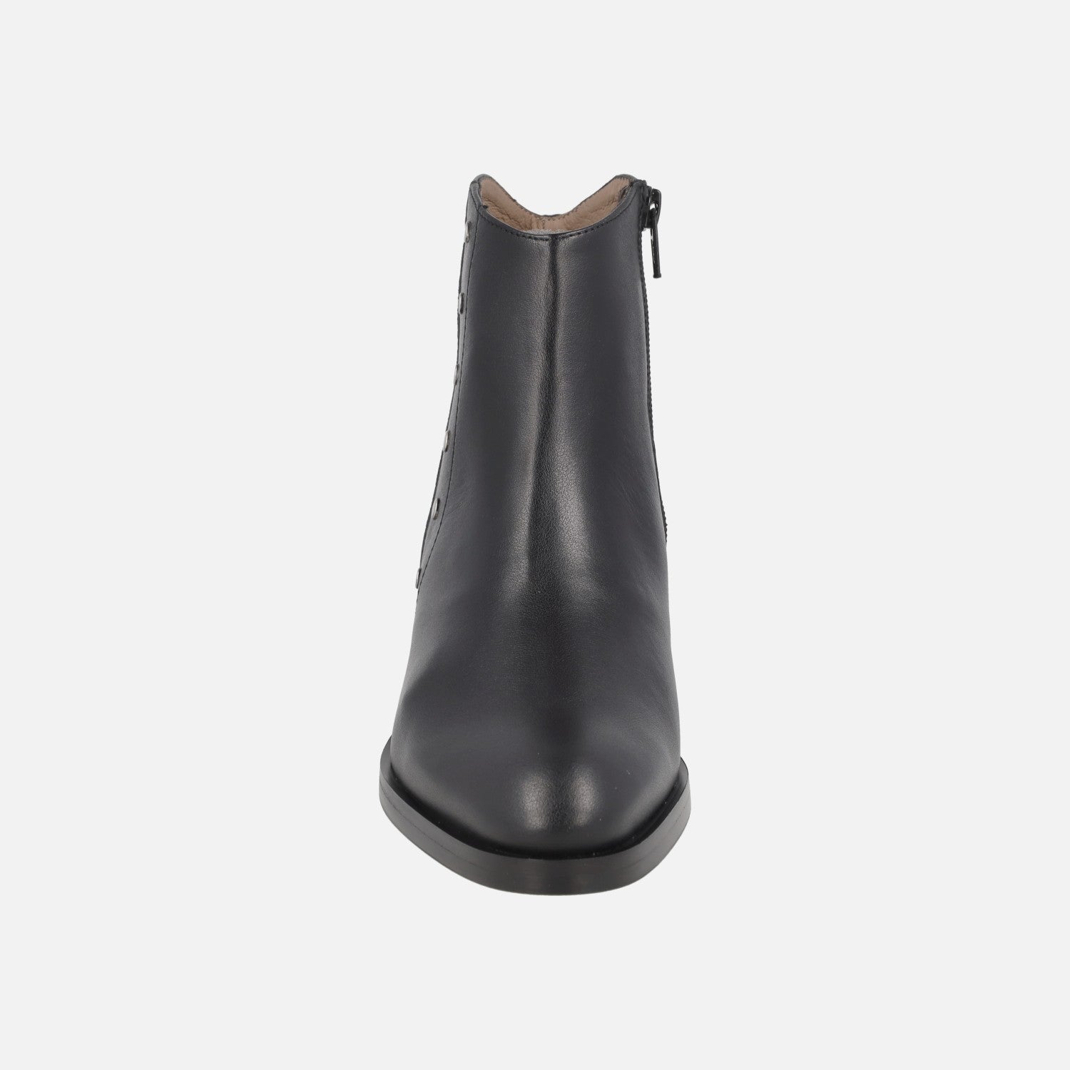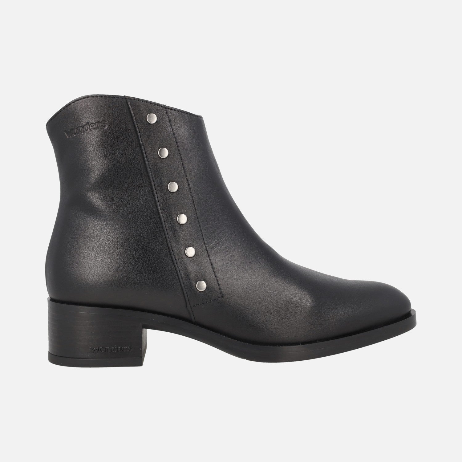 Botines de piel Wonders modelo D-1807 Isy negro. Botines negros de piel con detalle de tachas metálicas plateadas en el lado exterior. Cierre de cremallera interior. Interior mixto en piel y tejido. Piso sintético, con tacones de 4 cm de altura. Caña de 13 cm.