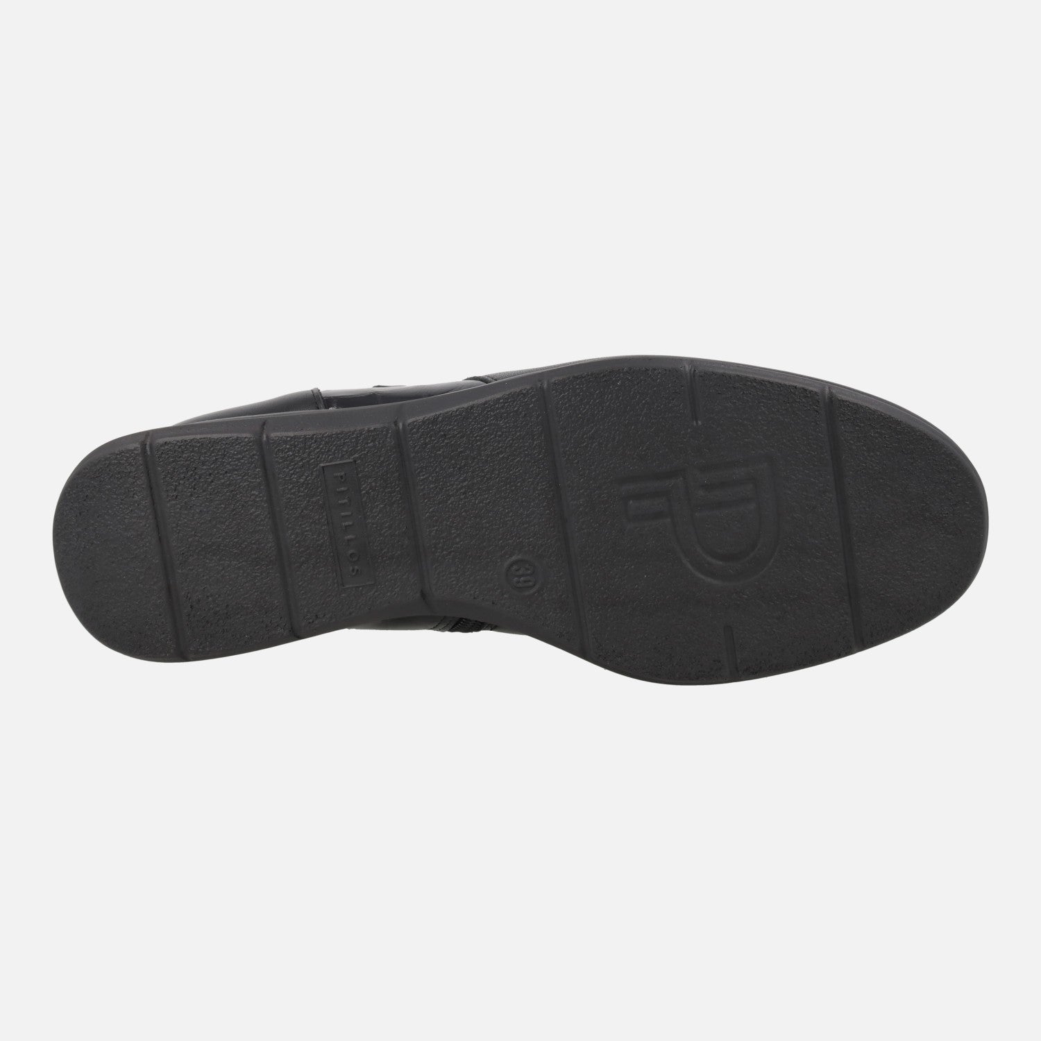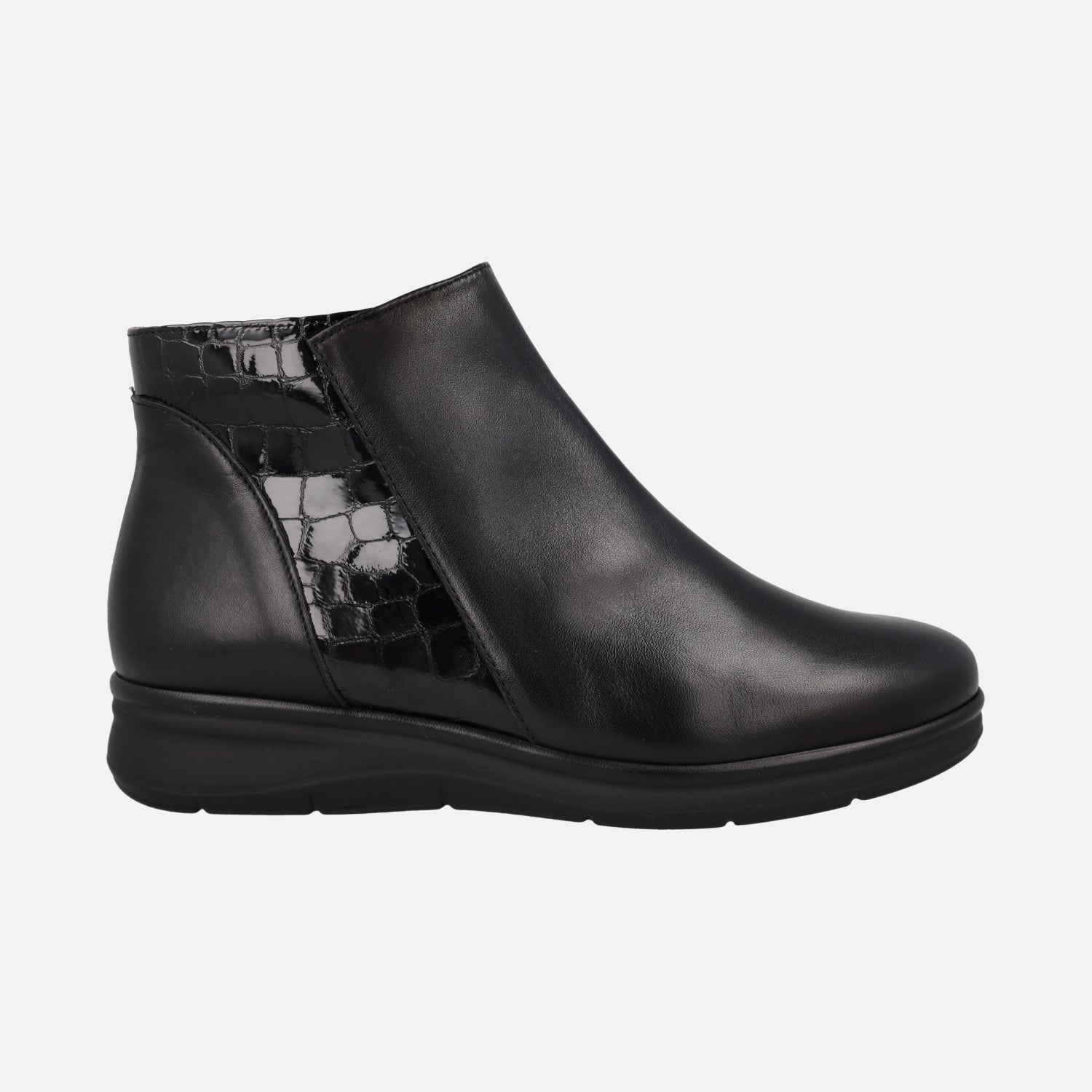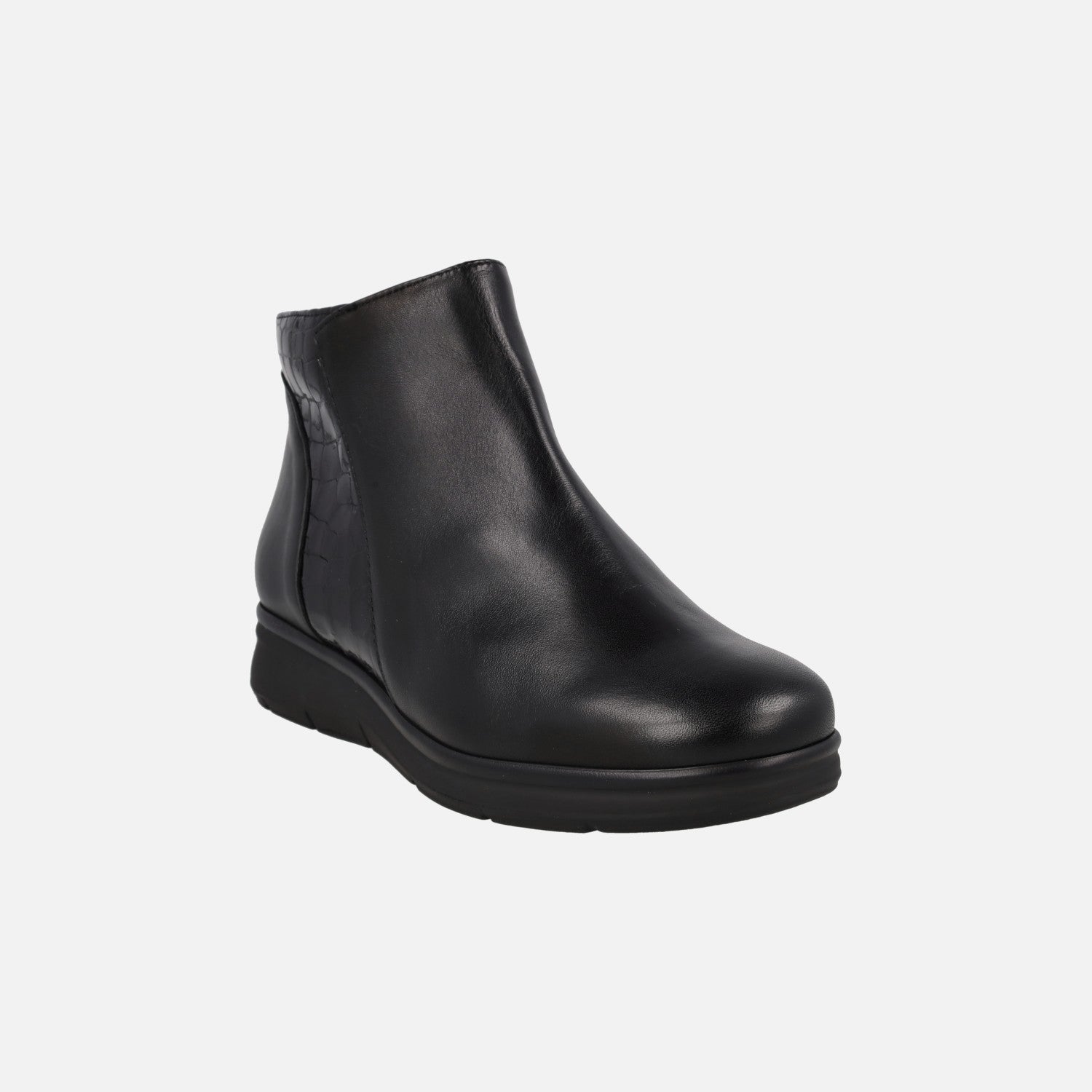 Botines negros de piel para mujer de la marca Pitillos modelo 10704 Negro. Botines confort elaborados en piel lisa negra con detalles en coco charol. Interior textil con plantillas extraíbles. Caña de 10 cm de altura. Piso sintético de 3 cm de altura trasera (1,5 cm parte delantera). Cierre de cremallera en el lado interior.