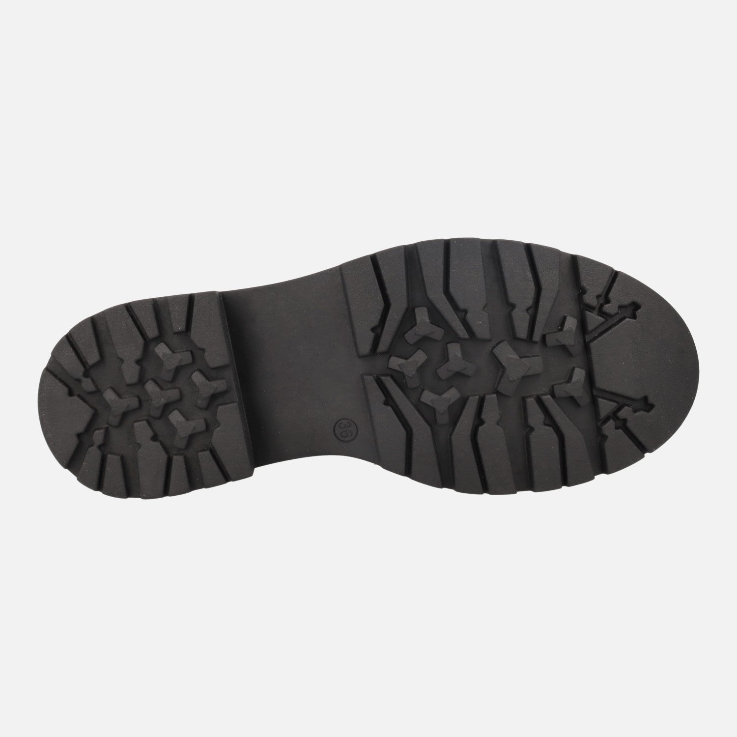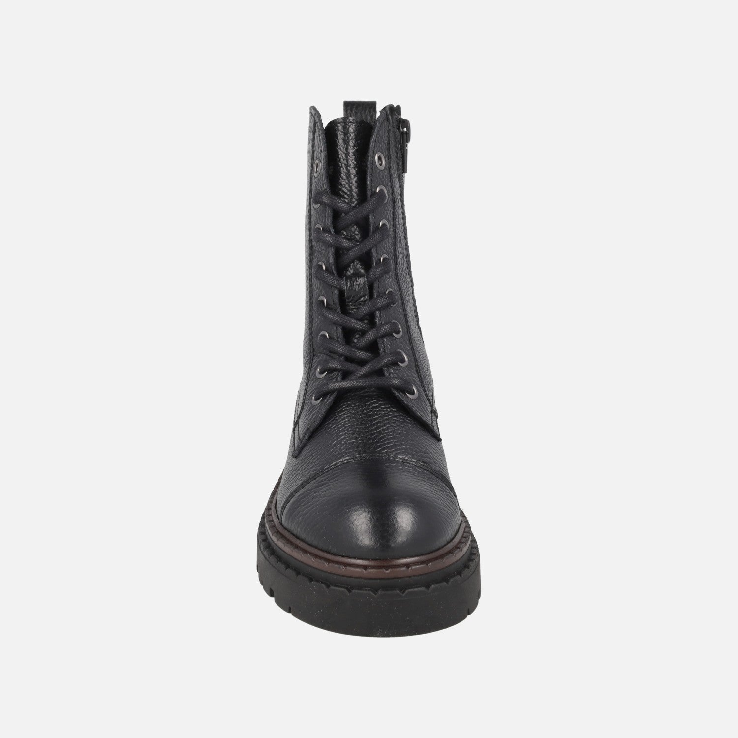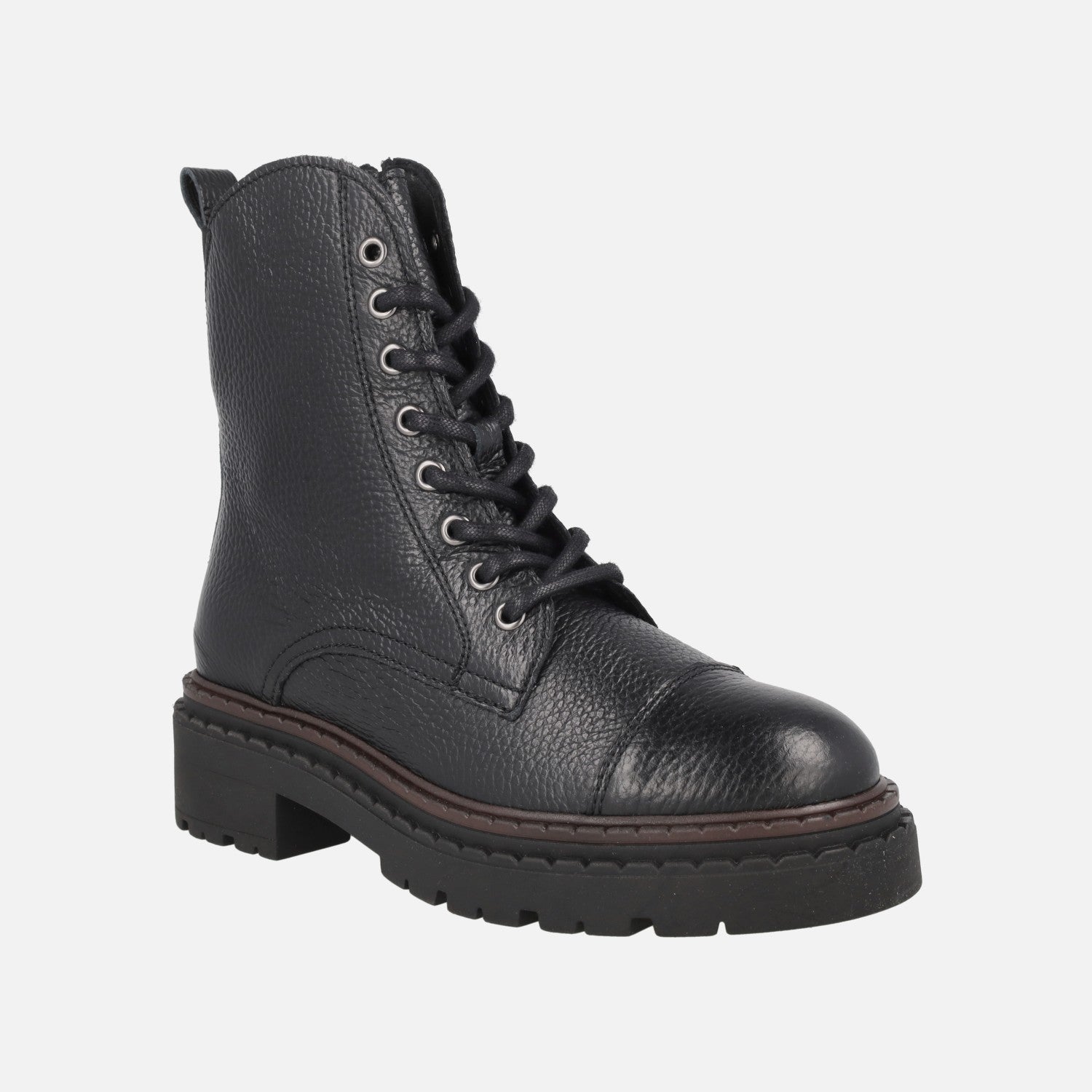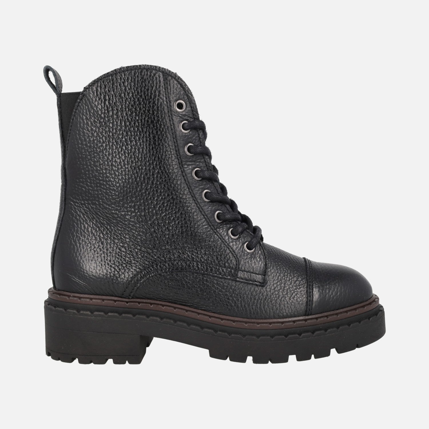 Botines negros de piel Abby 0025 Dolaro Negro, de la marca Lol shoes. Botines negros de estilo militar, elaborados en piel grabada color negro, con cierre de cordones en la parte frontal y cremallera en el lateral interior. Pieza elástica y tirador en la parte trasera. Altura de caña 14 cm. Interior mixto en piel y tejido. Piso grueso, con 4,5 cm de altura trasera (2,5 cm parte delantera).