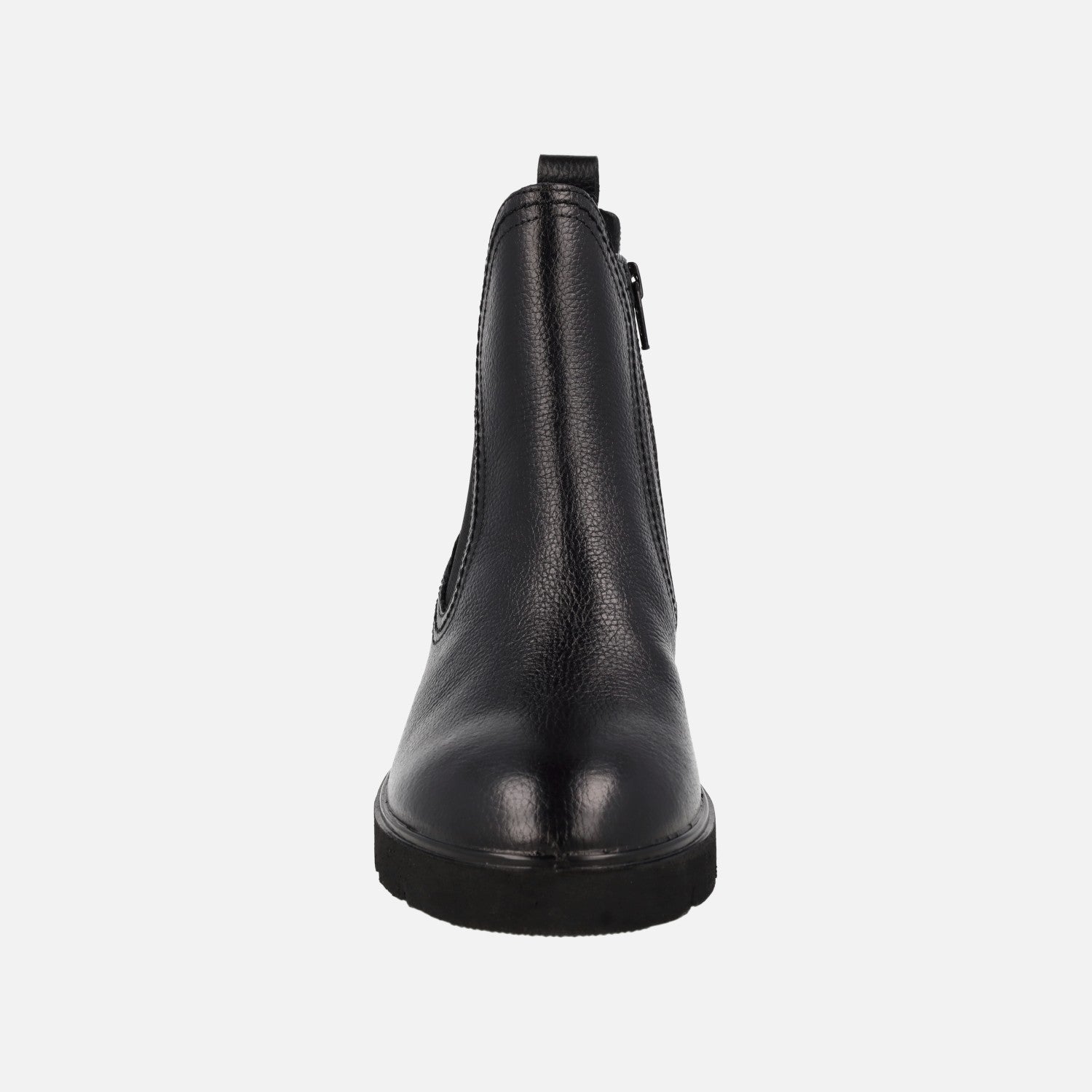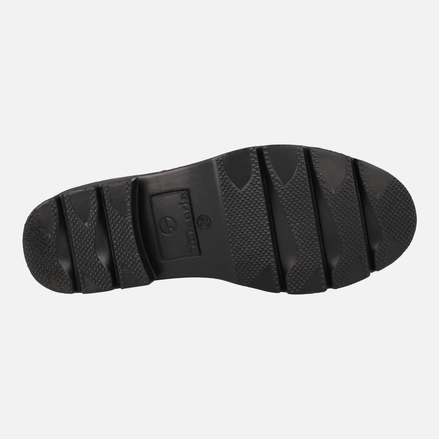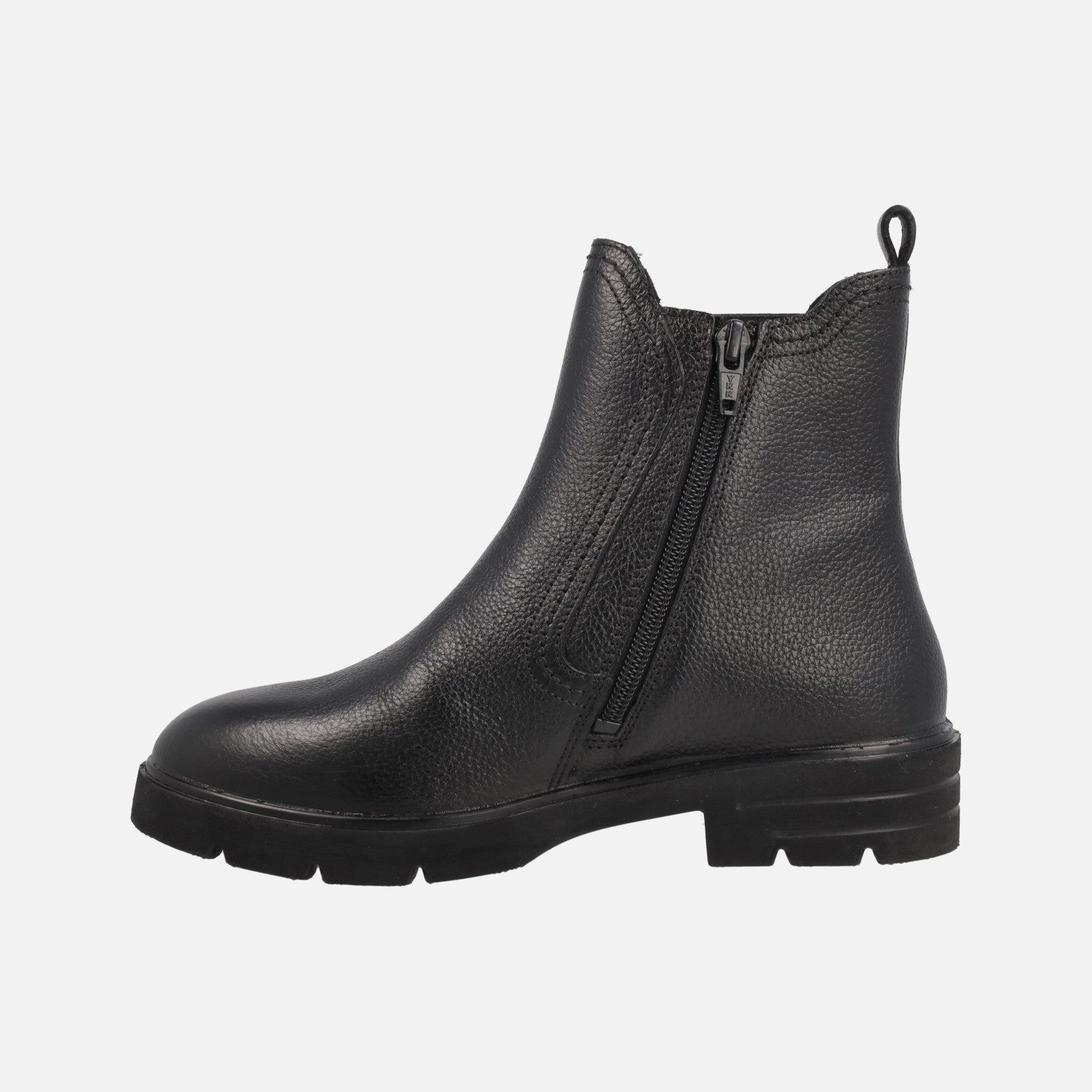 Botines para mujer inspiración chelsea de la marca Tamaris modelo 25422 Negro. Botines negros de piel con elástico en el lado exterior y cremallera en el interior. Pequeño tirador trasero en la parte superior de la caña, para ayudar en el calce. Interior en tejido (pelo) y otros materiales. Plantillas extraíbles forradas de pelo. Piso de goma, con 3,5 cm de altura trasera (2 cm parte delantera). Caña de 13,5 cm de altura.