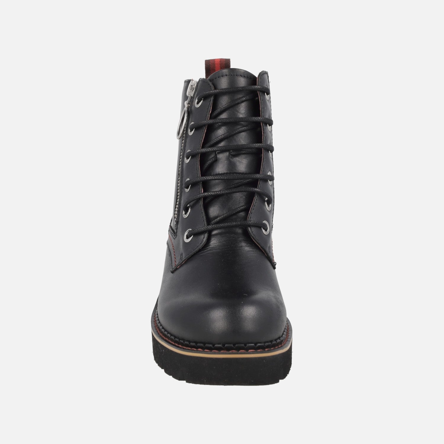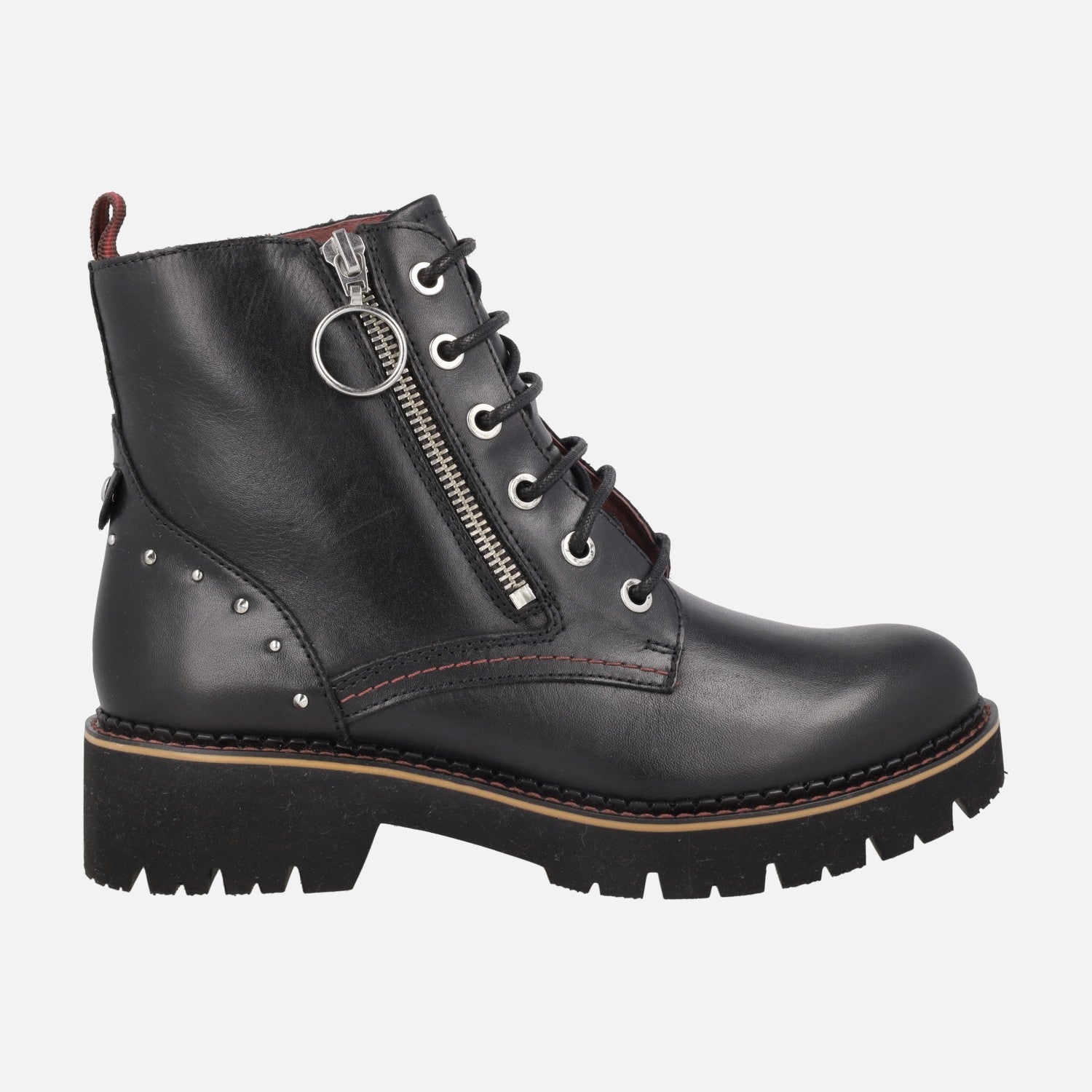 Botines negros de piel de la marca Pikolinos modelo Vicar W6S-8619. Botines negros de piel con cierre de cordones además de cremallera en el lado exterior. Detalle de tachas metálicas en la talonera. Tirador textil en la parte de atrás. Botines de piel con puntera redondeada. Interior mixto de piel y tejido.  Piso de goma extra ligero, con tacones de 4 cms de altura (plataforma delantera de 2 cms). Caña de 14 cms de altura.