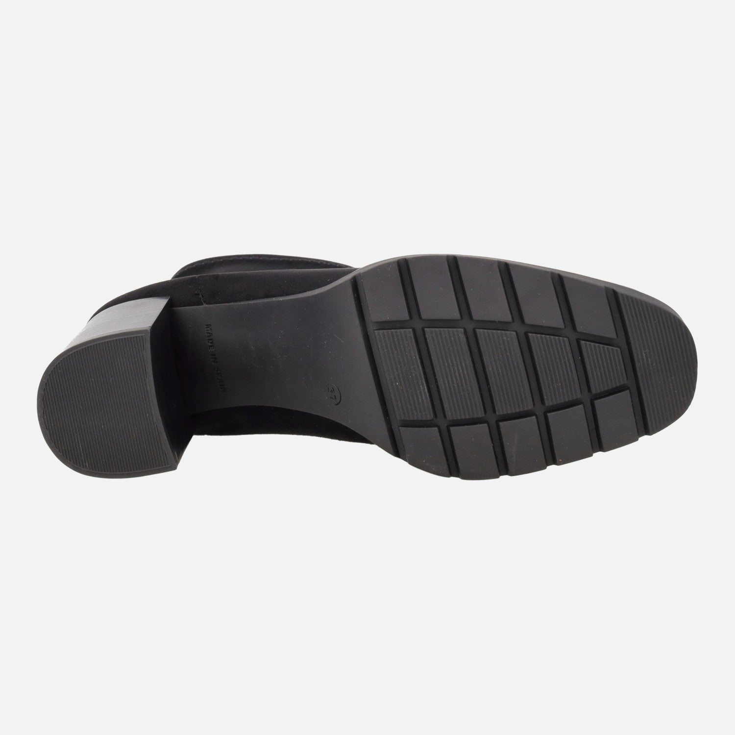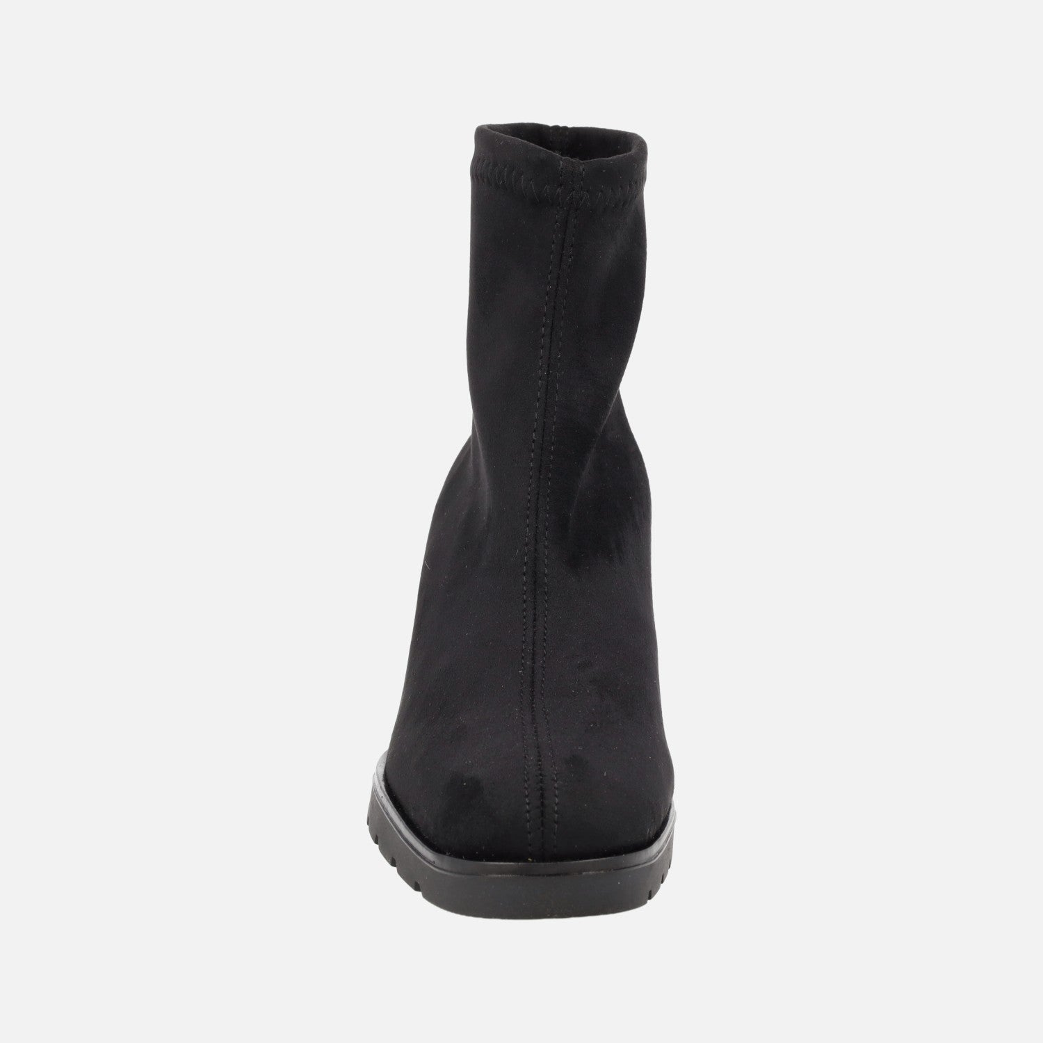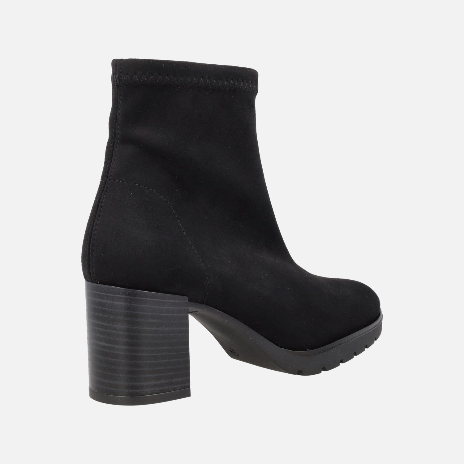 Botines negros modelo 078174-AE de la marca Miss Elastic. Botines elaborados en tejido elástico efecto ante, con tratamiento Eco dry (water repellent) para una ligera resistencia a la lluvia. Interior textil. Piso sintético, con tacones de 6,5 cm de altura (plataforma de 1,5 cm). Altura de caña aproximadamente 13 cm. Made in Spain.