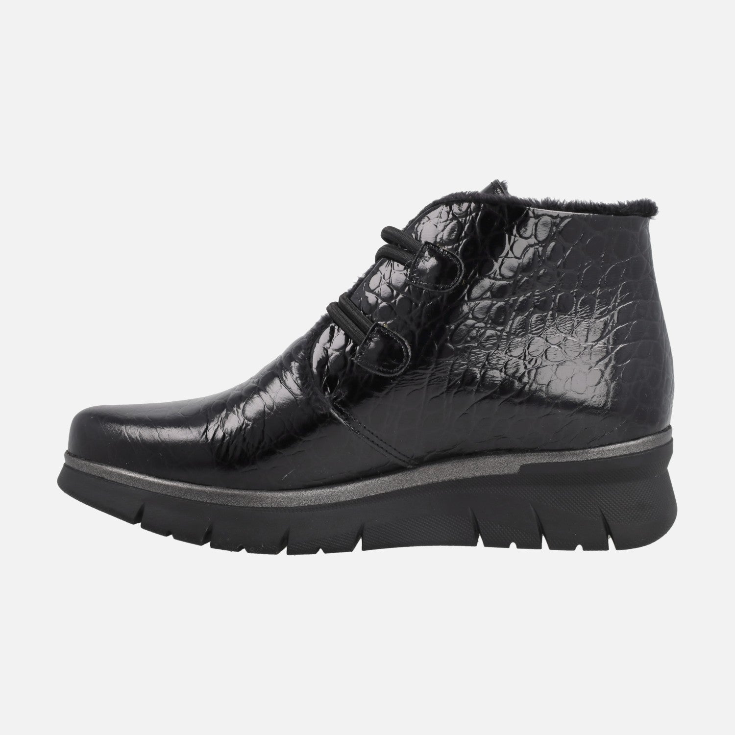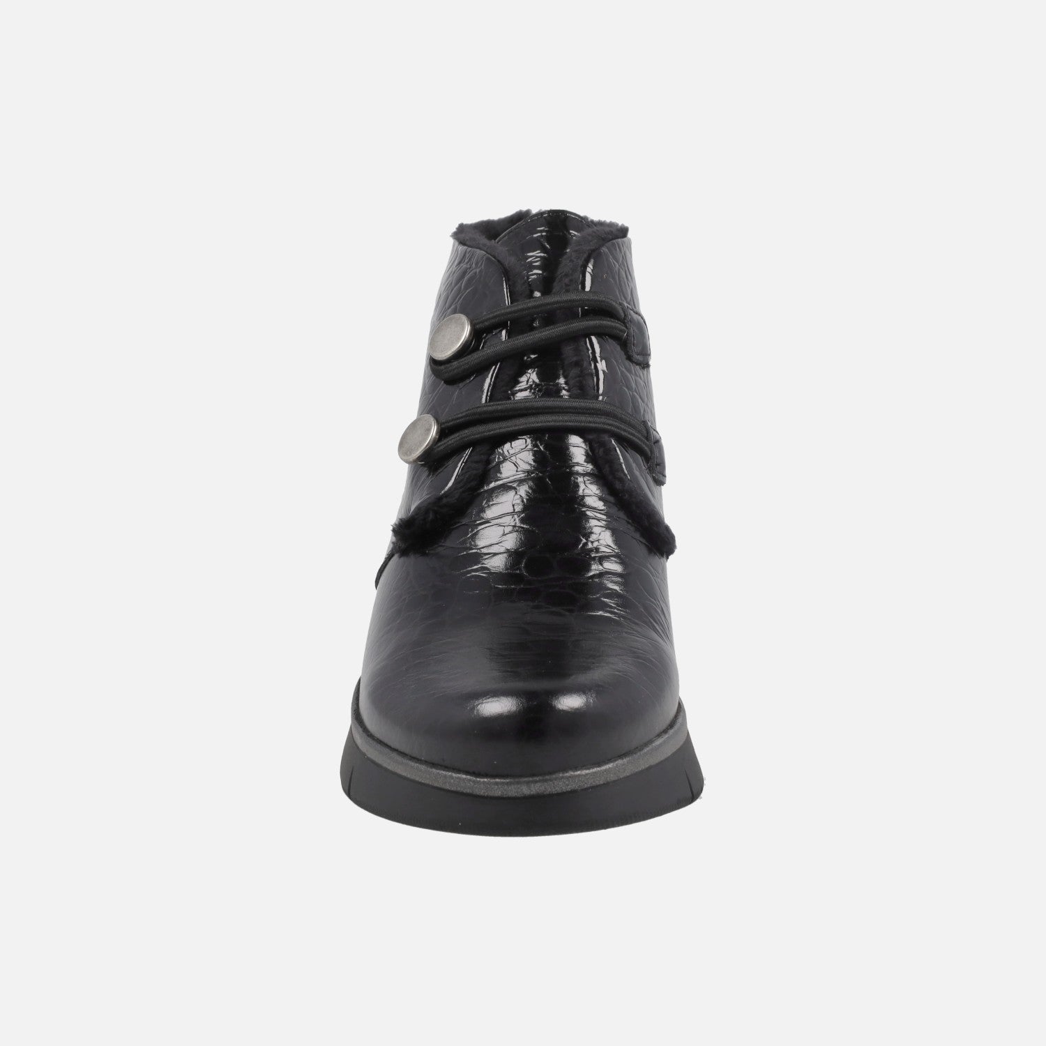 Botines negros de piel de la marca Giorda, modelo BO25660 Coco charol Negro. Botines de piel con cierre de elásticos y botones metálicos en color plata vieja. Exterior en piel charol con grabado imitando coco. Interiores forrados de pelo, muy calentitos y confortables. Plantillas forradas de piel.  Piso de goma, con 4 cms de altura trasera (2 cms parte delantera). Caña de 9 cms de altura. Made in Spain.