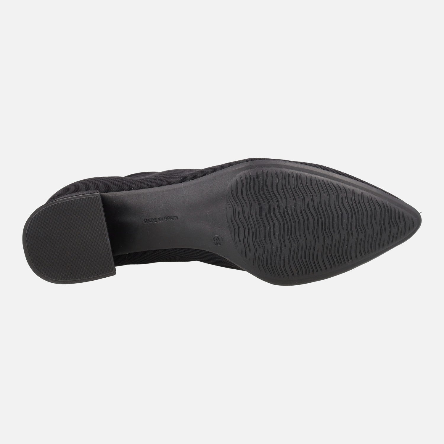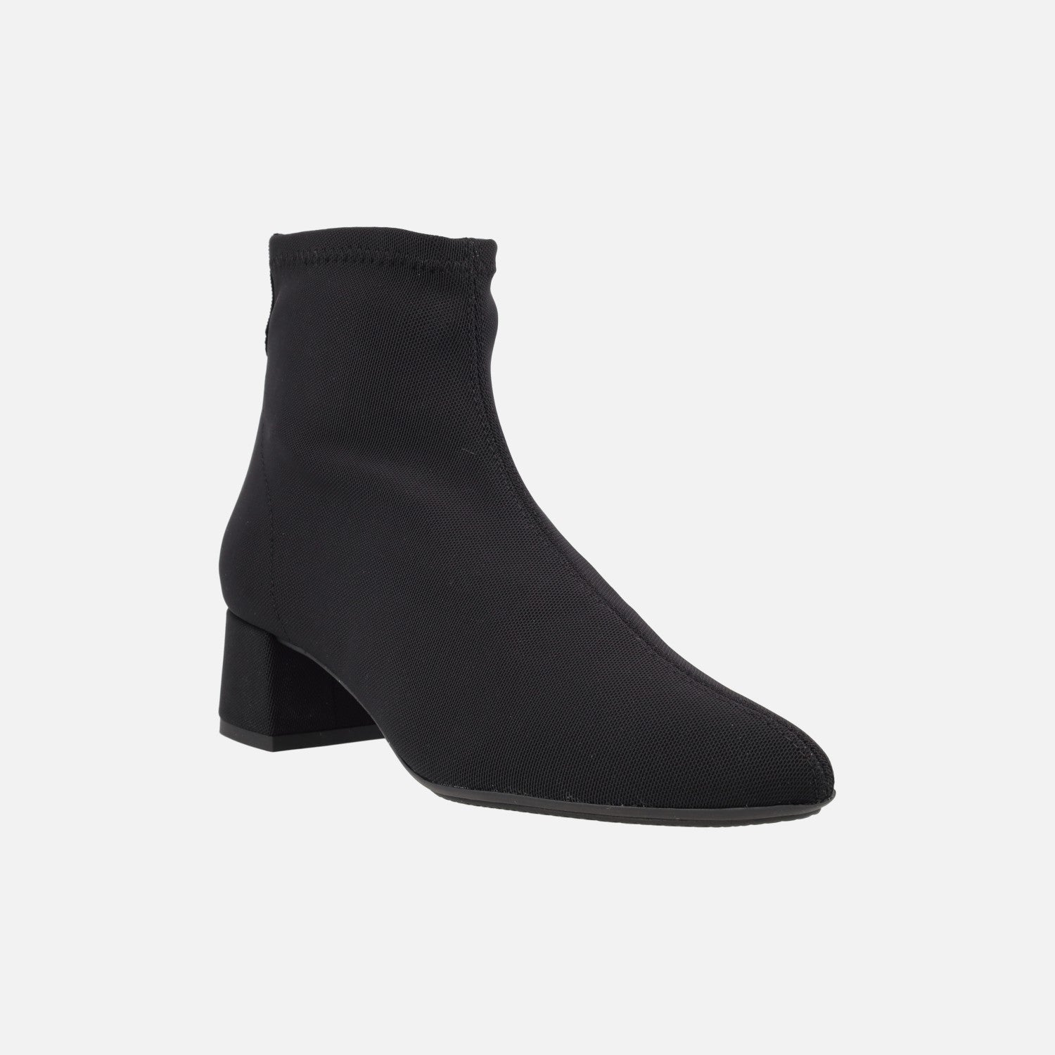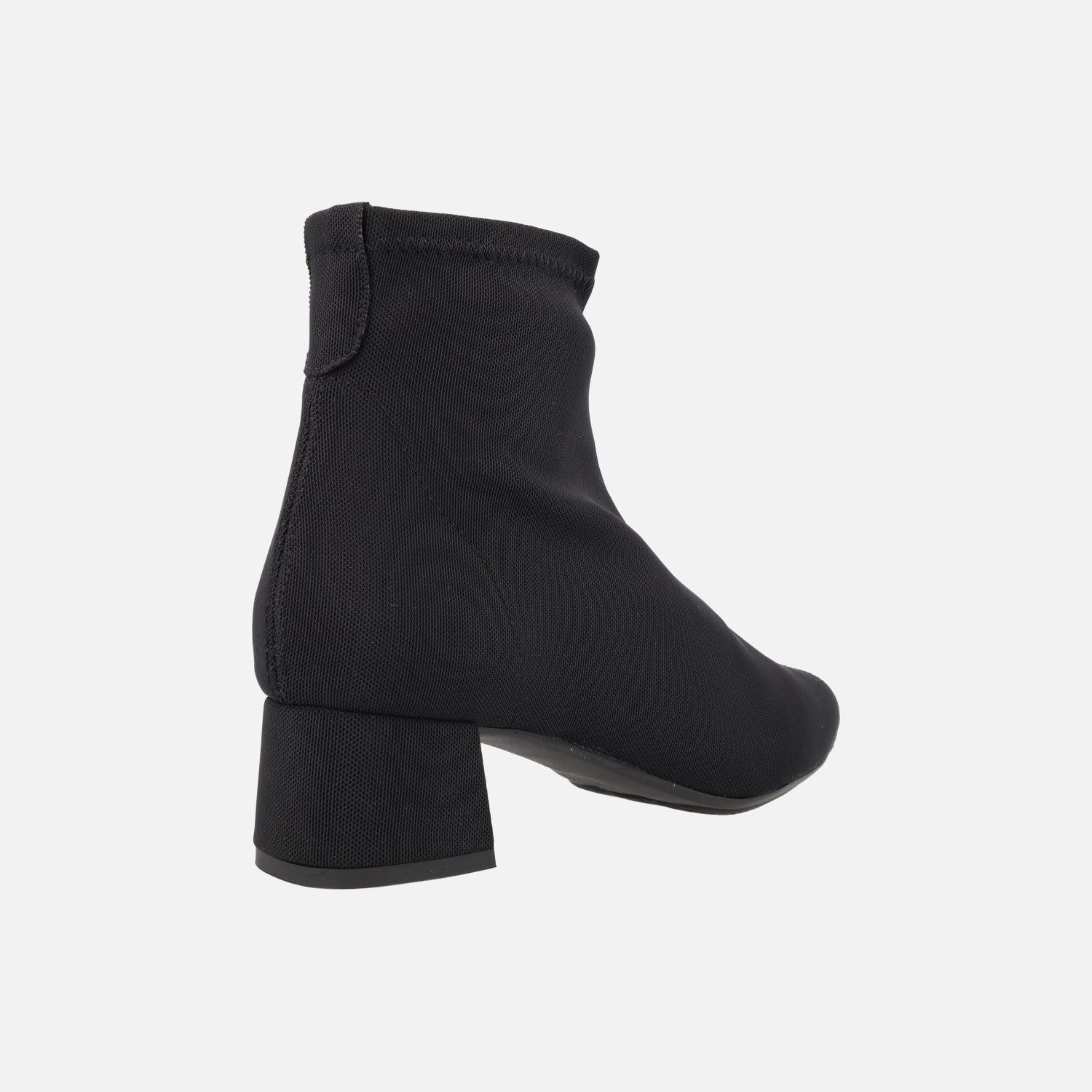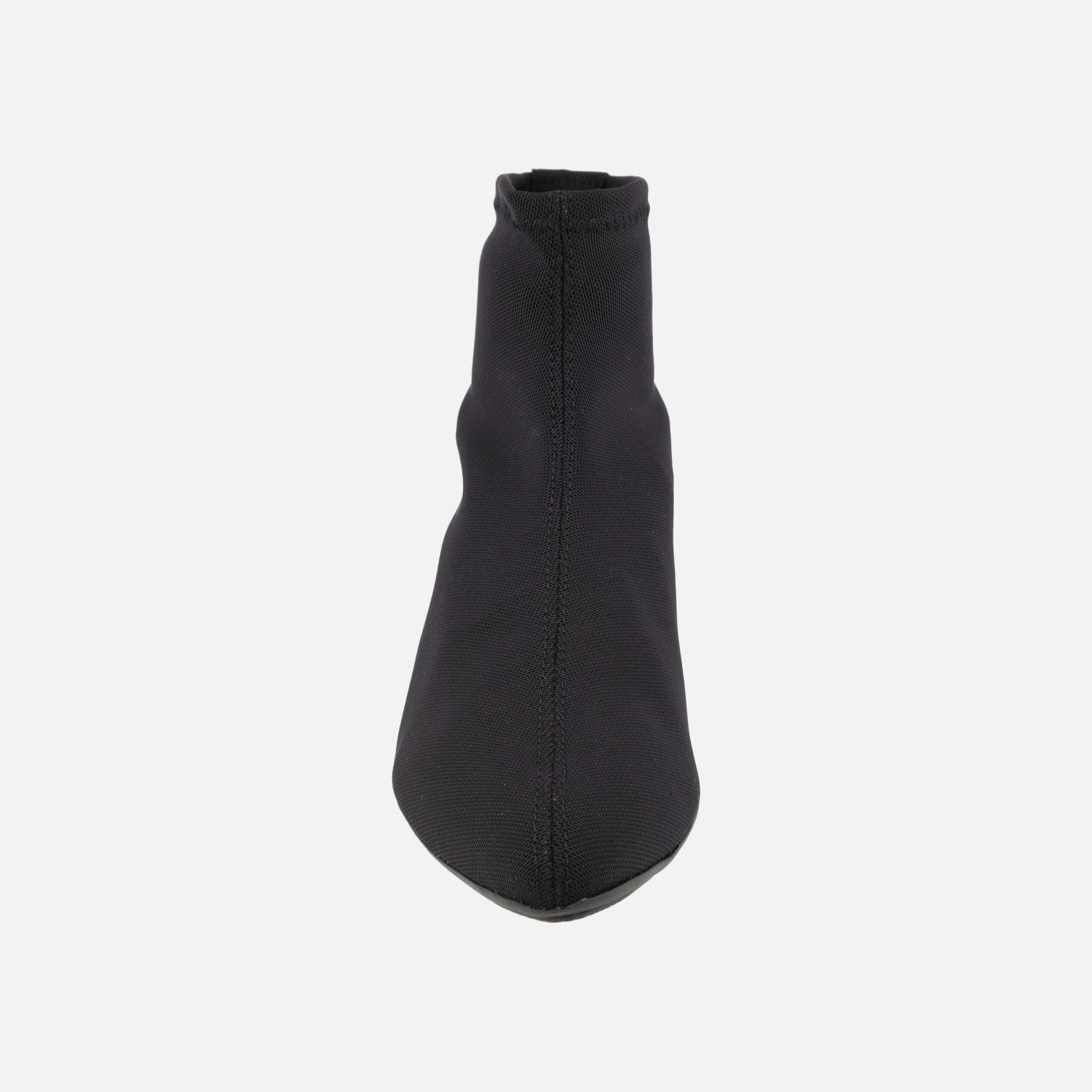 Botines negros de la marca Barminton, modelo 10030. Botines elaborados en tejido elástico negro, sin cremallera, estilo calcetín. Interiores forrados en tejido y piel. Suela sintética. Caña de 13 cm de altura. Tacones anchos y bajos, de aproximadamente 4,5 cm de altura. Made in Spain.