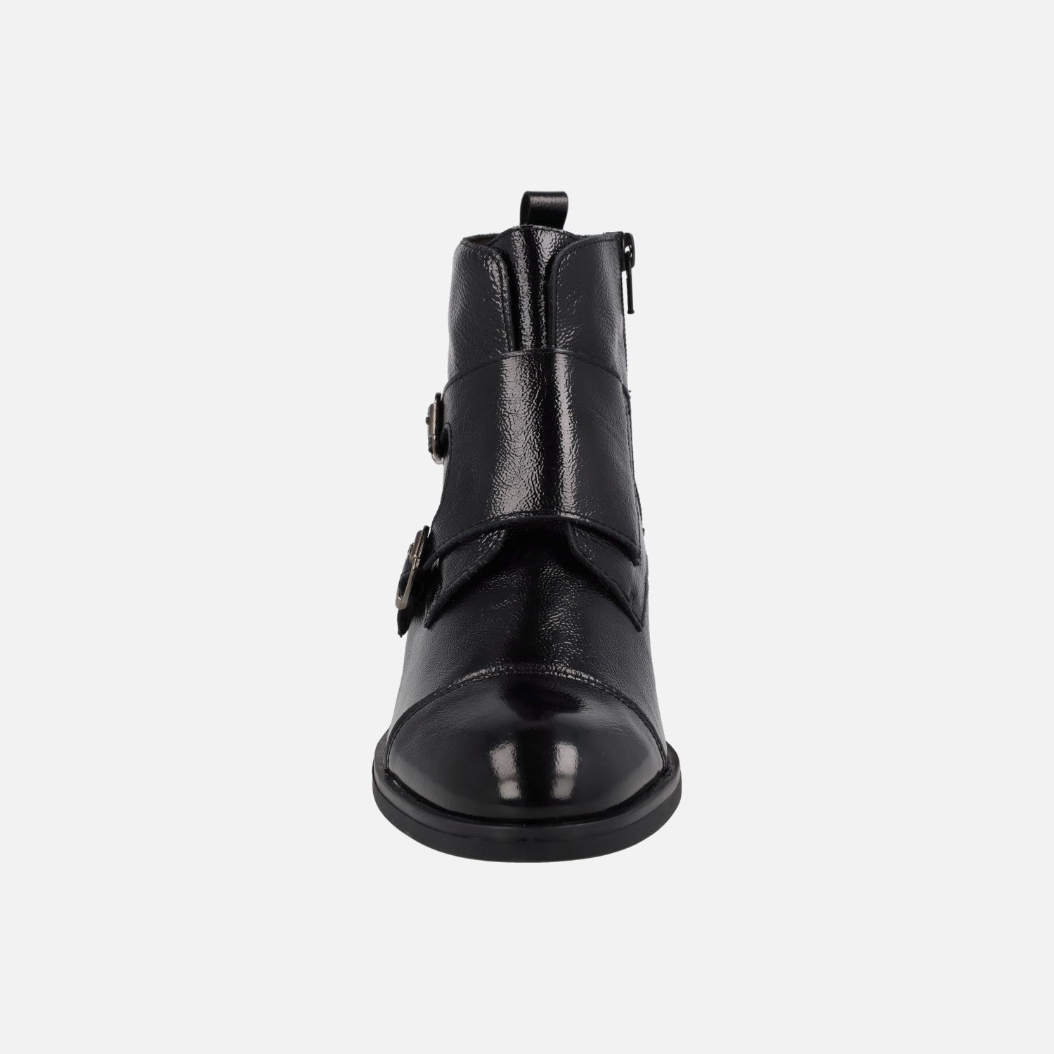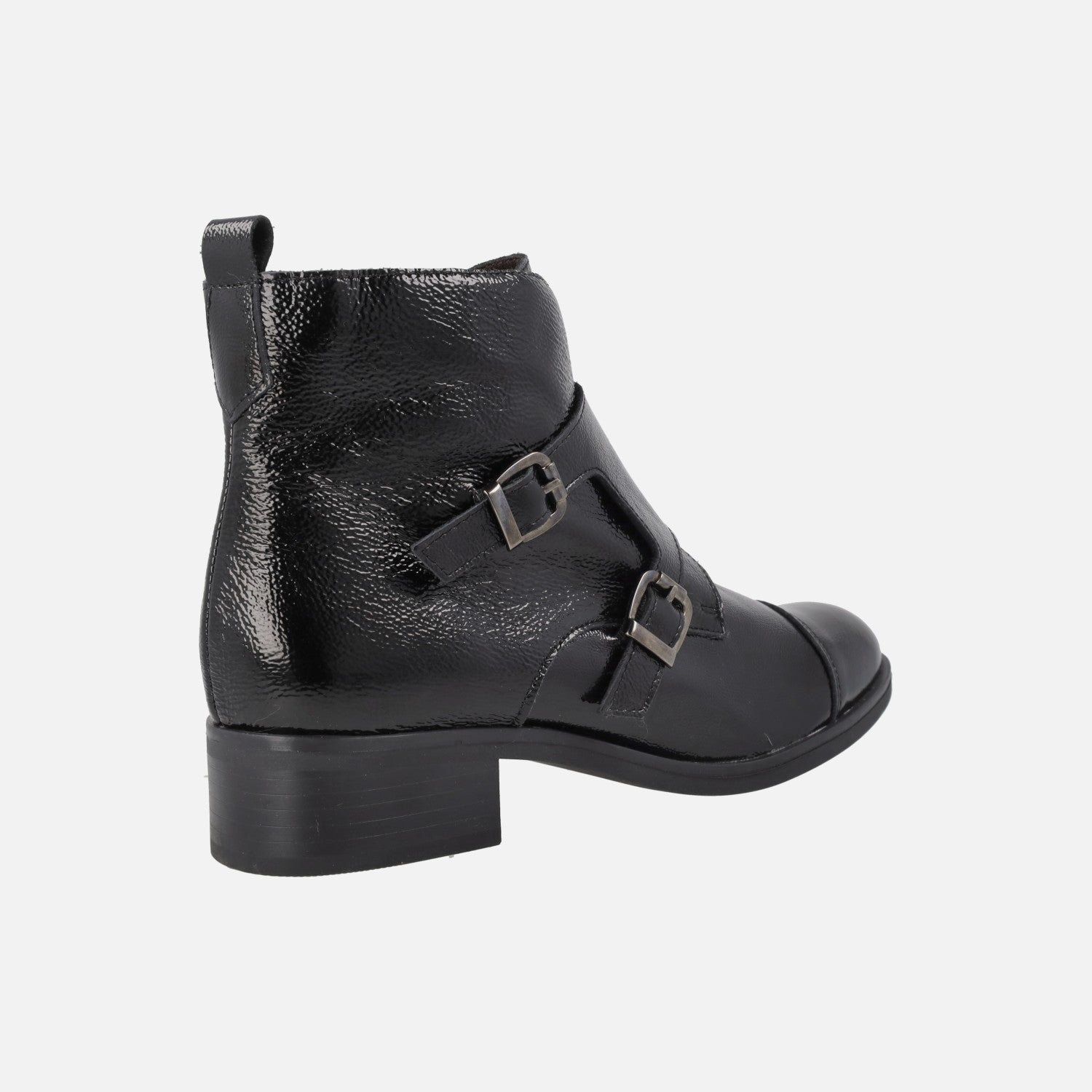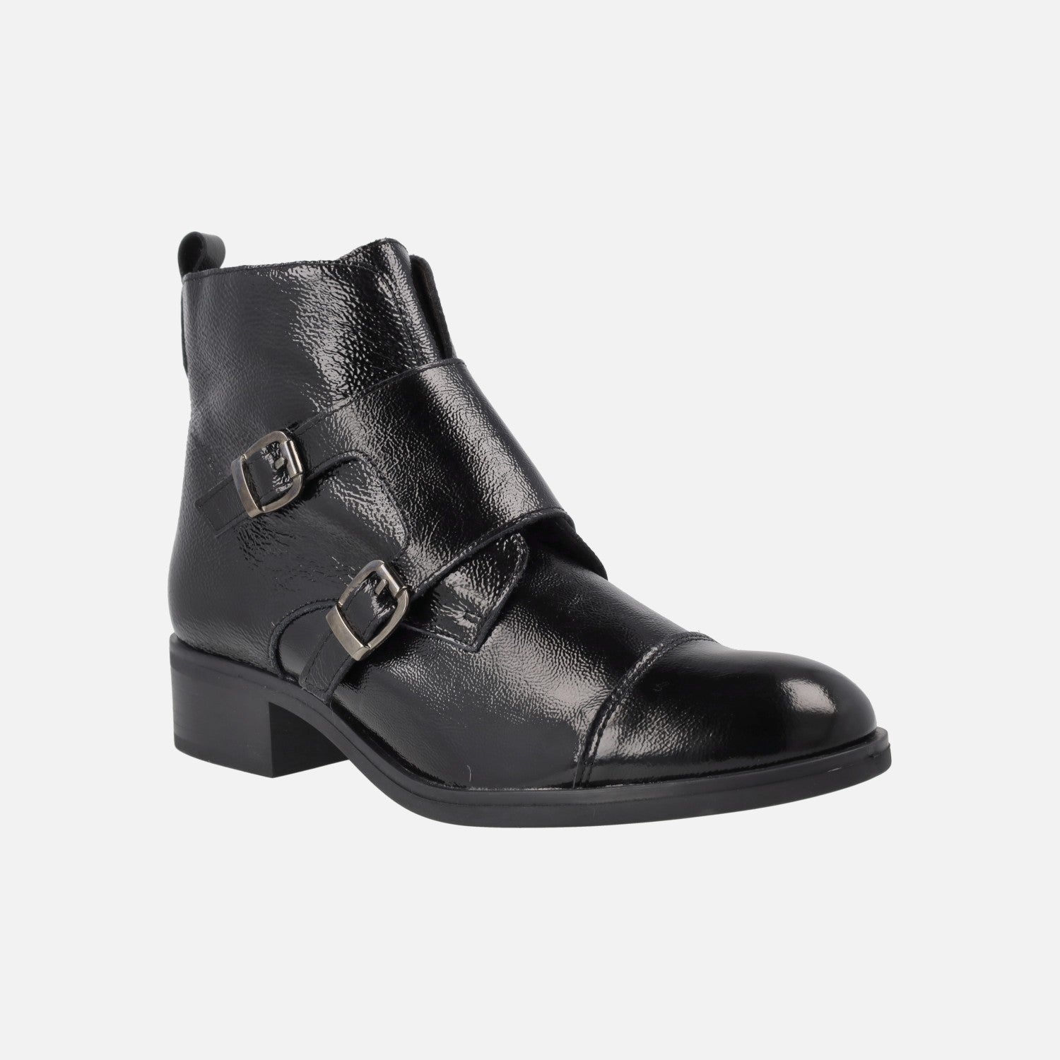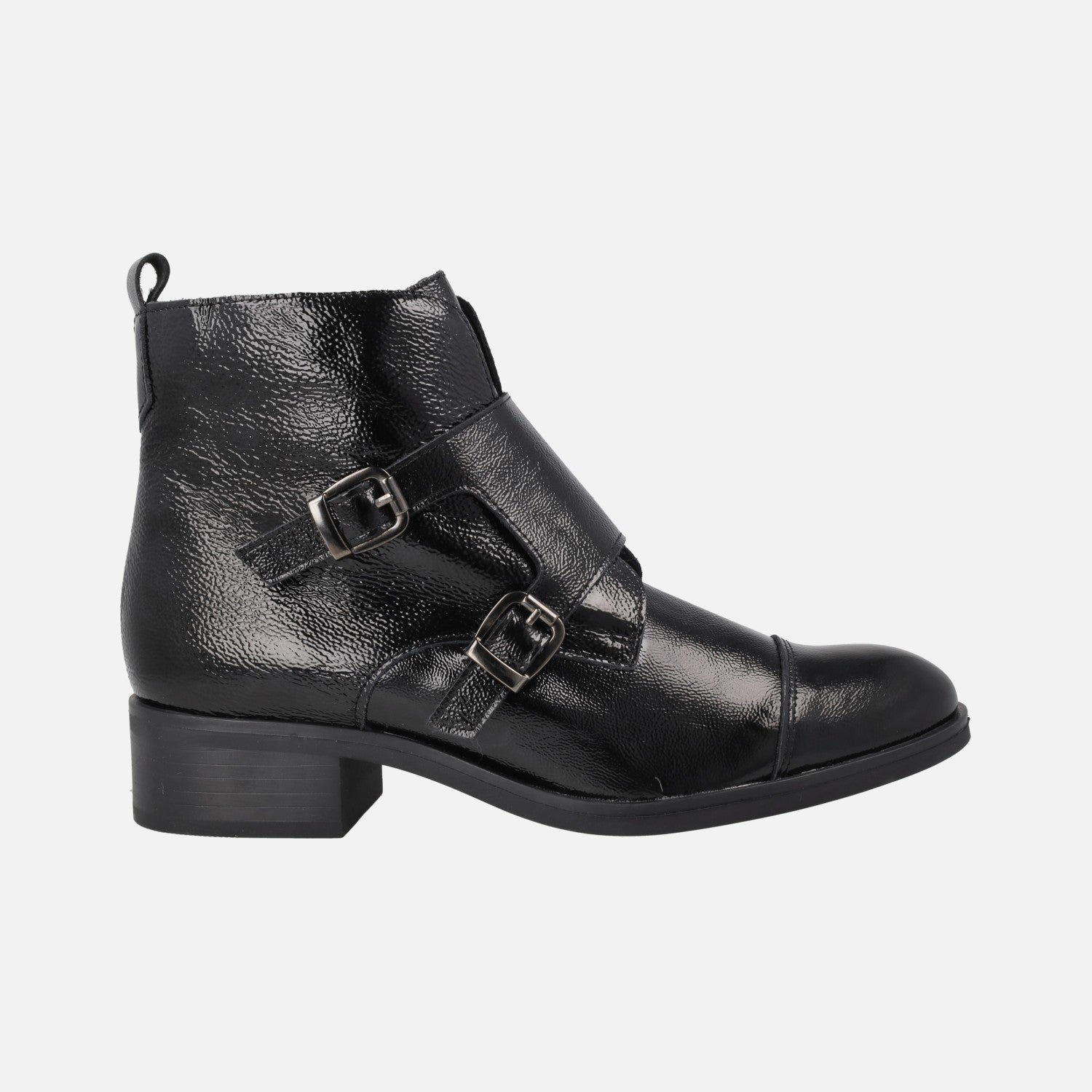 Botines negros de charol para mujer con dos hebillas