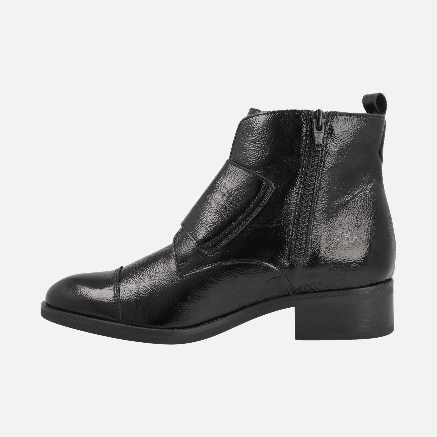 Botines modelo 36006 en charol negro de la marca española Funchal. Lleva una abrazadera con dos hebillas en plata envejecida en la parte exterior. Tiene cremallera en la parte interna para mejorar el calce. Forro y plantillas textiles . Piso de goma, con tacón de 4 cm. y una altura de caña de 12 cm.