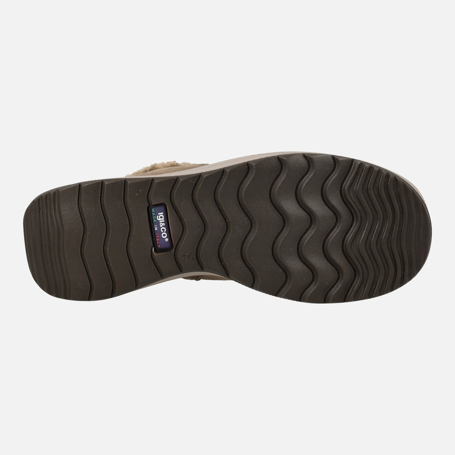 Nuevos botines para mujer con membrana Gore tex de la marca IGI&CO. modelo 86814 Fango. Botines elaborados en serraje color taupe, con cierre de cremallera en el lado interior. Forro y planta en pelo cálido. Membrana interior impermeable. Plantillas extraíbles. Piso sintético con 5 cm de altura trasera (3,5 cm plataforma delantera). Caña de 11,5 cm.