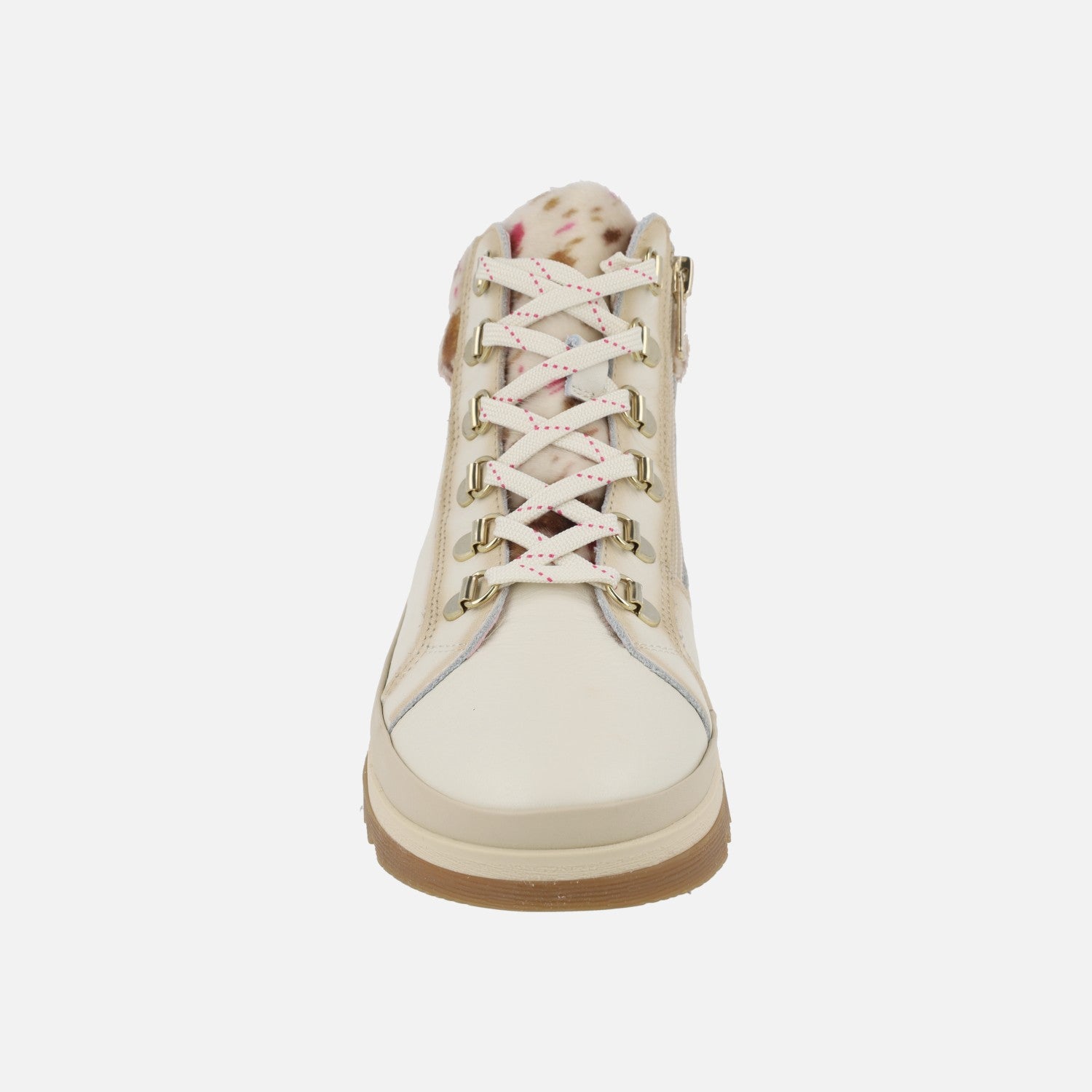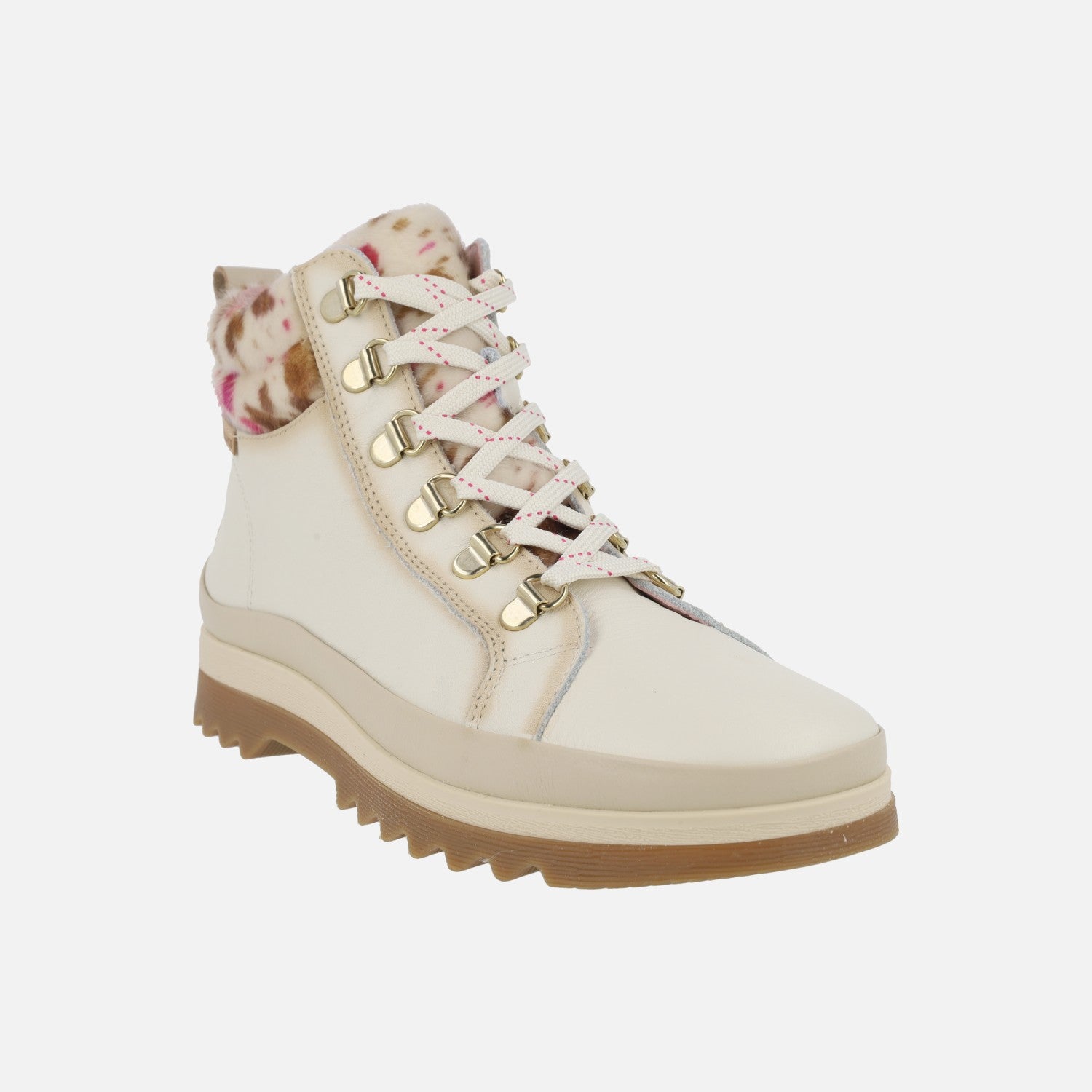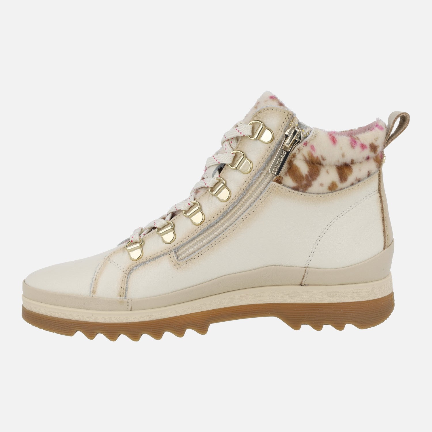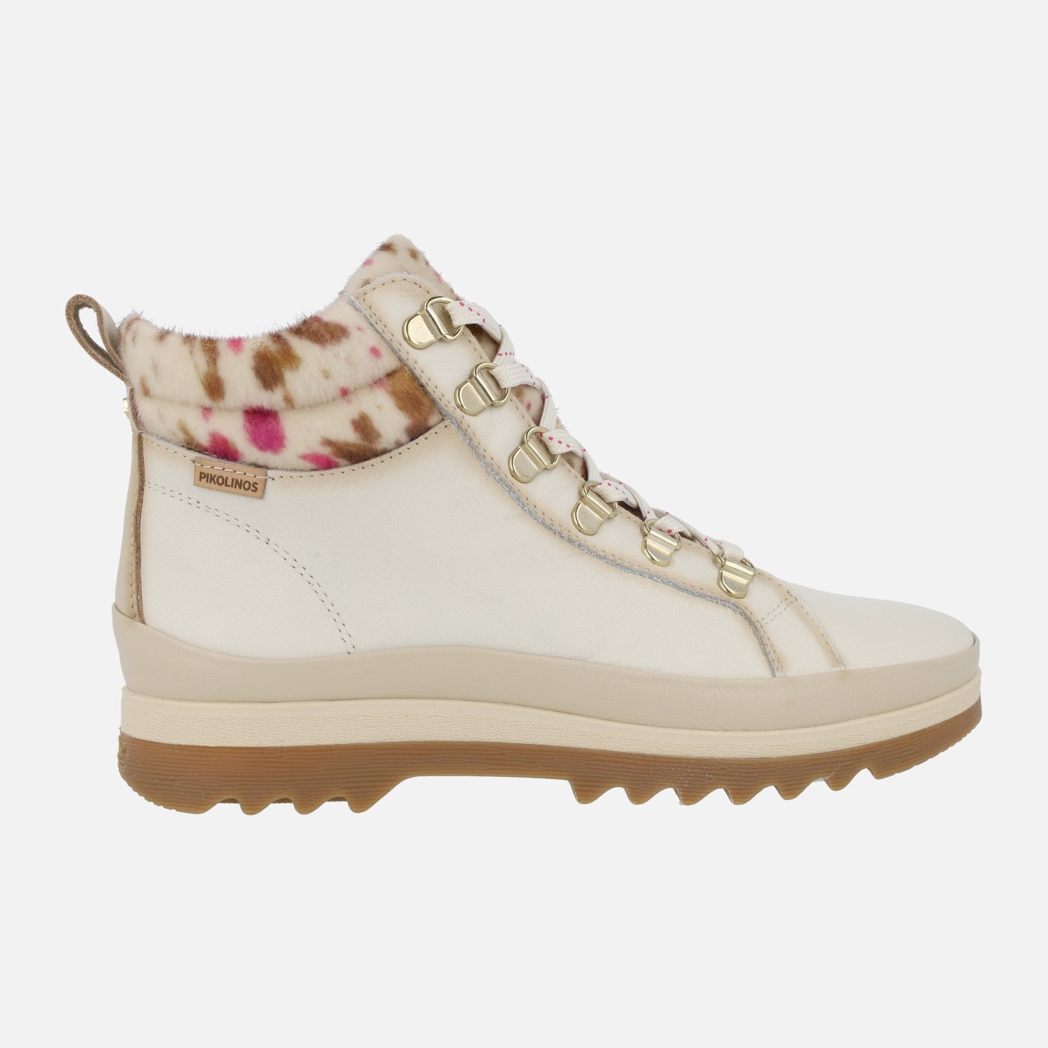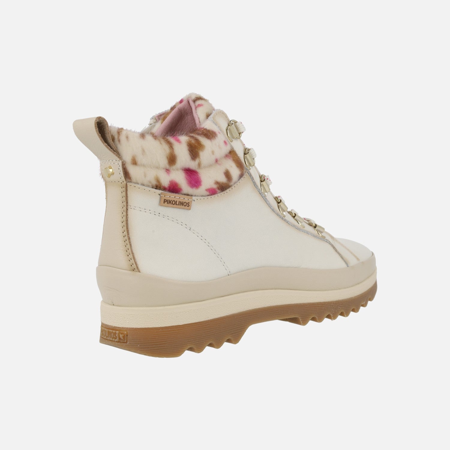Botines de cordones para mujer de la marca Pikolinos modelo Vigo W3W-8765C1 Nata, modelo RESILENCIA de la nueva colección de Pikolinos en colaboración con la Vecina Rubia. Botines de piel color nata con cierre de cordones y cremallera lateral. Cuello y lengüeta en print vaca combinado con detalles rosas. Interior textil con plantillas extraíbles. Piso sintético, con 3 cm de altura trasera (2 cm parte delantera). Caña de aproximadamente 10 cm de altura.