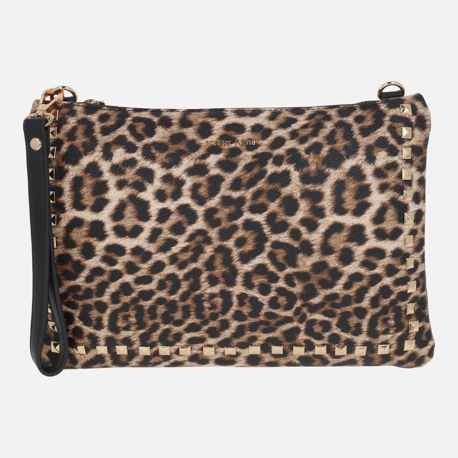 Carteras en estampado leopardo de la marca Robert pietri, modelo 00024 Leopardo. Cartera elaborada en materiales sintéticos animal print con detalles en negro. Detalle de tachas metálicas doradas. Cierre principal con cremallera. Bolsillo trasero con cremallera. Interior textil con bolsillos. Asa para llevar a la muñeca y además asa bandolera, extraíble y ajustable. Medidas: 18,5 cm de alto x 28 cm de ancho x 2 cm de fondo.