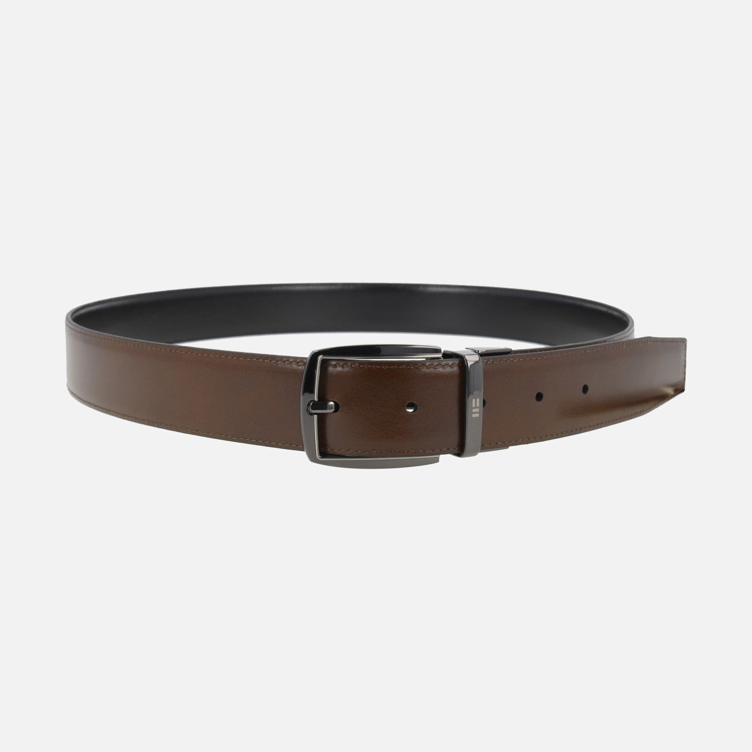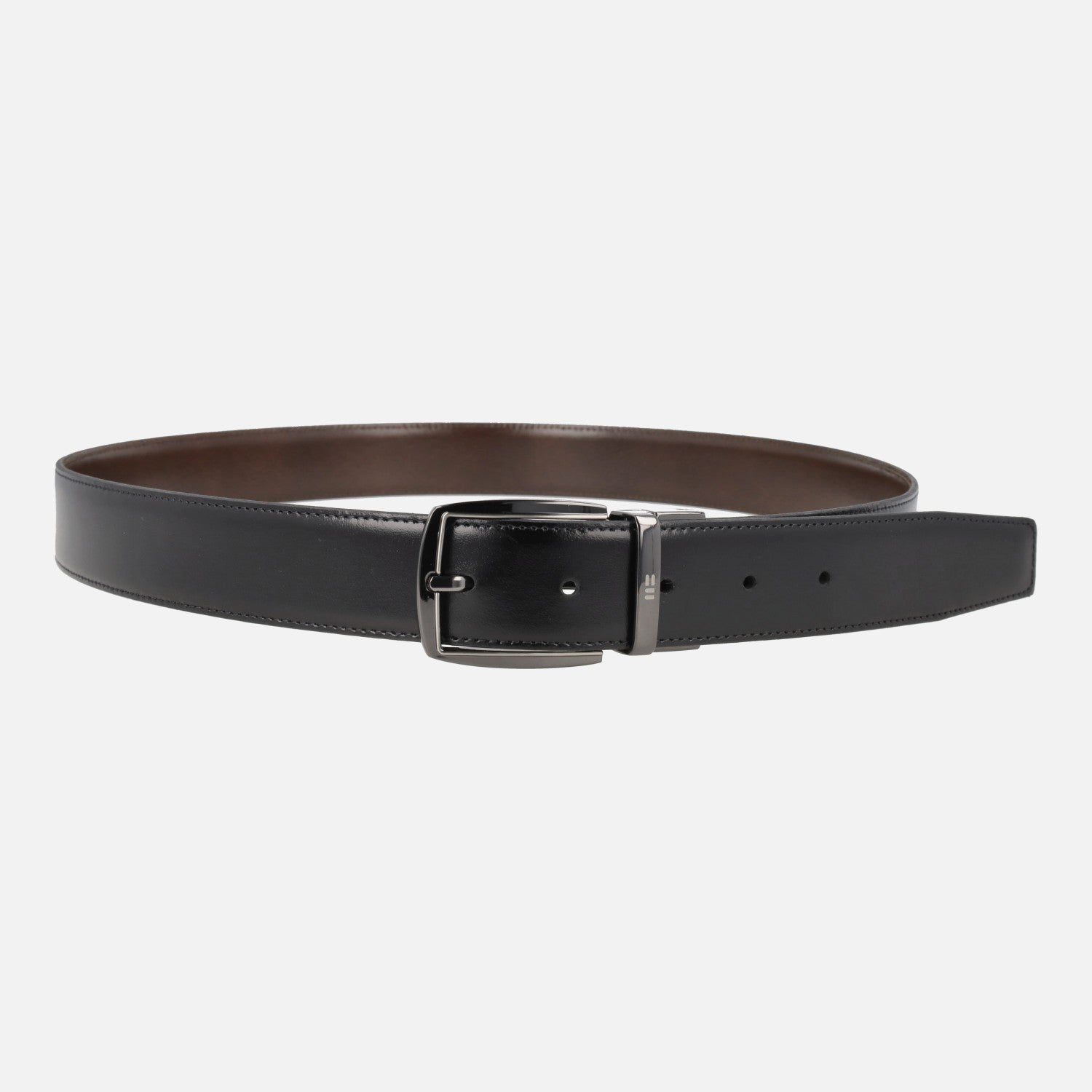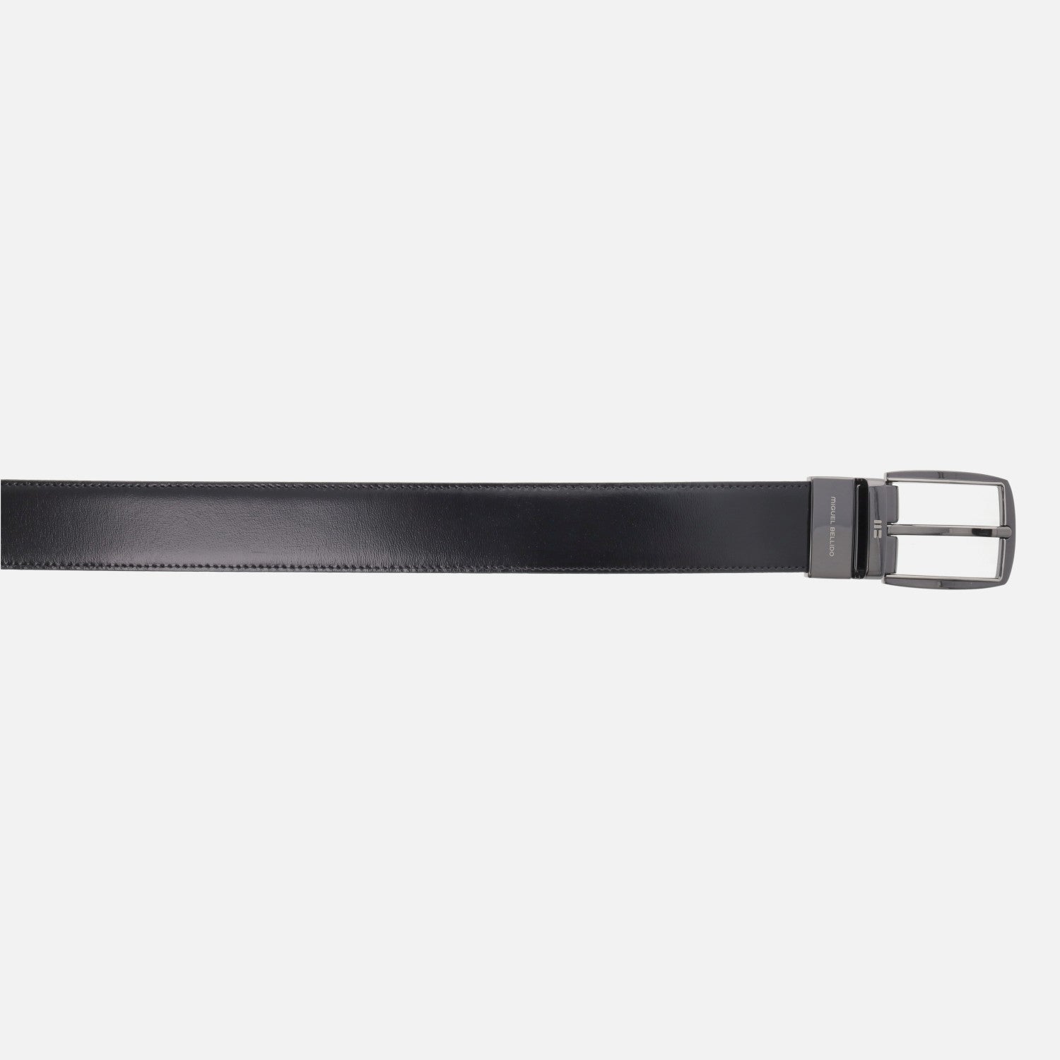 Cinturones de piel para hombre de la marca Miguel Bellido modelo 430-32. Cinturones reversibles de piel que combinan negro y marrón. Hebilla metálica. Hechos en España