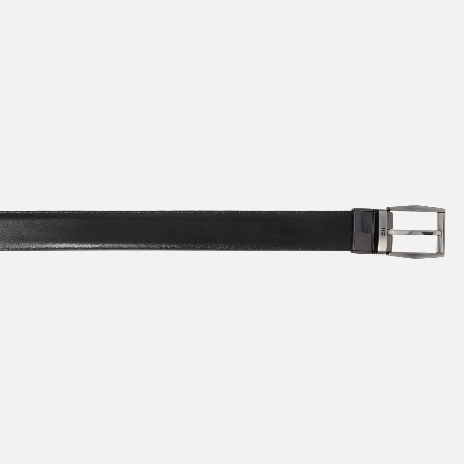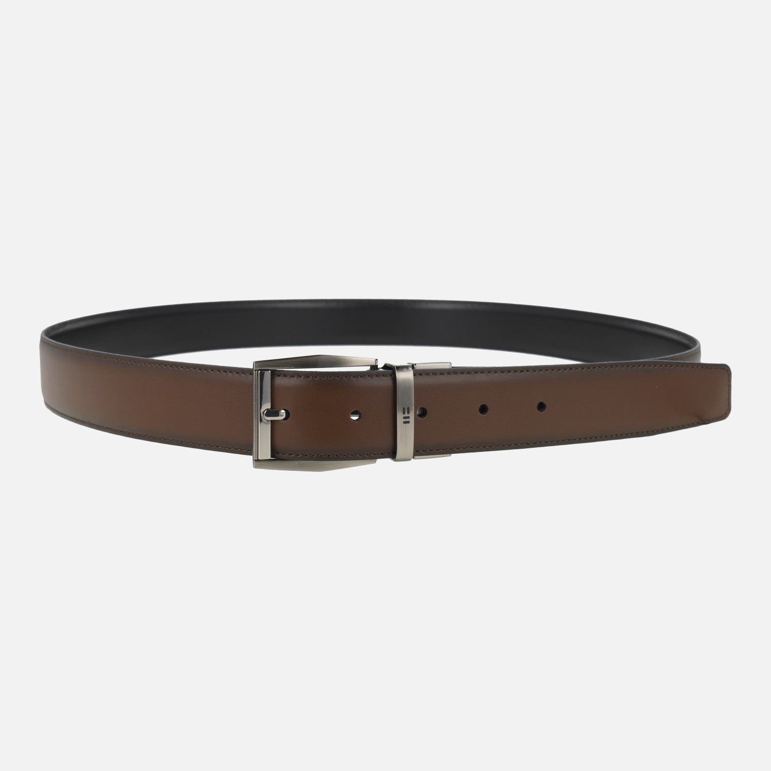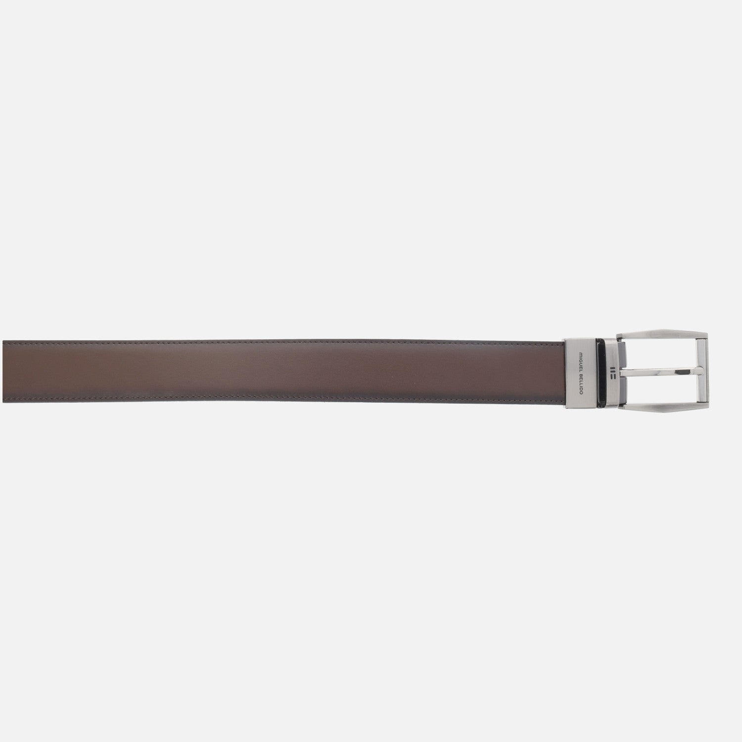 Cinturones de piel para hombre de la marca Miguel Bellido modelo 419-32. Cinturones reversibles de piel que combinan negro y cuero. Hebilla metálica plateada. Hechos en España.