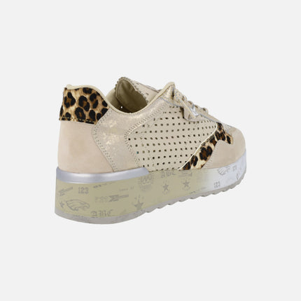 Preciosas deportivas multi material de la marca Cetti modelo 848 XL Ante-Leo Ivory. Sneakers de piel beige con detalle de troquelados, piezas en serraje, en piel metalizada oro y en animal print leopardo. Cordones elásticos. Interiores de piel con plantillas extraíbles. Piso de goma, con cuña trasera de 4 cms de altura (2,5 cms parte delantera).