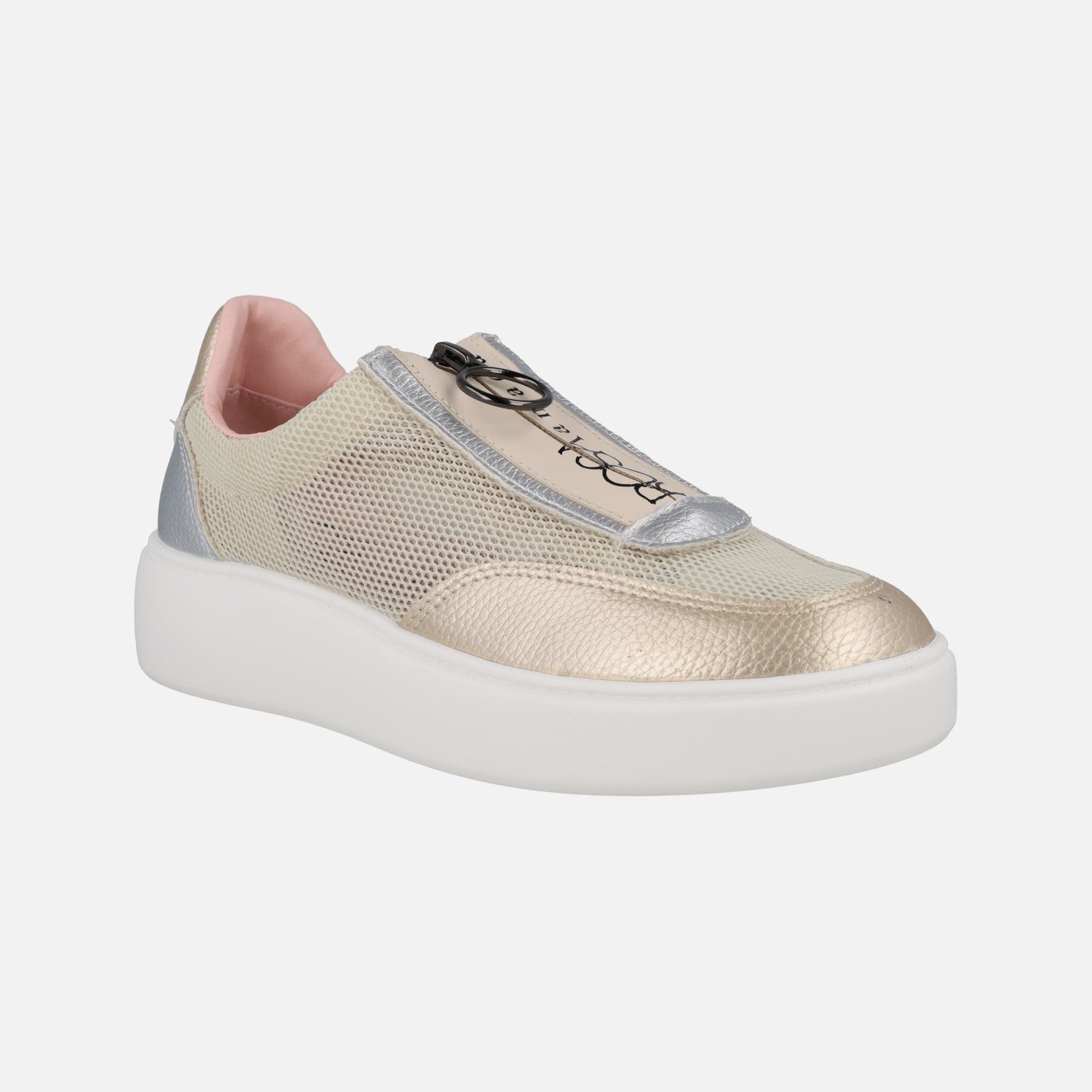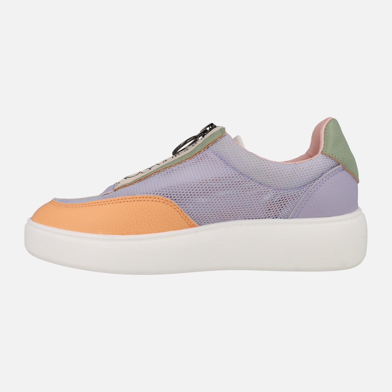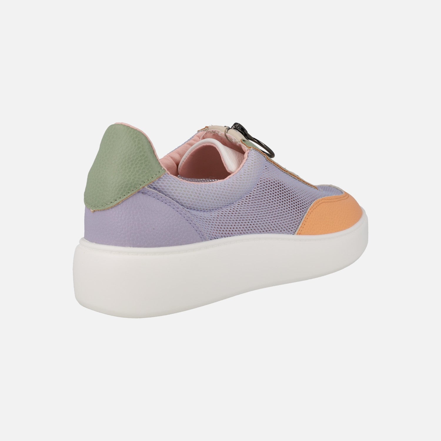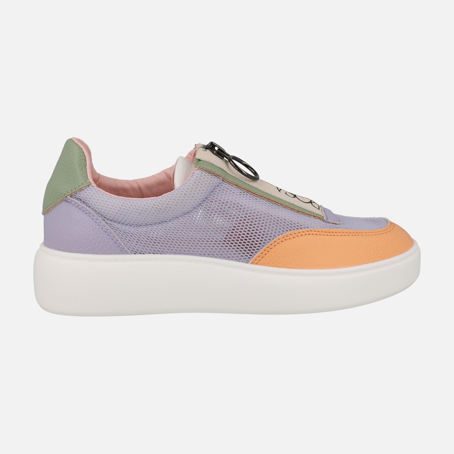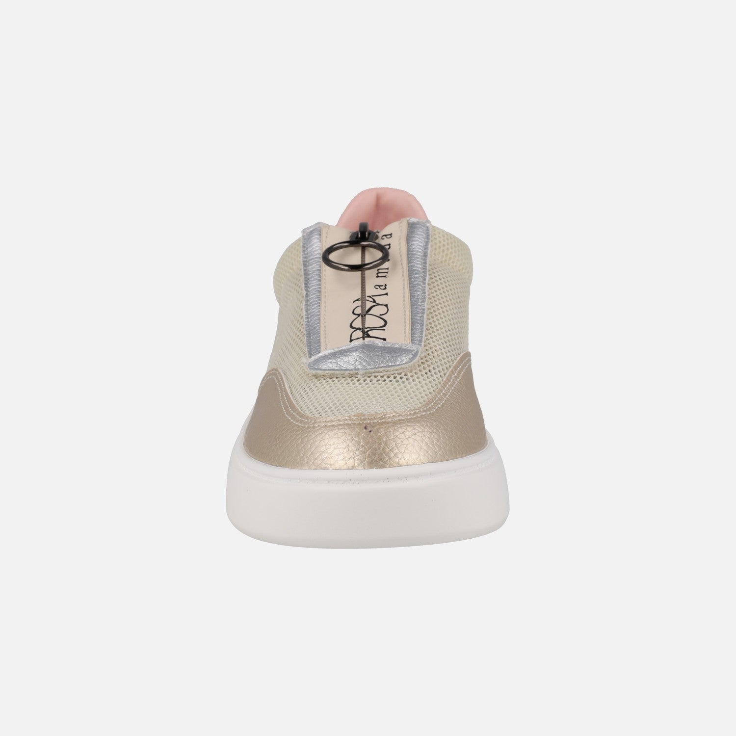 Zapatillas depotivas para mujer de la marca Rosa Amada, modelo 494, disponibles en combinado lavanda (malva, naranja y verde) o en combinado oro (beige, oro y plata). Zapatillas elaboradas en tejido rejilla y sintéticos, con cierre de cremallera central. Interior mixto en piel, tejido y sintéticos. Plantillas extraíbles. Piso de goma, de 4 cms de altura trasera (3 cms parte delantera).