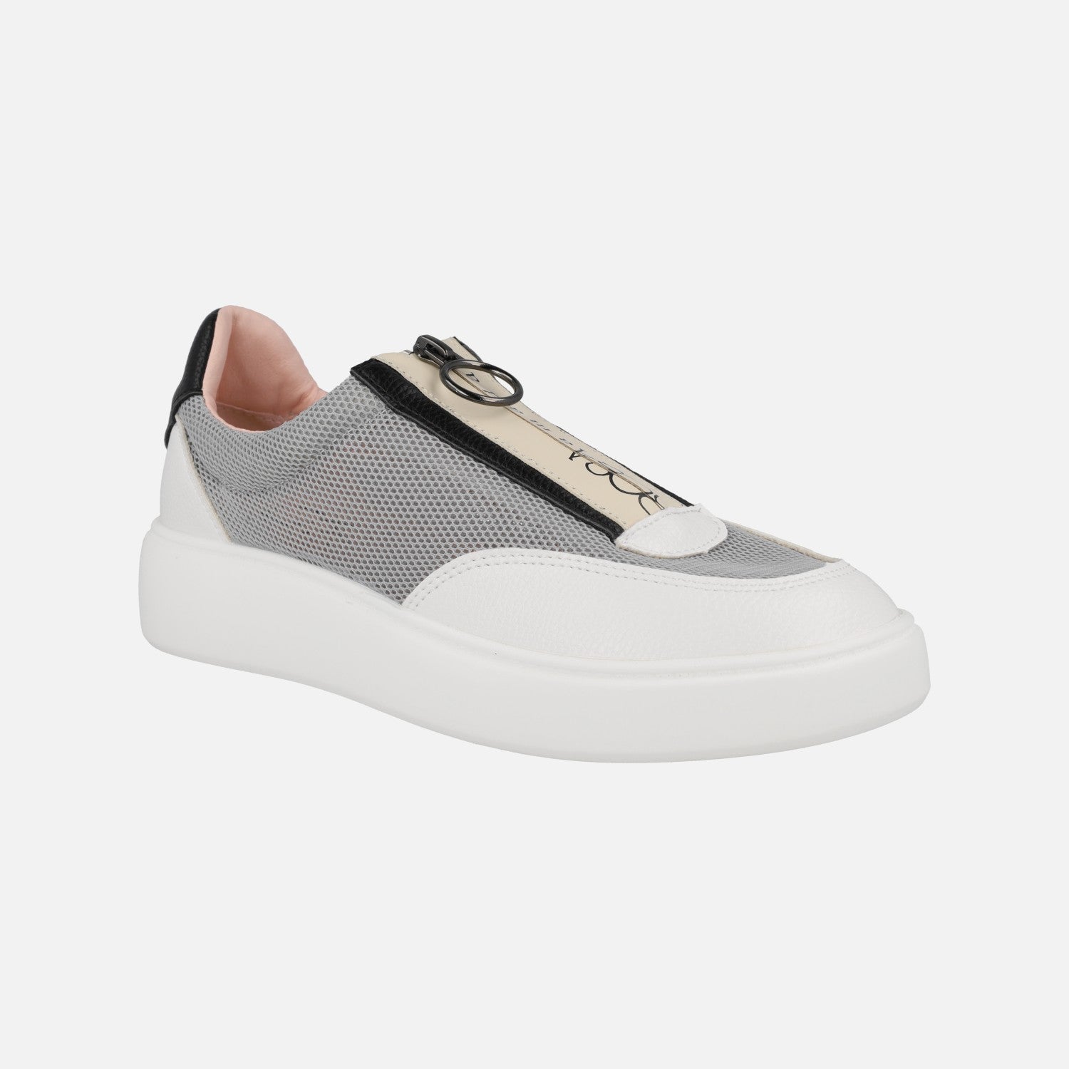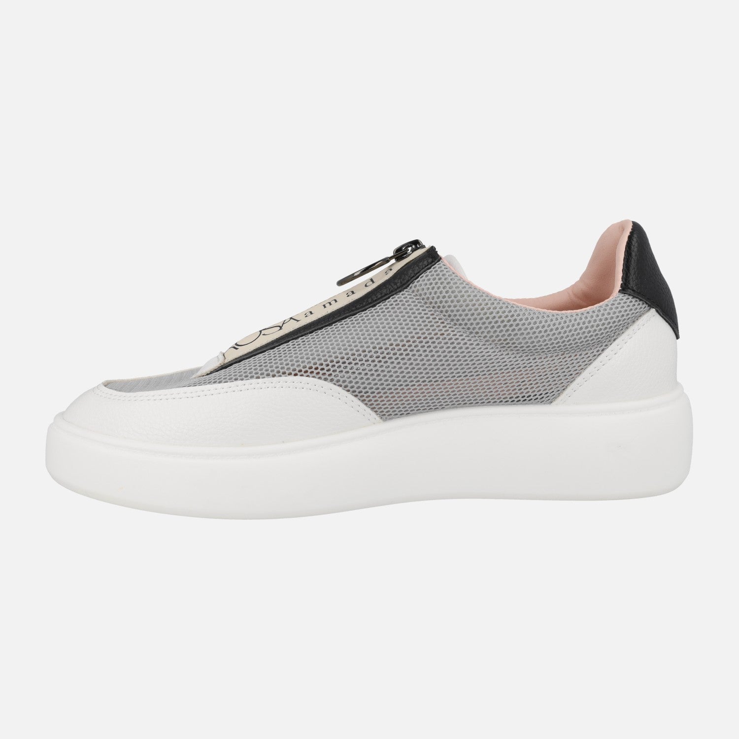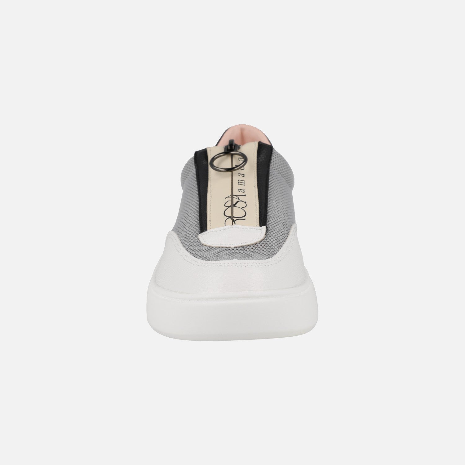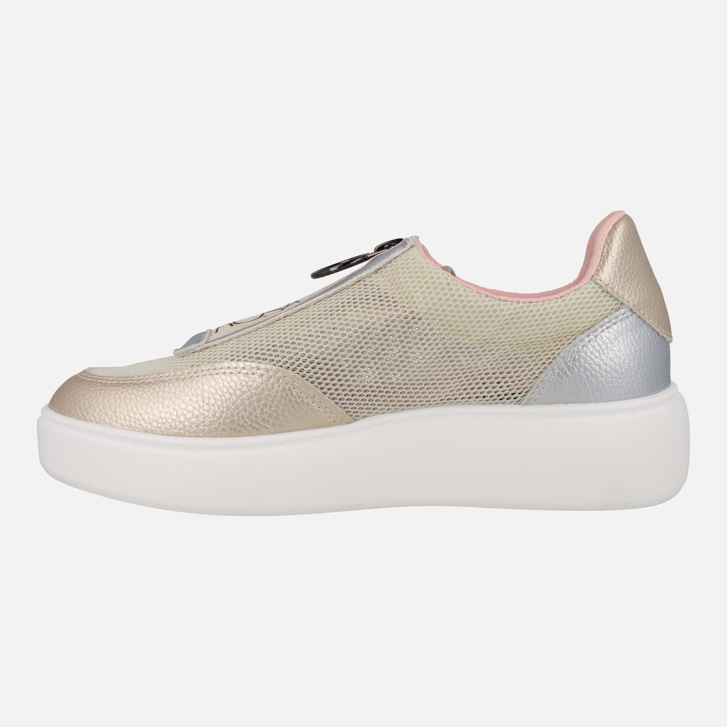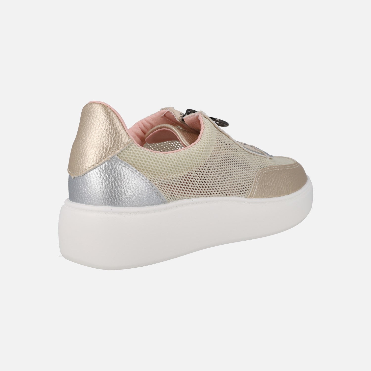 Zapatillas depotivas para mujer de la marca Rosa Amada, modelo 494, disponibles en combinado lavanda (malva, naranja y verde) o en combinado oro (beige, oro y plata). Zapatillas elaboradas en tejido rejilla y sintéticos, con cierre de cremallera central. Interior mixto en piel, tejido y sintéticos. Plantillas extraíbles. Piso de goma, de 4 cms de altura trasera (3 cms parte delantera).