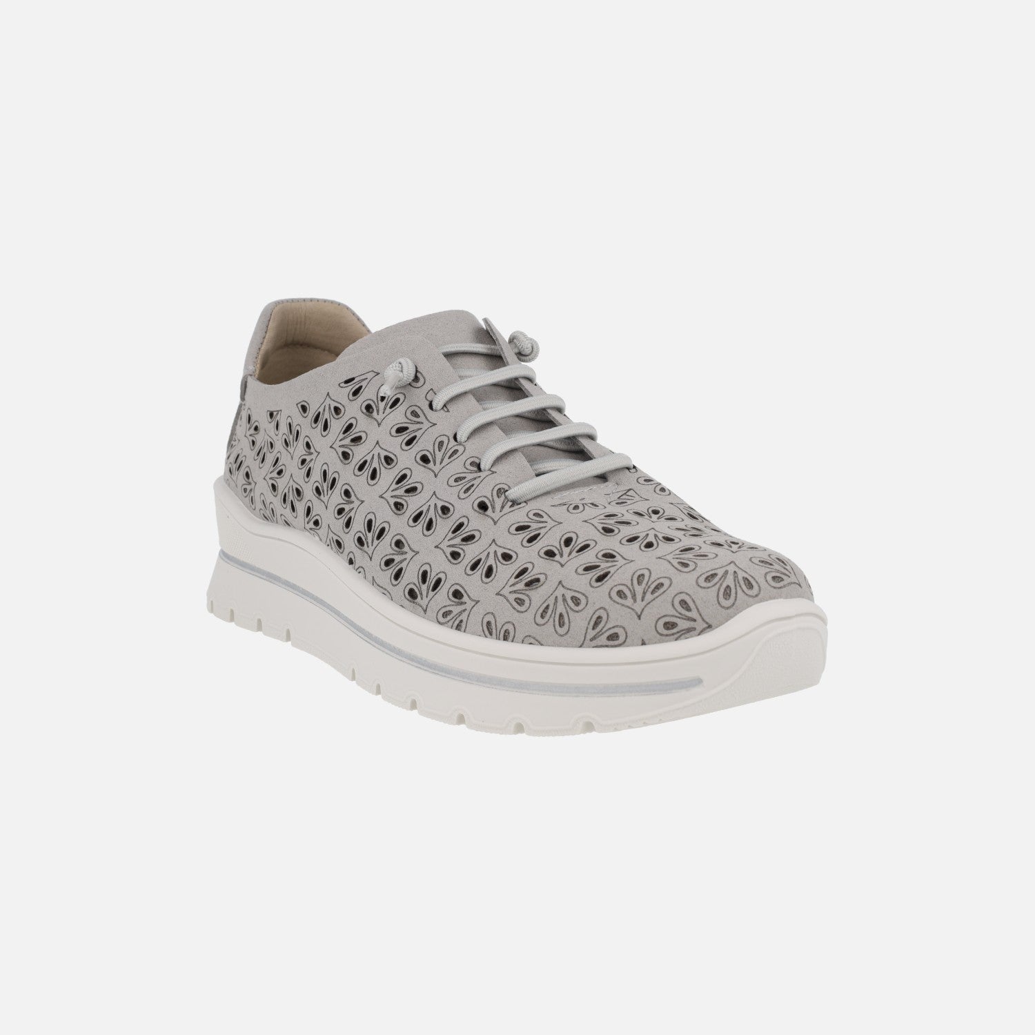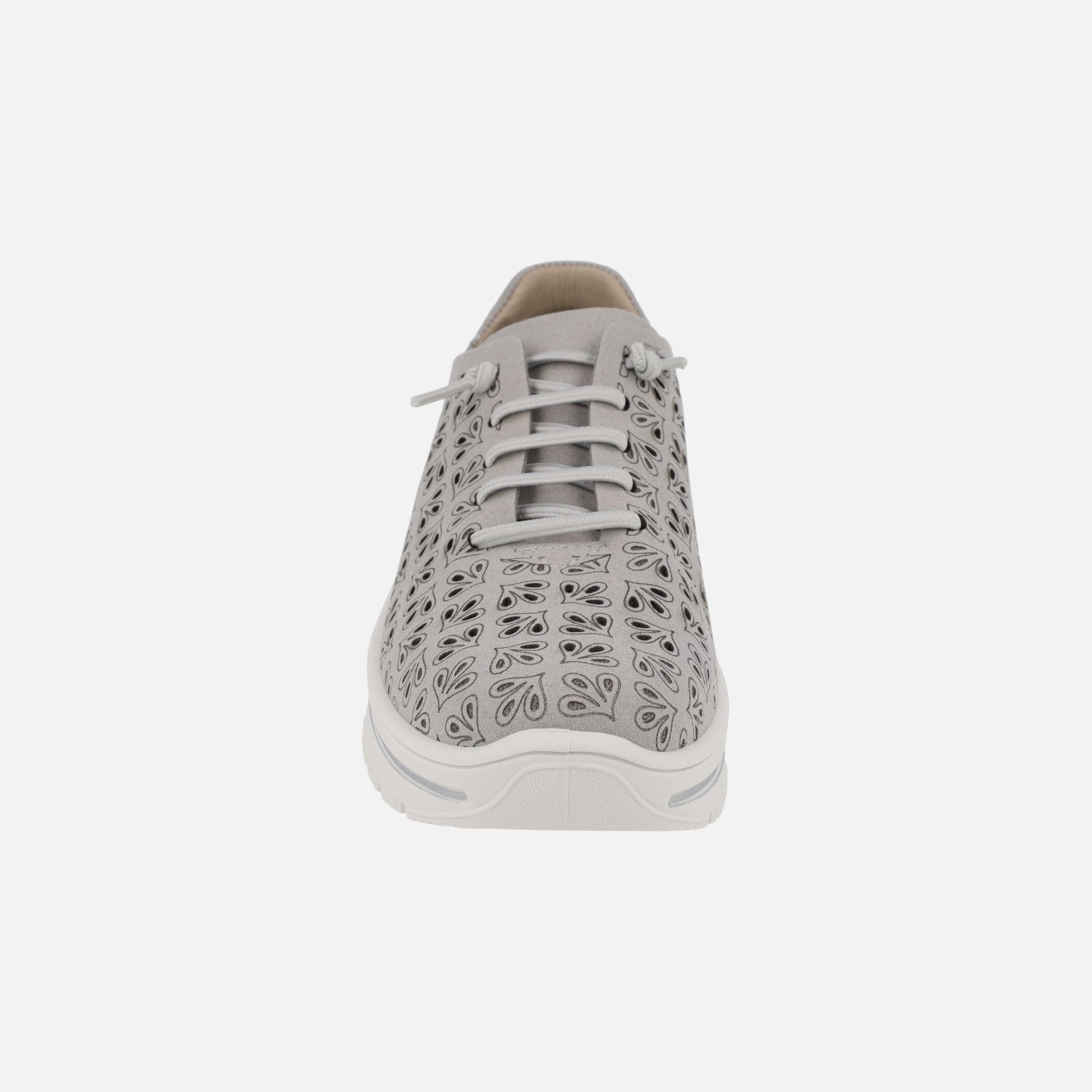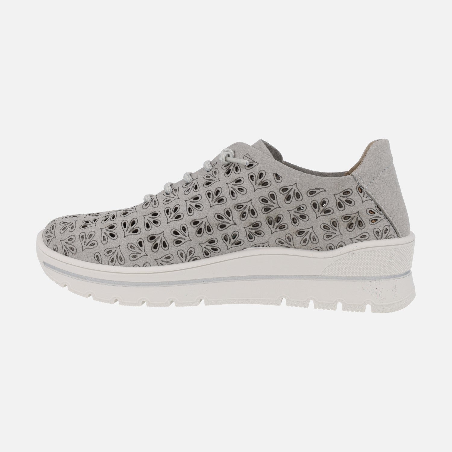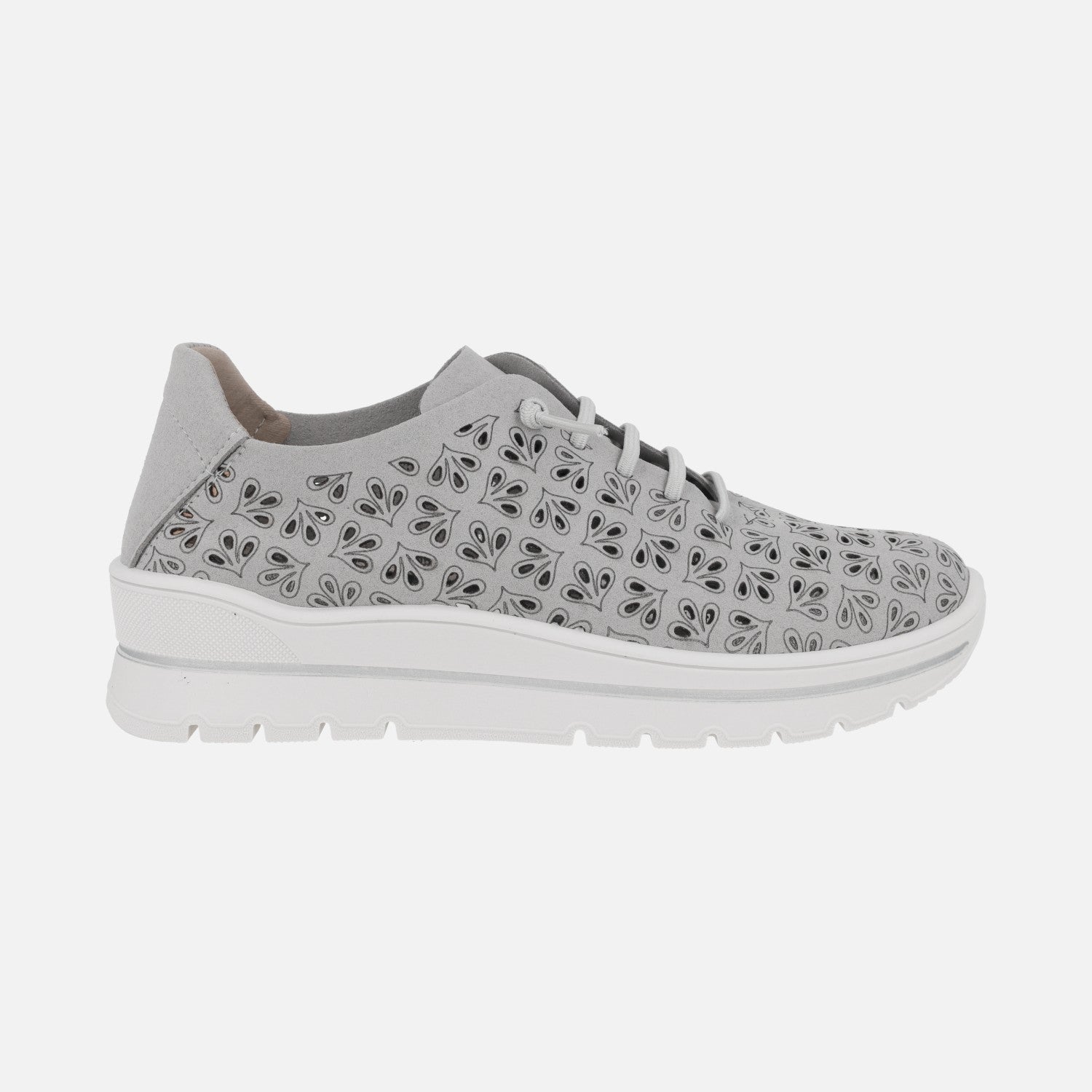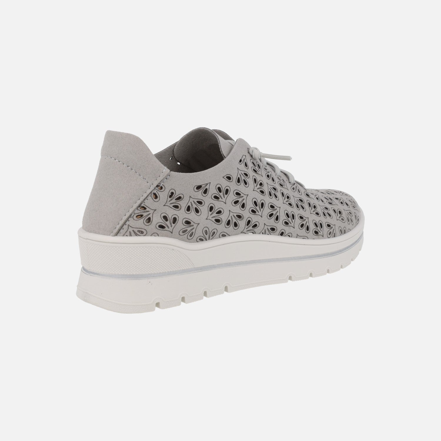 Zapatillas deportivas para mujer de la marca Roal, modelo A40040 Gris. Deportivas troqueladas, elaboradas en materiales sintéticos efecto serraje. Cordones elásticos. Interior textil, plantillas extraíbles. Plataforma de goma de 3,5 cm de altura trasera (2 cm parte delantera). Made in Spain.