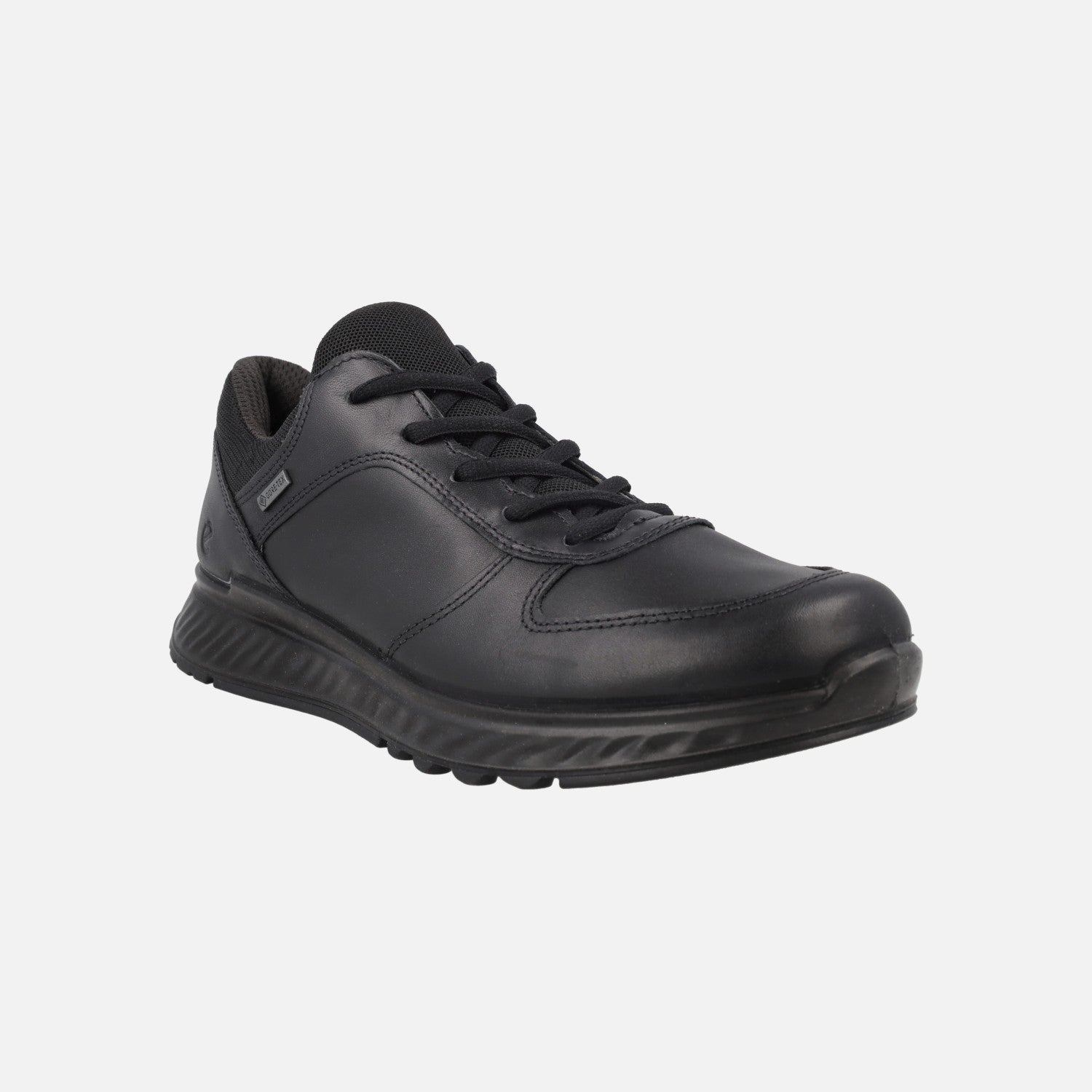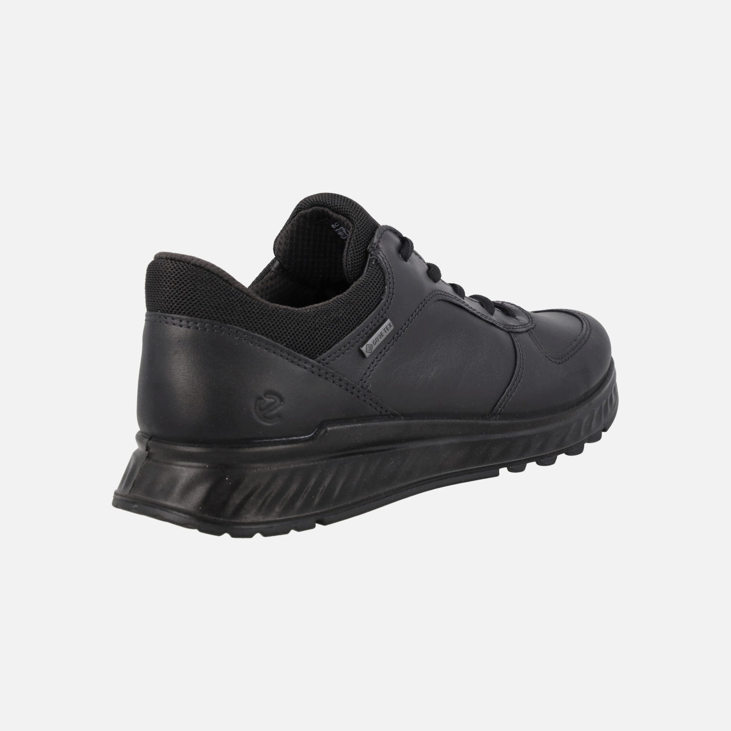 Zapatillas deportivas para mujer de la marca Ecco modelo Exostride W Low GTX Black. Deportivas negras de piel con detalles en tejido, cierre de cordones. Interior textil con plantillas extraíbles. Membrana interior de Gore tex, impermeable. Piso sintético con 3 cm de altura trasera (2 cm parte delantera).