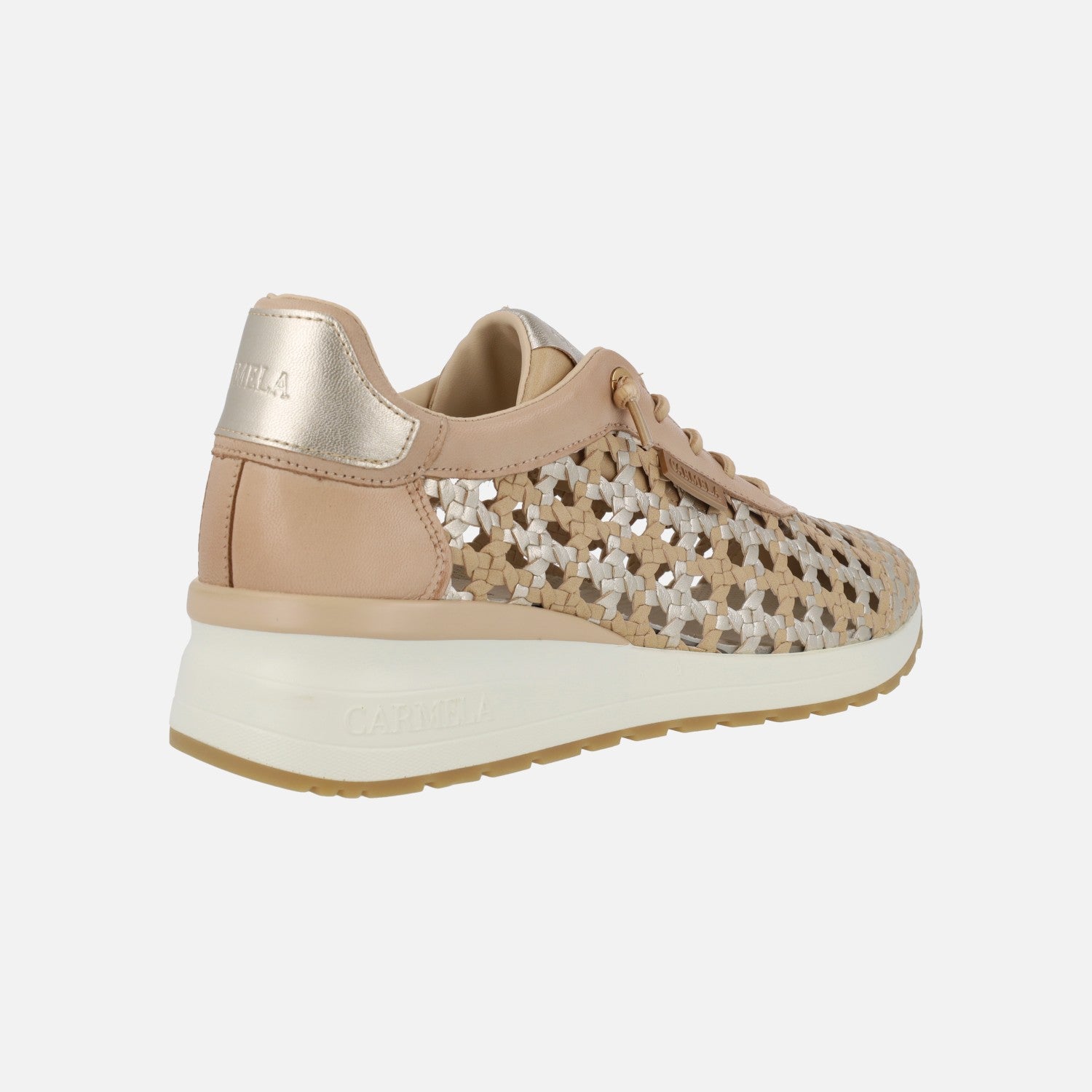 Zapatos deportivos para mujer de la marca Carmela modelo 162287 piel Beige. Deportivas elaboradas en piel trenzada, combinando beige y dorado. Cordones elásticos. Interiores en tejido y sintéticos, con plantillas extraíbles. Piso de goma con 5 cms de altura trasera y 2 cms en la parte delantera.