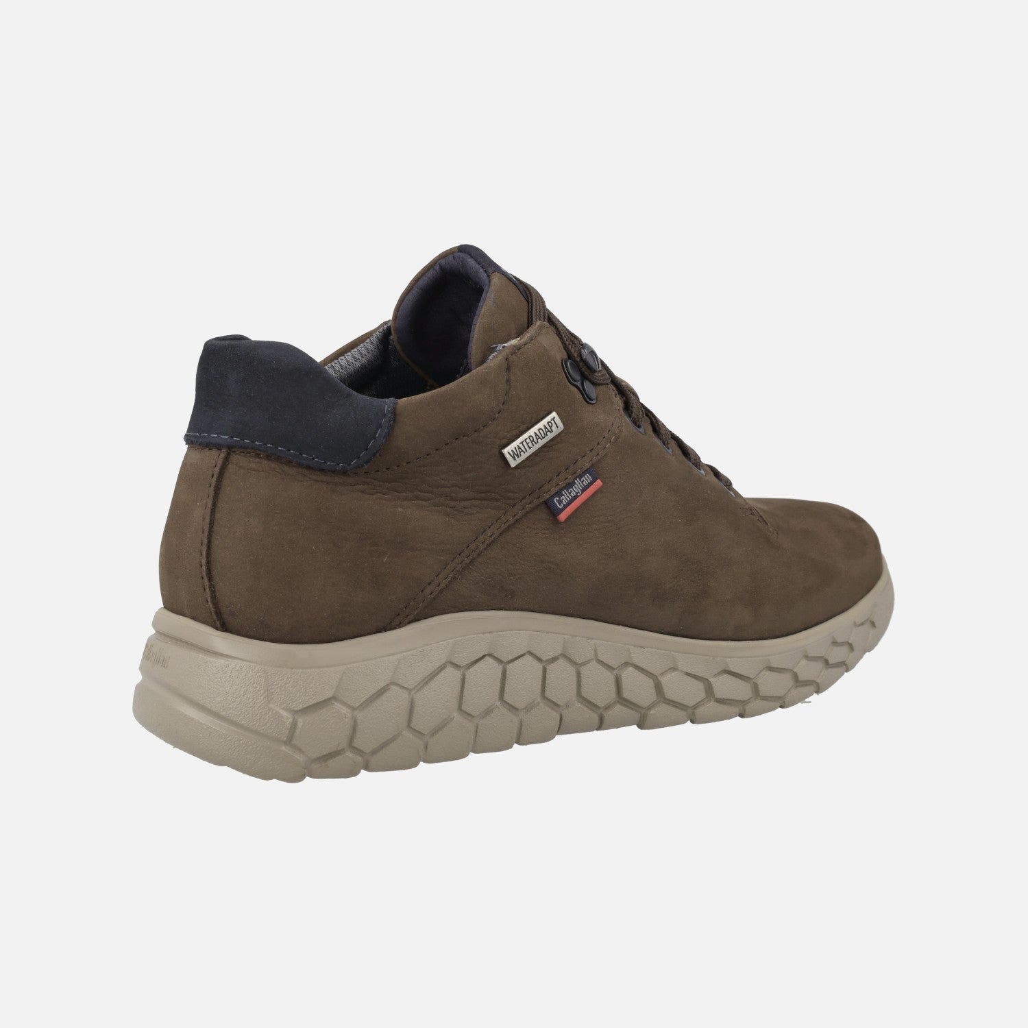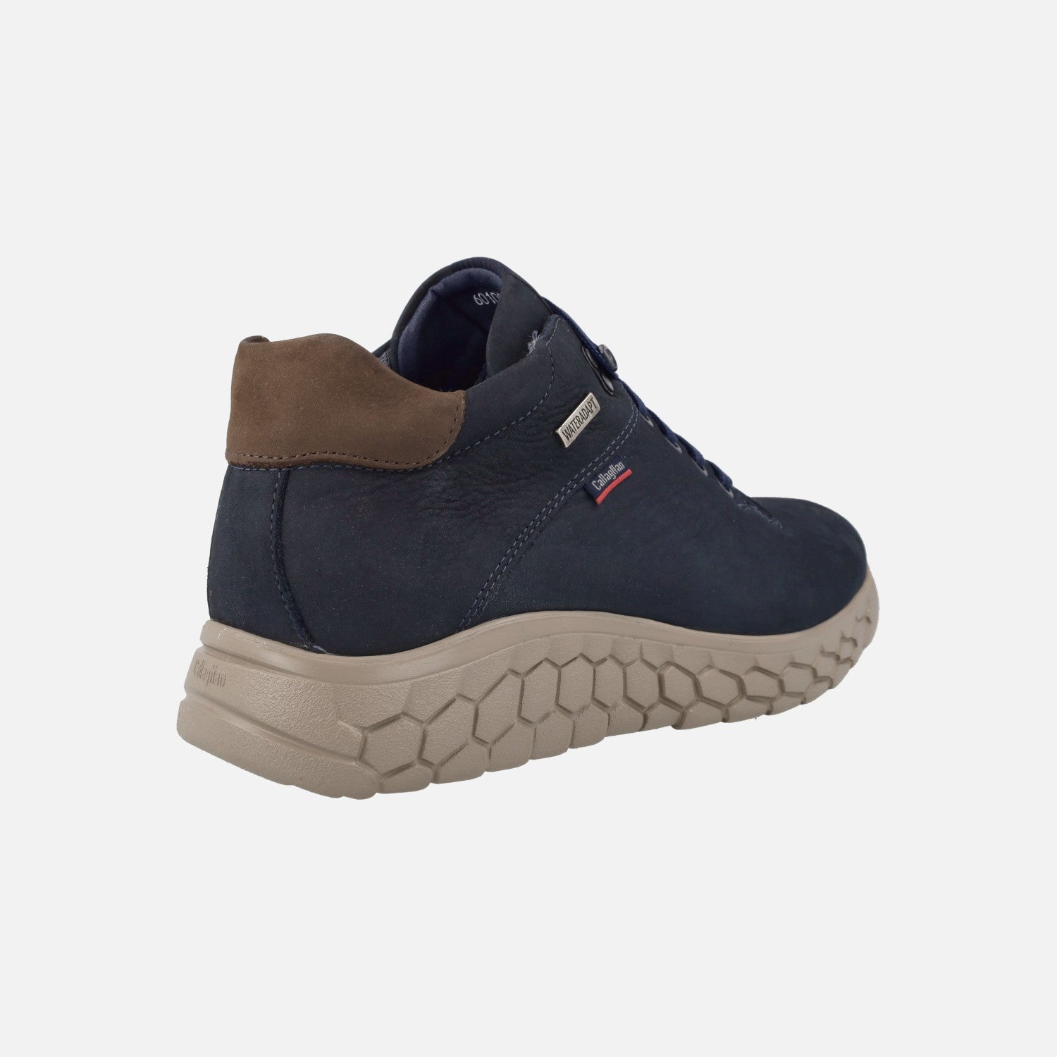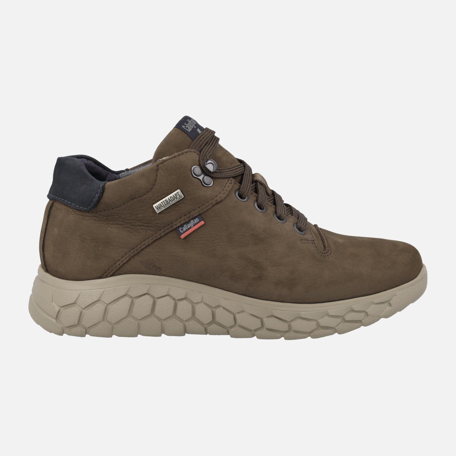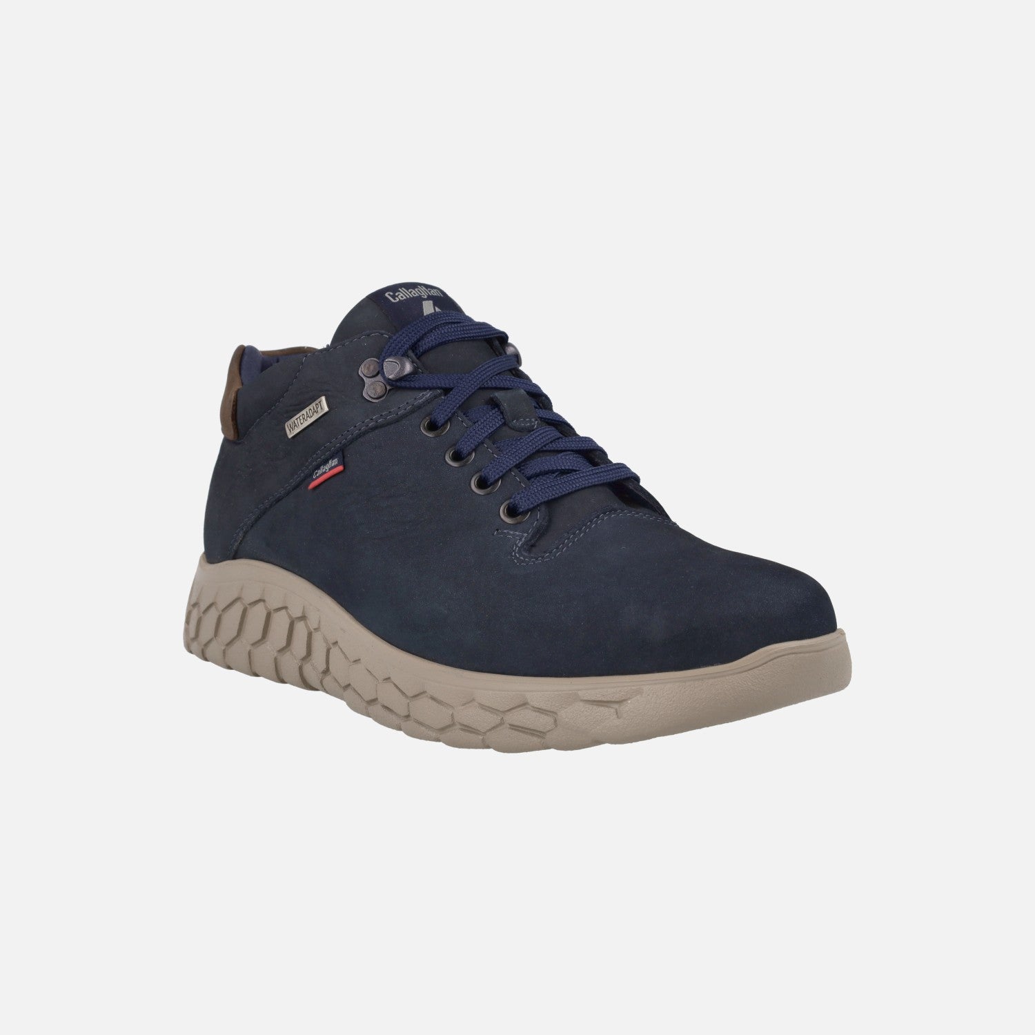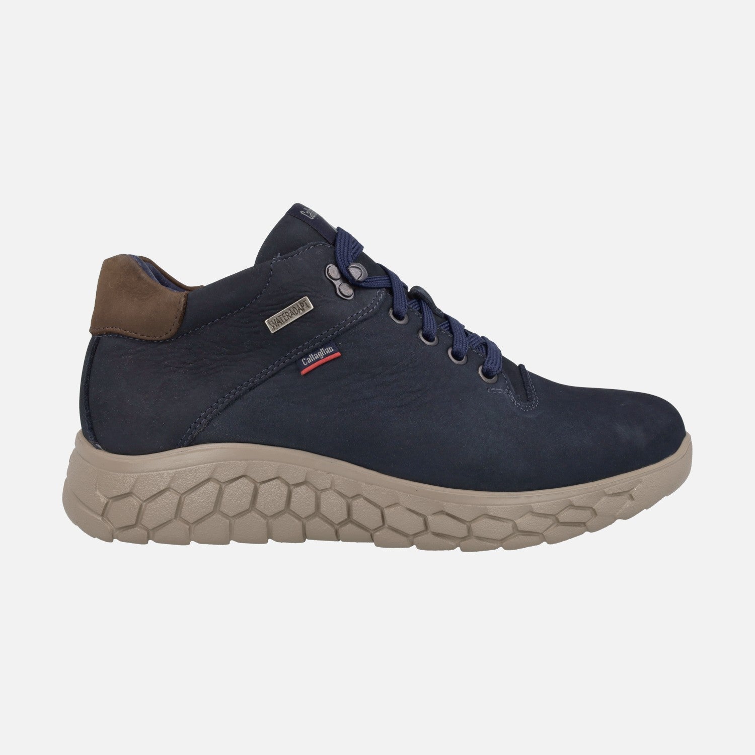Deportivos abotinados para hombre del modelo 60100 de la marca española Callaghan, fabricados en piel Nobuck. Tienen cordones y ojetera metálica que termina con un gancho para abrochar. El forro es textil con membrana WATERADAPT, resistente al agua. Las plantillas son extraíbles. El piso es XL Extralight, muy ligero y flexible. Disponibles en marrón y en azul marino.