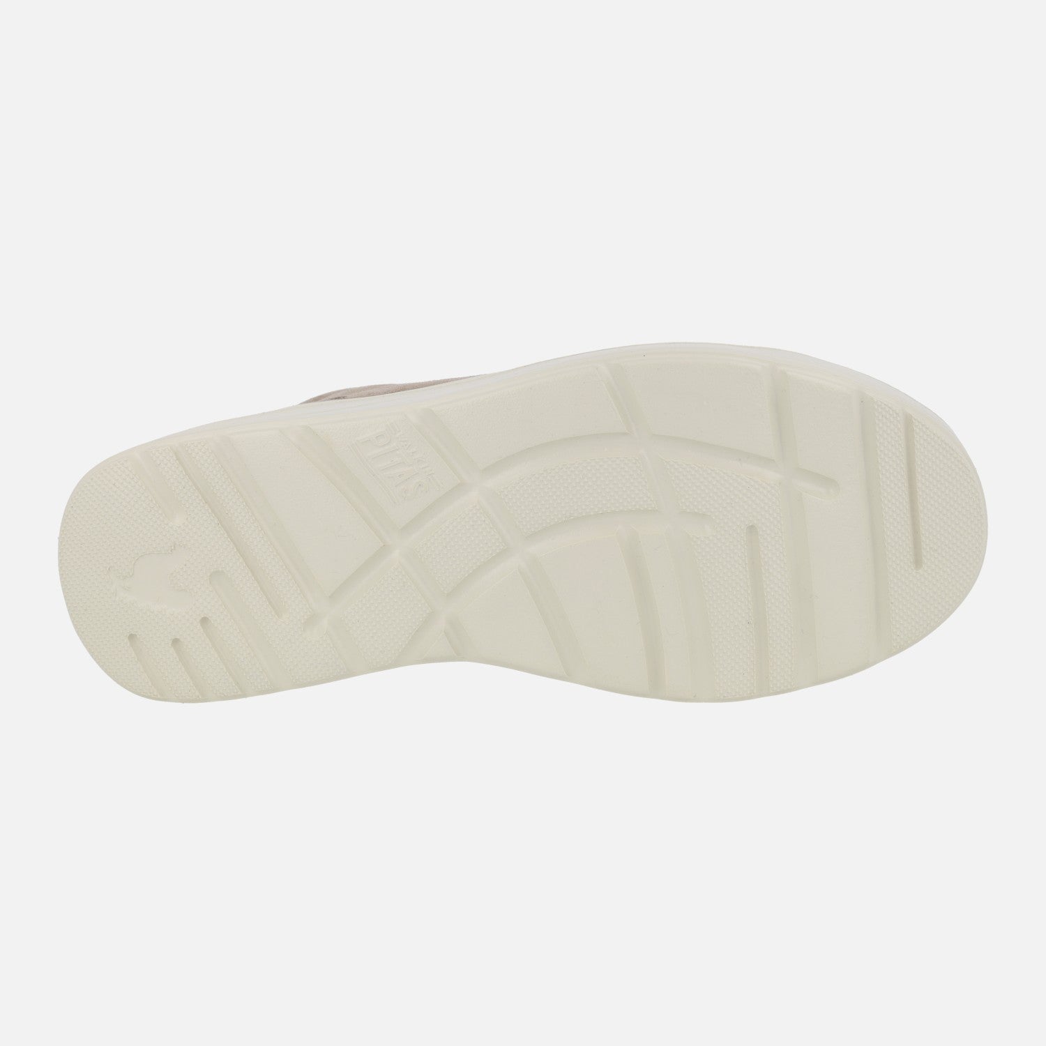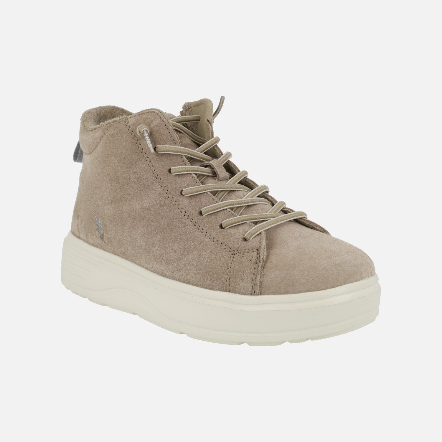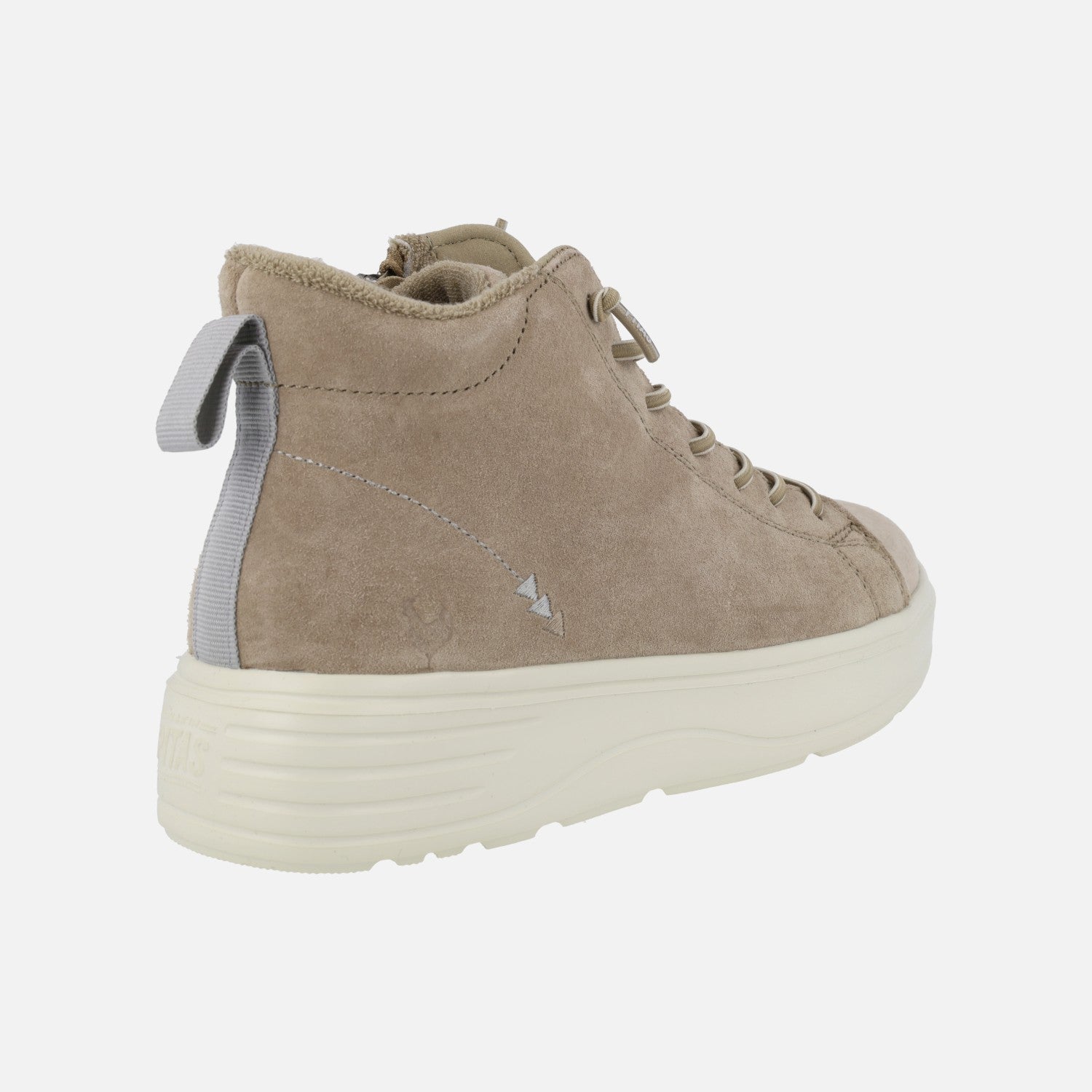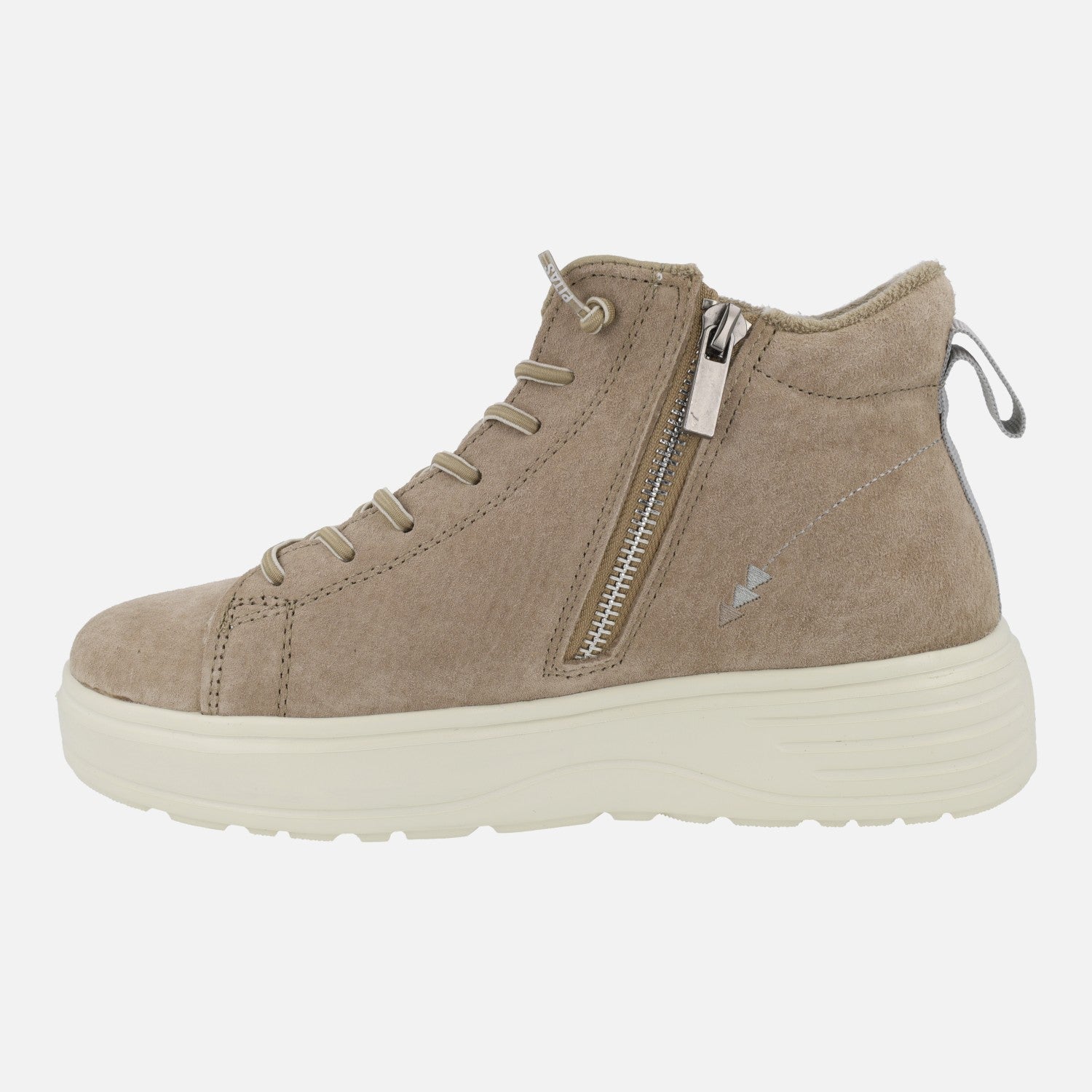 Botines deportivos para mujer de la marca Walk in pitas modelo Takao taupe. Botines elaborados en piel serraje water repellent (hidrofugado) con cierre de cremallera en el lado interior. Cordones elásticos. Interior textil con plantillas extraíbles forradas de piel. Caña de 9,5 cm de altura. Piso de EVA Ultralight con 4 cm de altura trasera (3 cm parte delantera).
