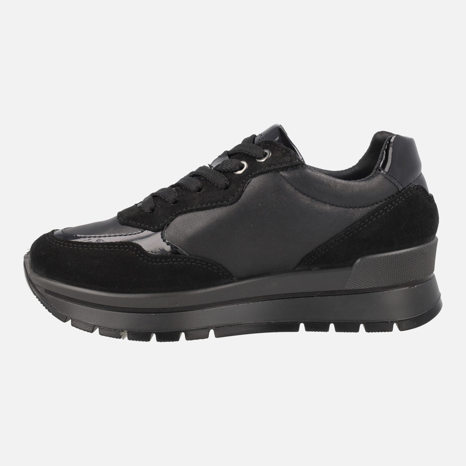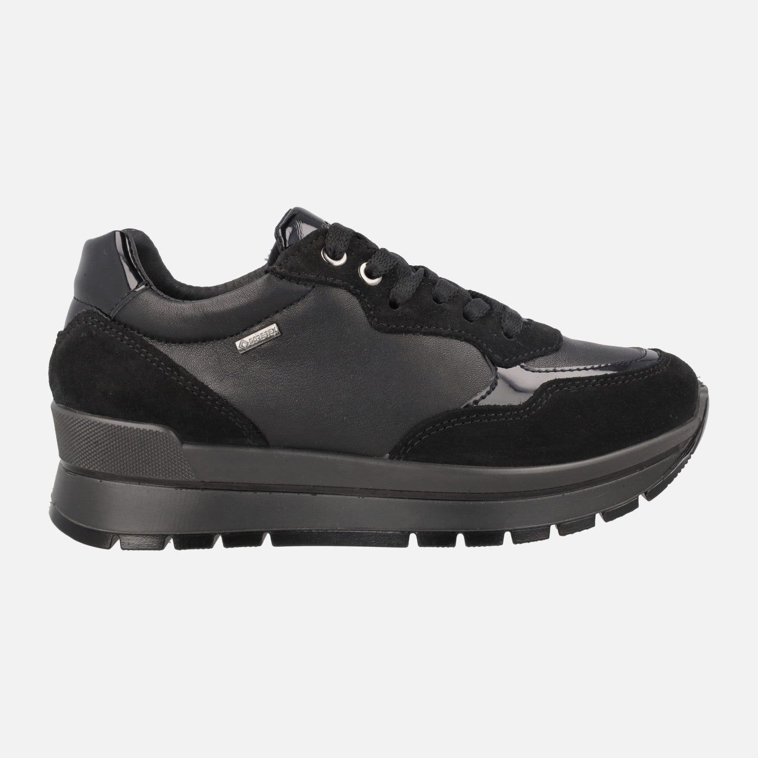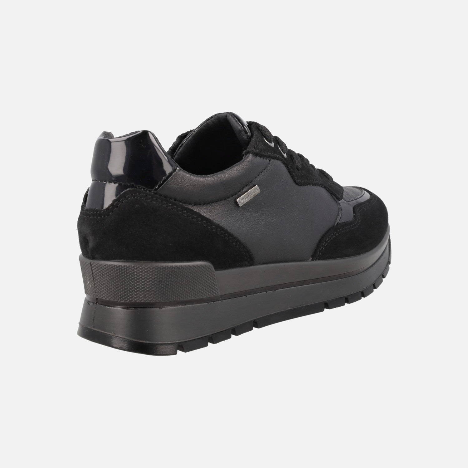 Zapatos deportivos para mujer de la marca italiana Igi&co. modelo 86765, disponibles en combinado negro y en combinado fango. Deportivos elaborados en piel, serraje y otros materiales, con cierre de cordones. Interior textil, con membrana interior GORE TEX, impermeable. Plantillas extraíbles forradas de piel. Piso sintético con 4 cm de altura trasera (2,5 cm parte delantera).