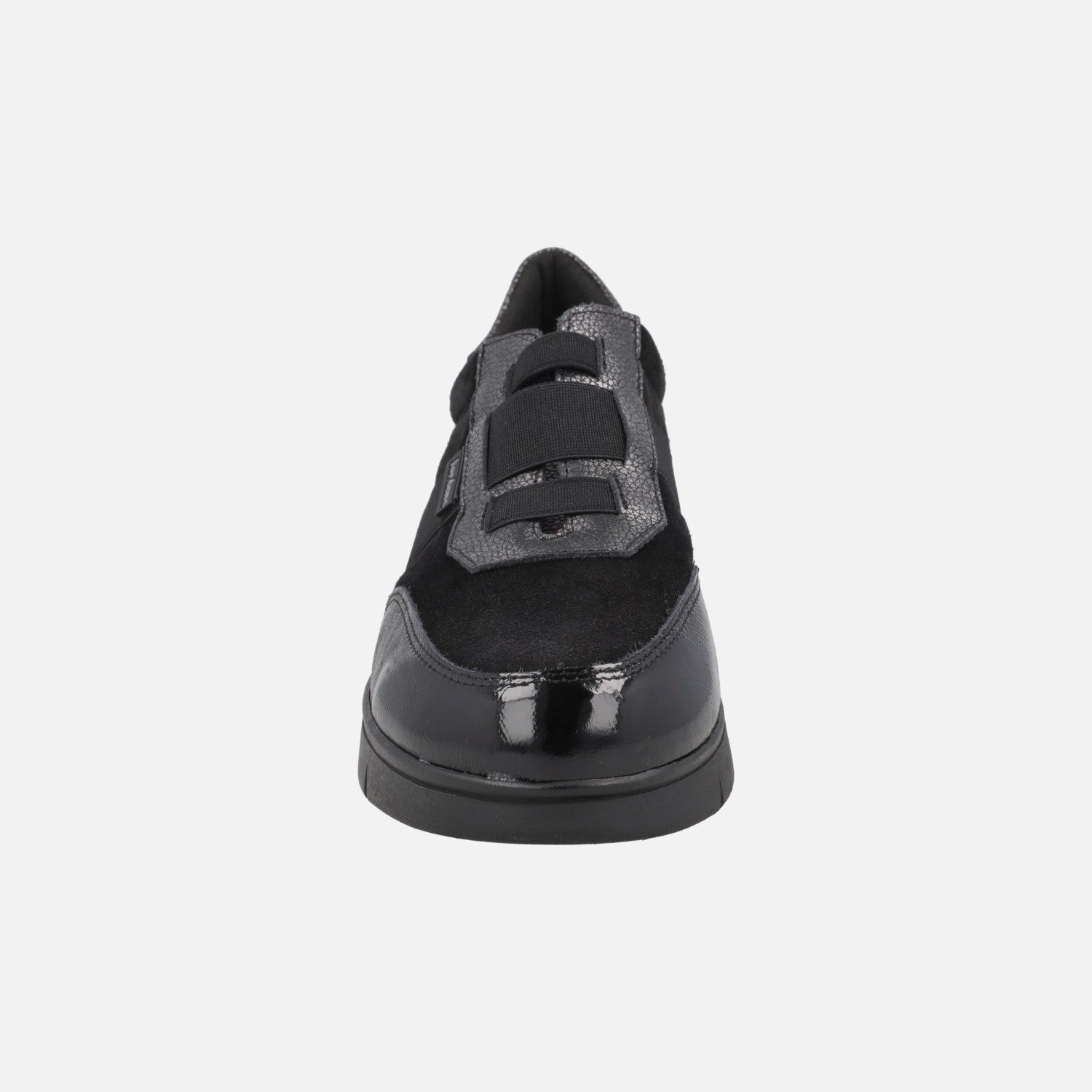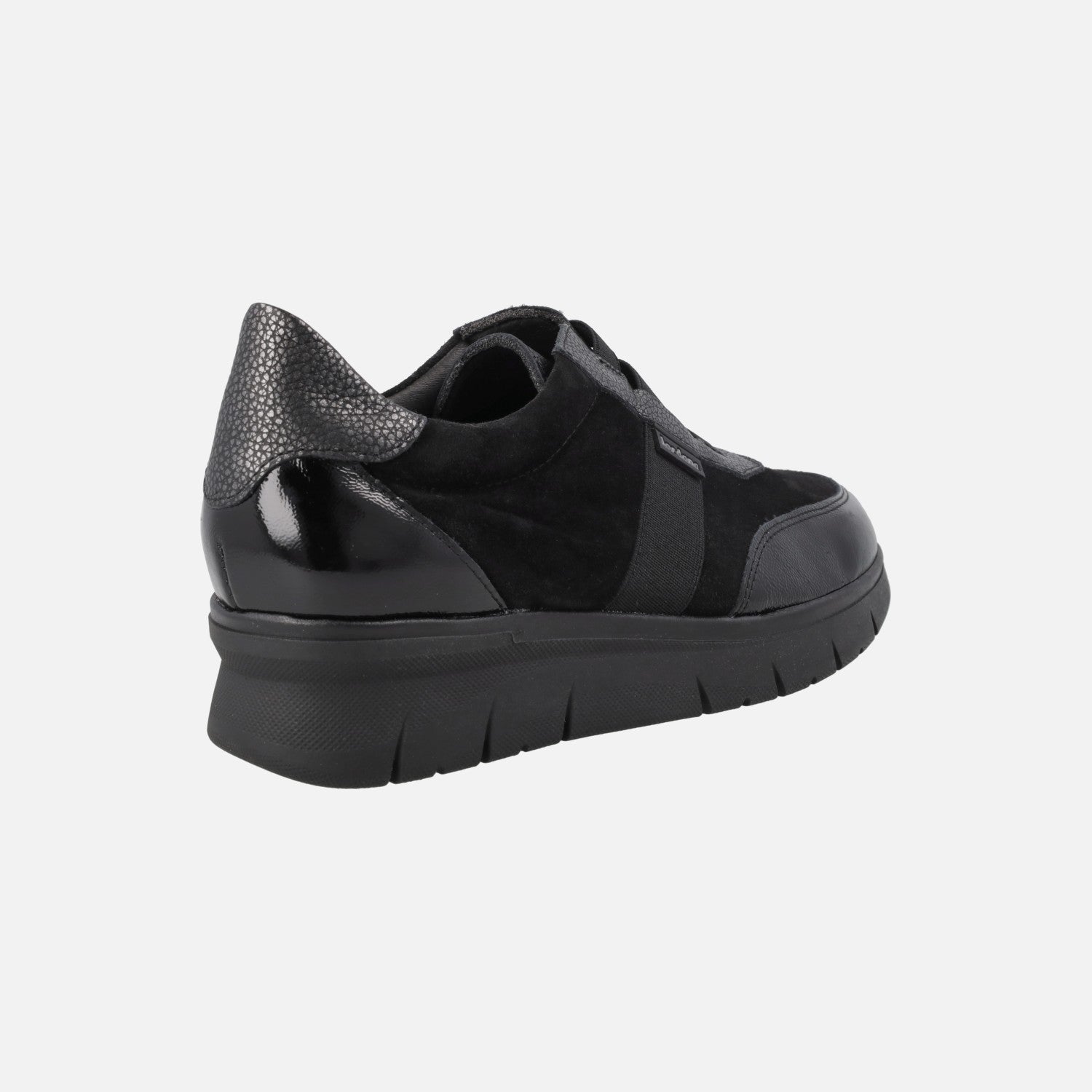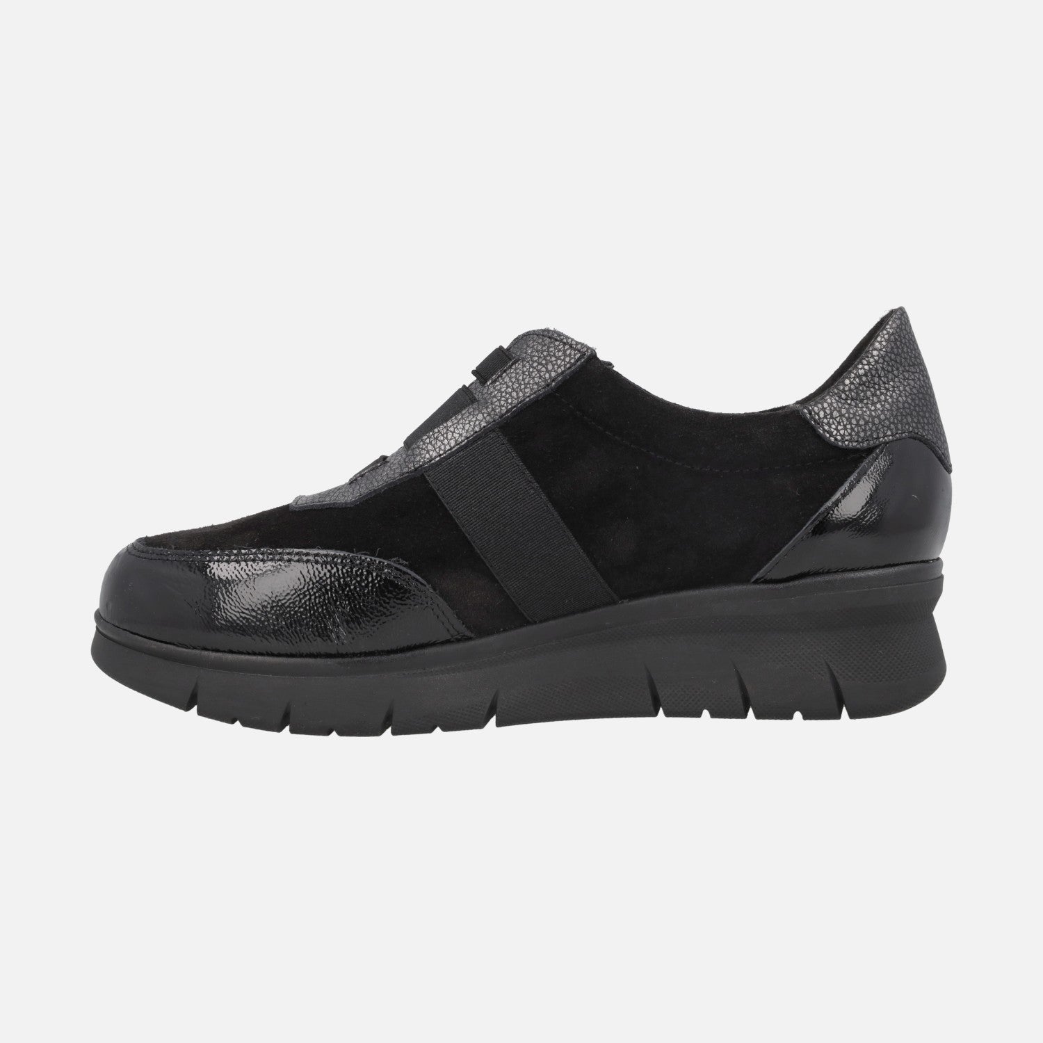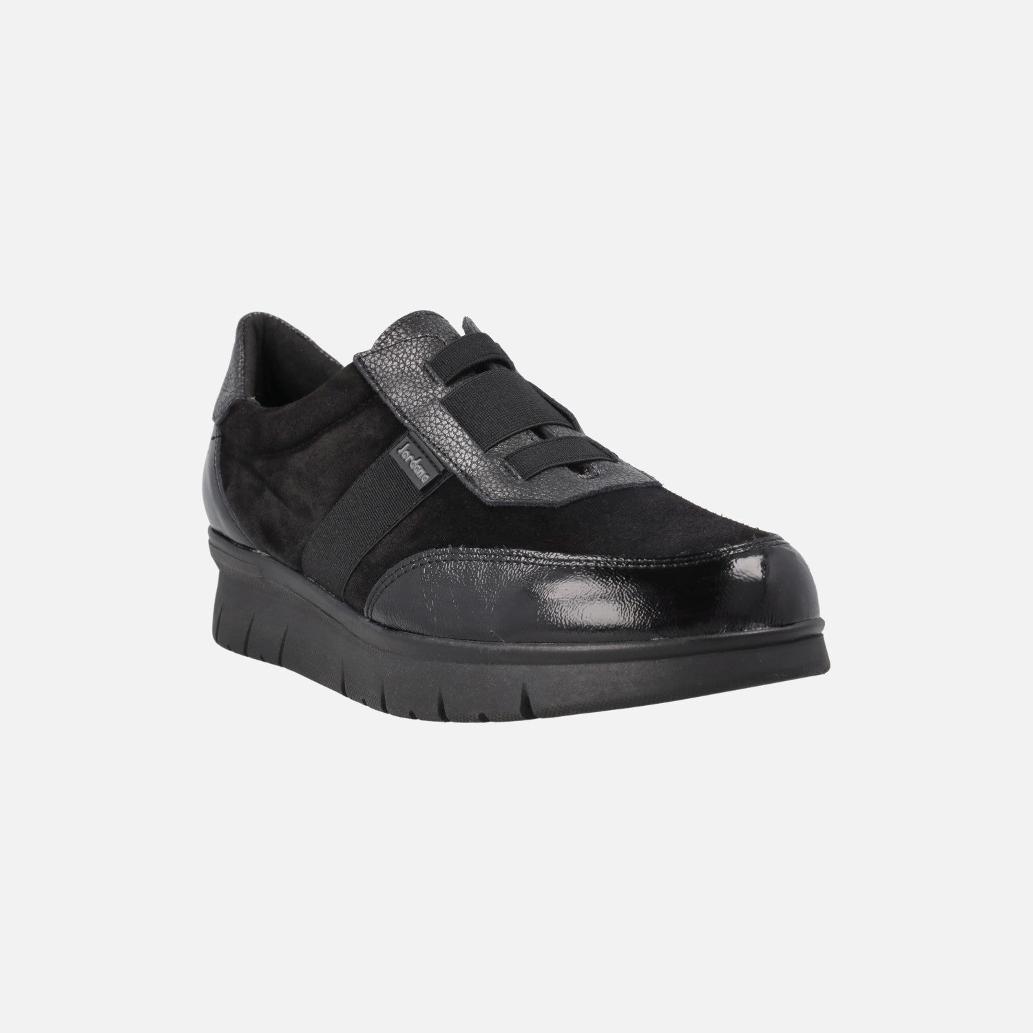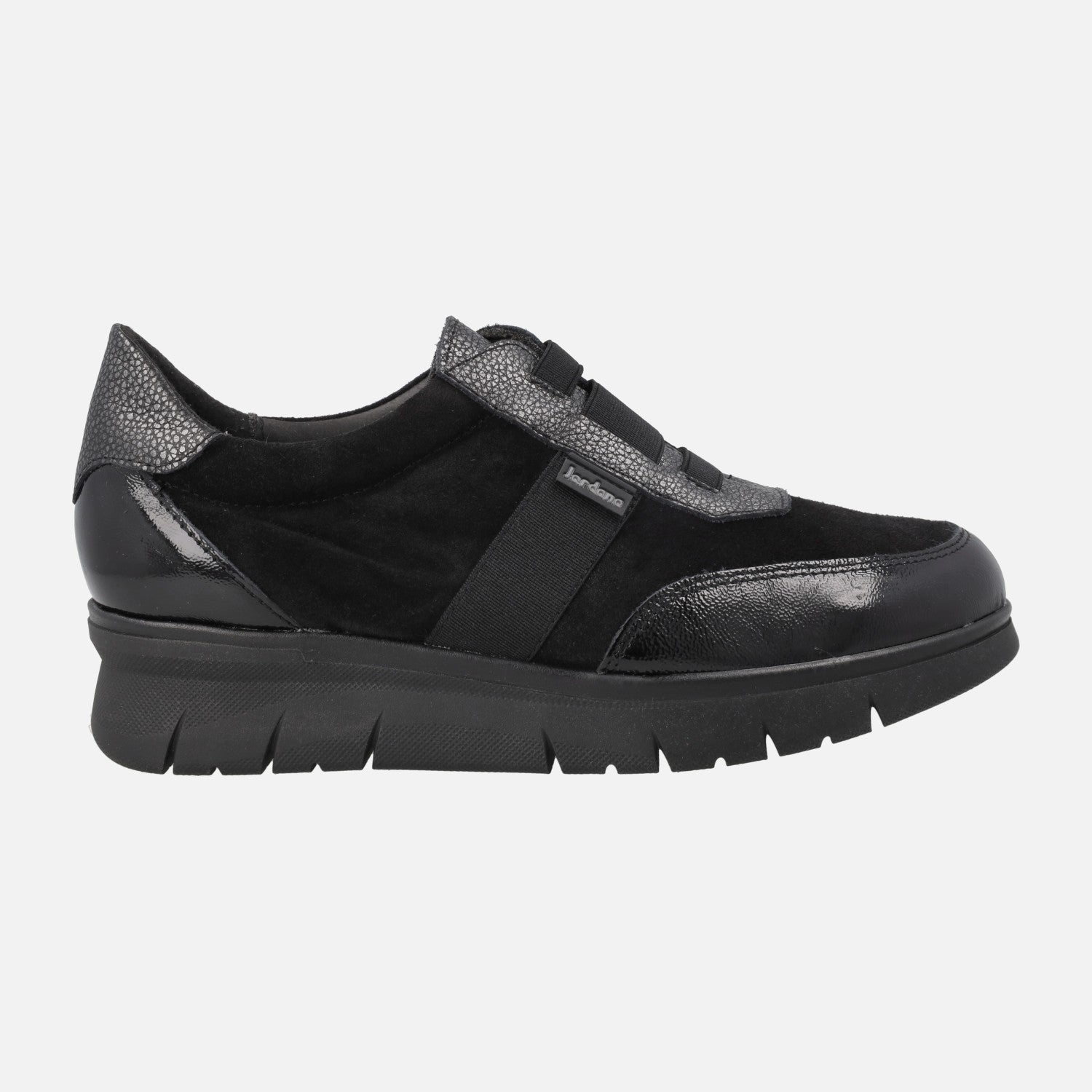 Elegantes deportivas para mujer de la marca Jordana, modelo 4721 Negro. Deportivas elaboradas en combinado de serraje, piel y charol, en color negro. Cierre de gomas elásticas. Interior en combinado de piel y otros materiales, con plantillas extraíbles forradas de piel. Suela sintética con 4 cm de altura trasera (2,5 cm parte delantera).