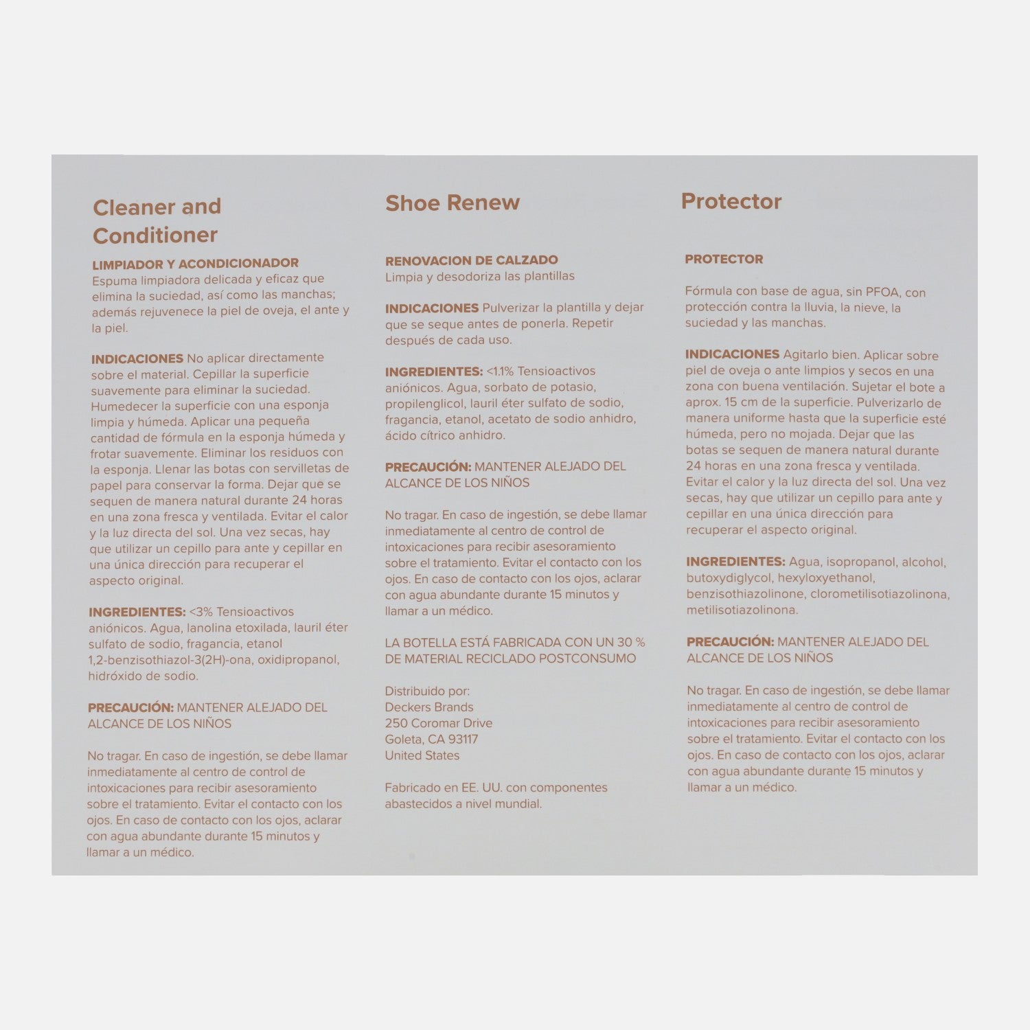 Kit de cuidado y limpieza para tus botas UGG modelo 1171598. Incluye limpiador/acondicionador, protector para la lluvia y las manchas, spray renovador desodorante. Además incluye un cepillo con asa de bambú y un eliminador de rozaduras para ante.