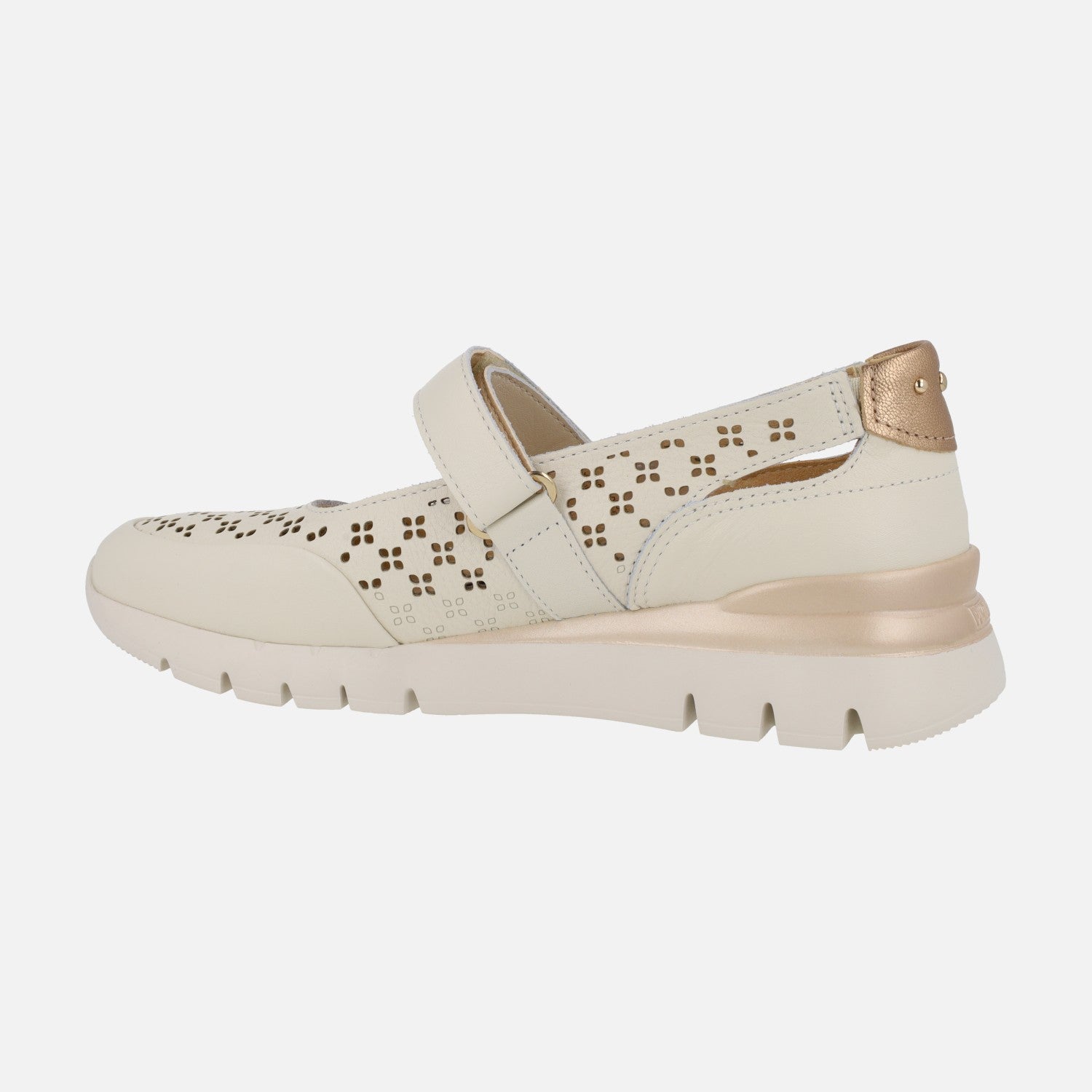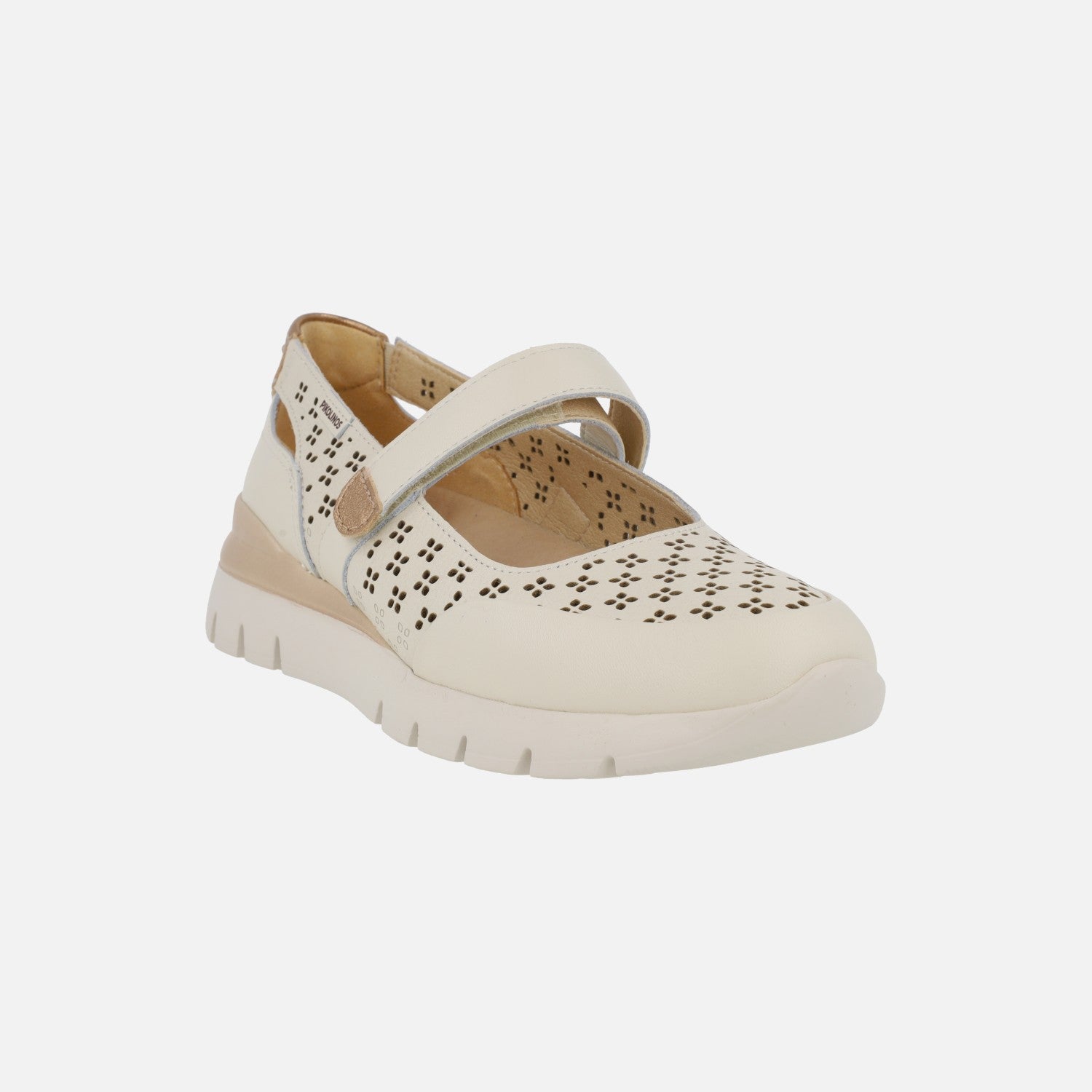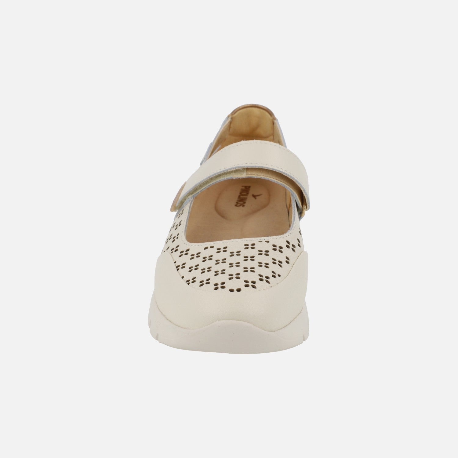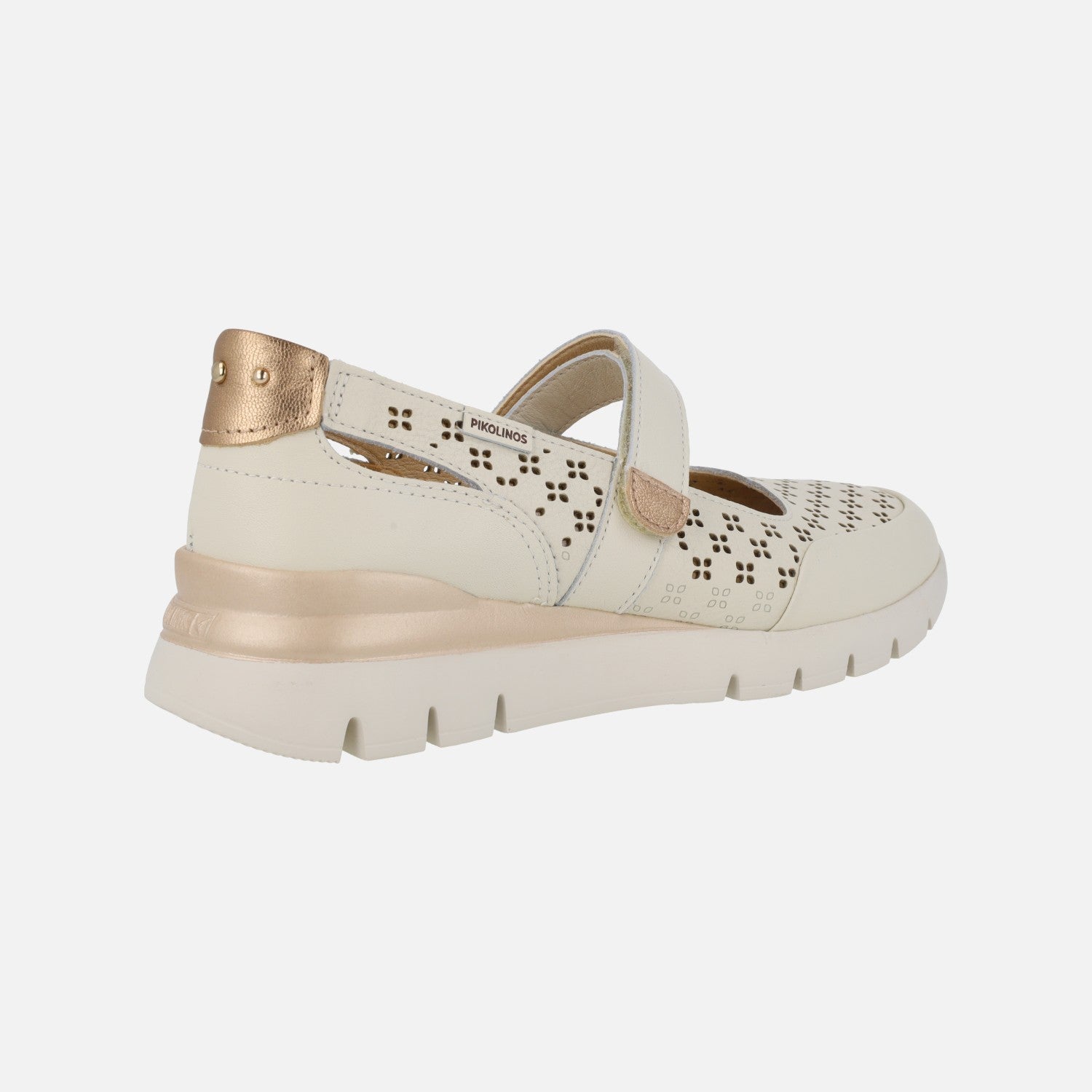 Zapatos deportivos estilo mercedes de la marca Pikolinos, modelo Cantabria W4R-6774C1 Nata. Zapatos de piel con detalle de troquelados, elaborados en color beige clarito con toques metalizados. Interior textil con plantillas extraíbles Memory foam. Tira al empeine con cierre de velcro. Suela sintética extra ligera. Altura trasera 4 cm (2 cm parte delantera).
