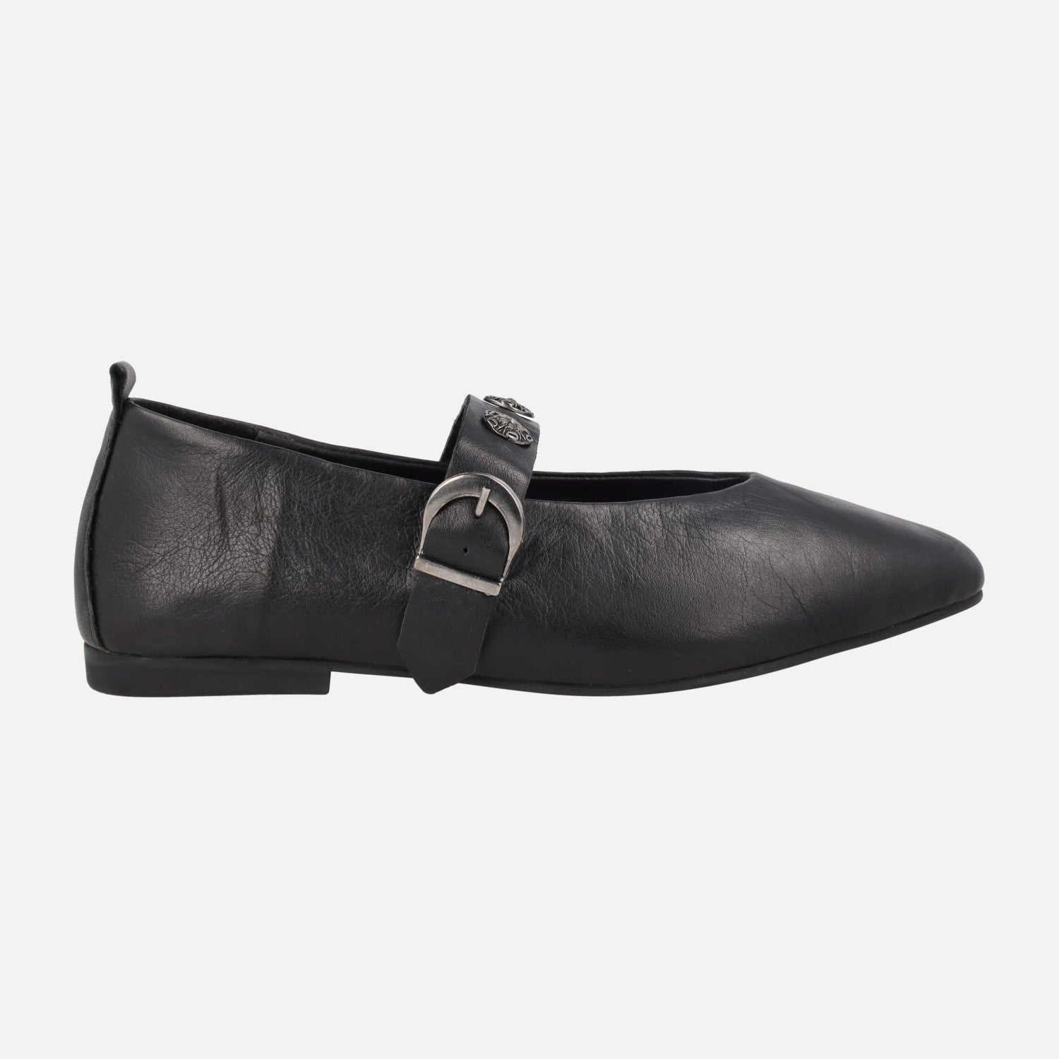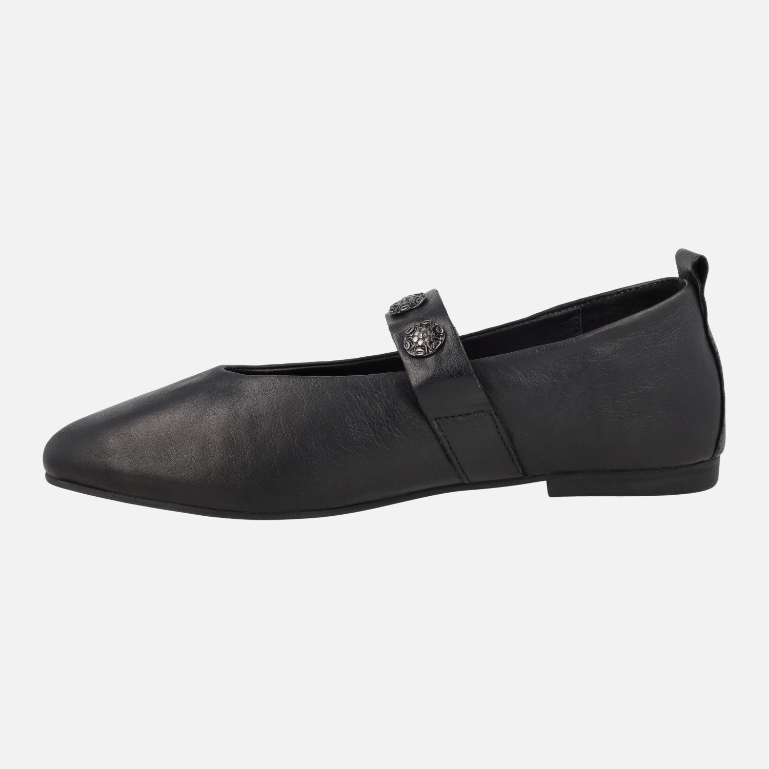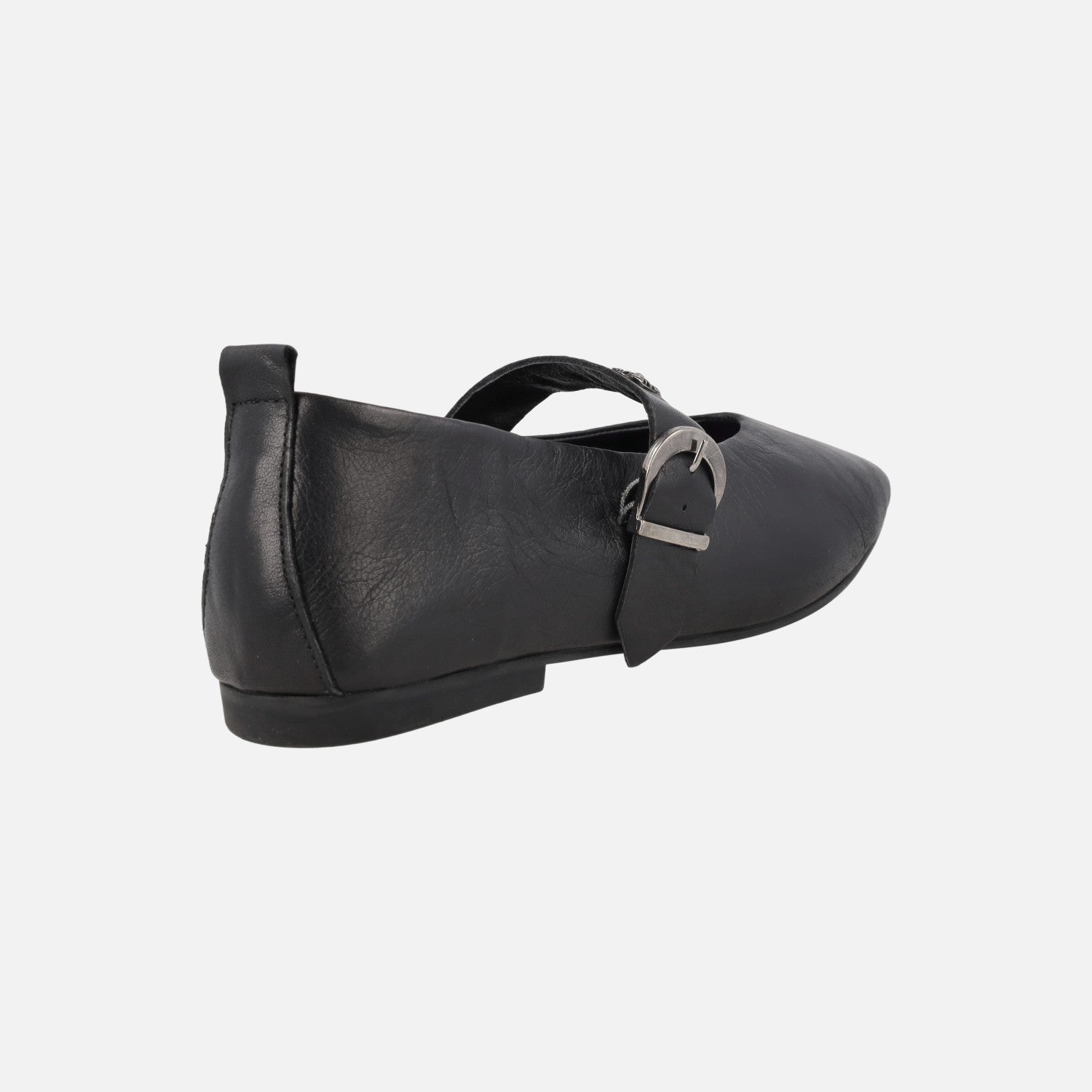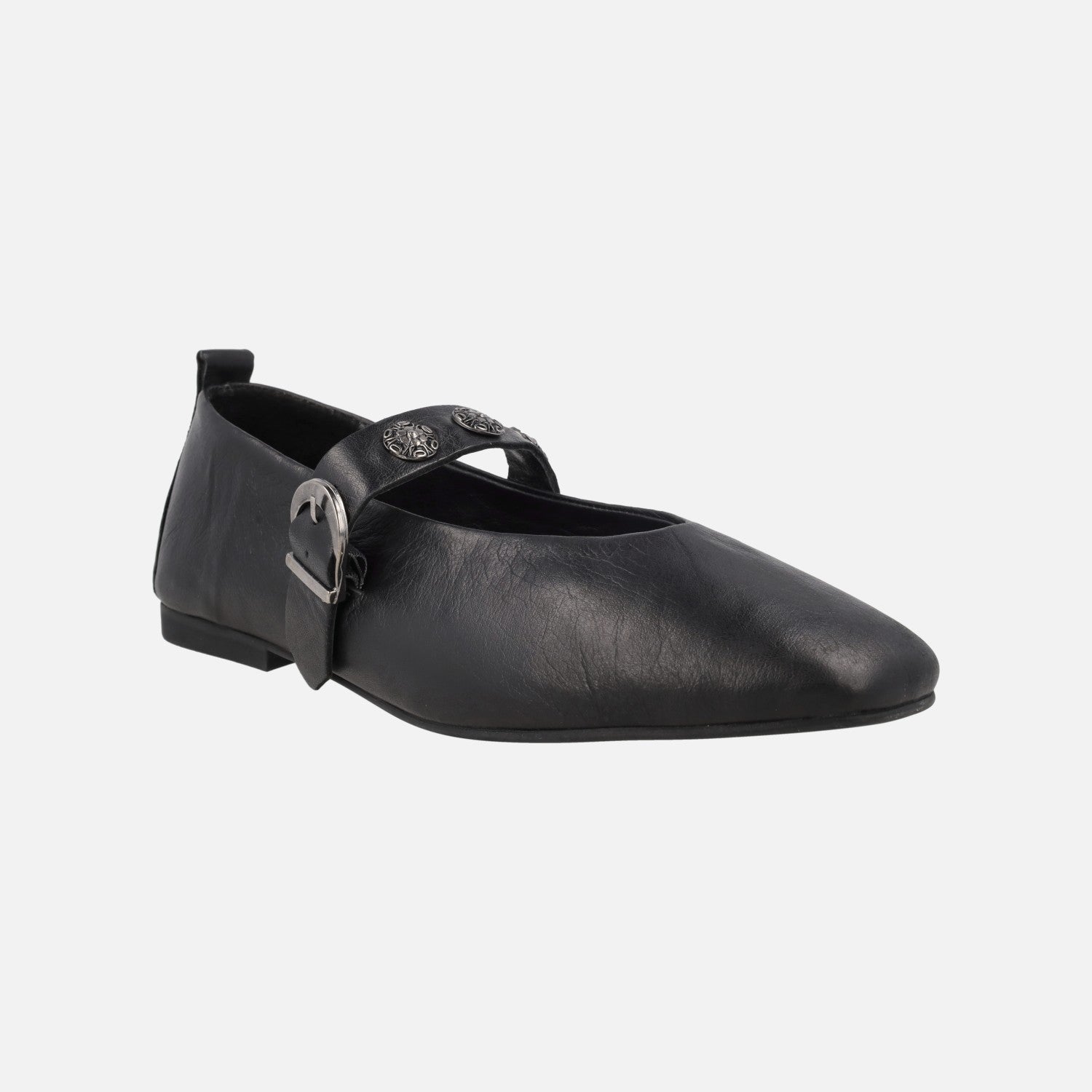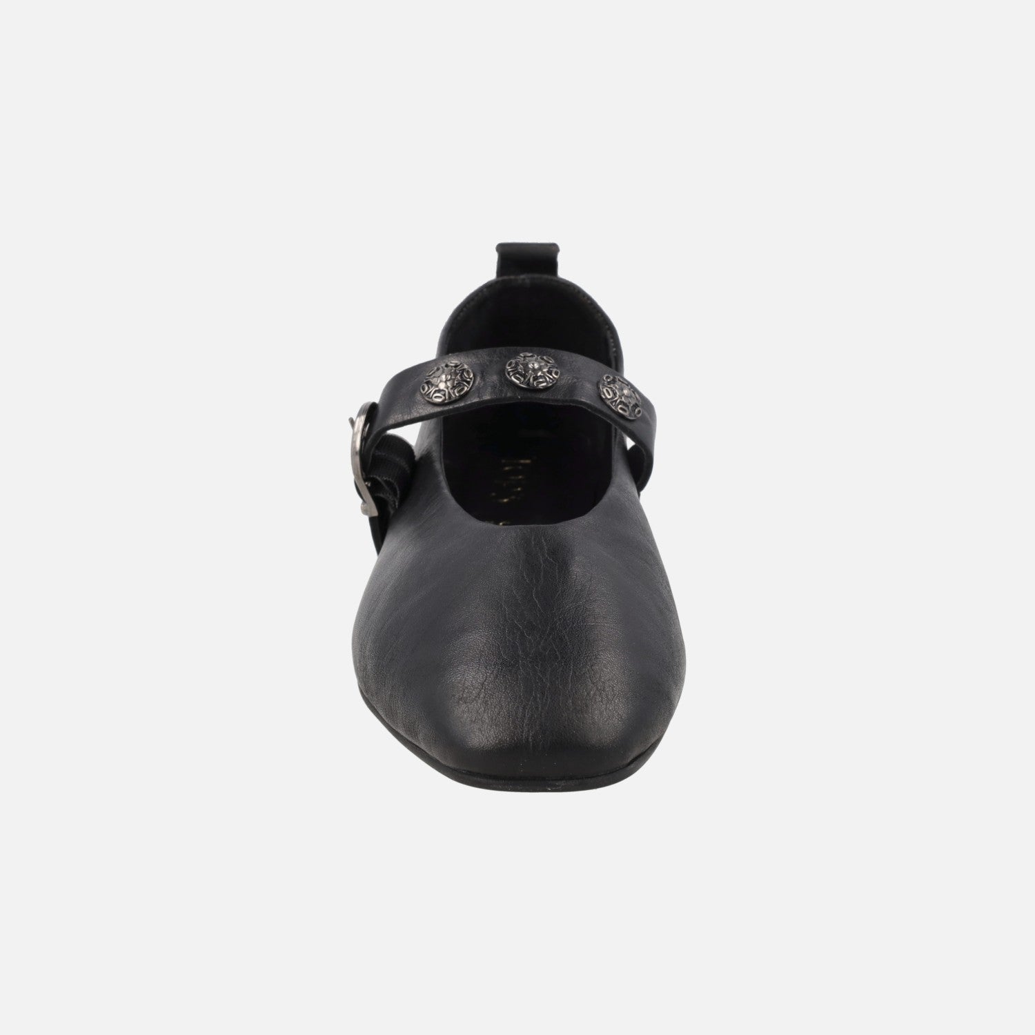 Bailarinas negras de piel modelo 726 de la marca Top3. Bailarinas estilo mercedes, elaboradas en piel negra con una tira que cruza el empeine y cierra con hebilla. Además la tira tiene varios adornos metálicos plateados. Interiores forrados de piel. Piso fino de goma, de apenas 1 cm.