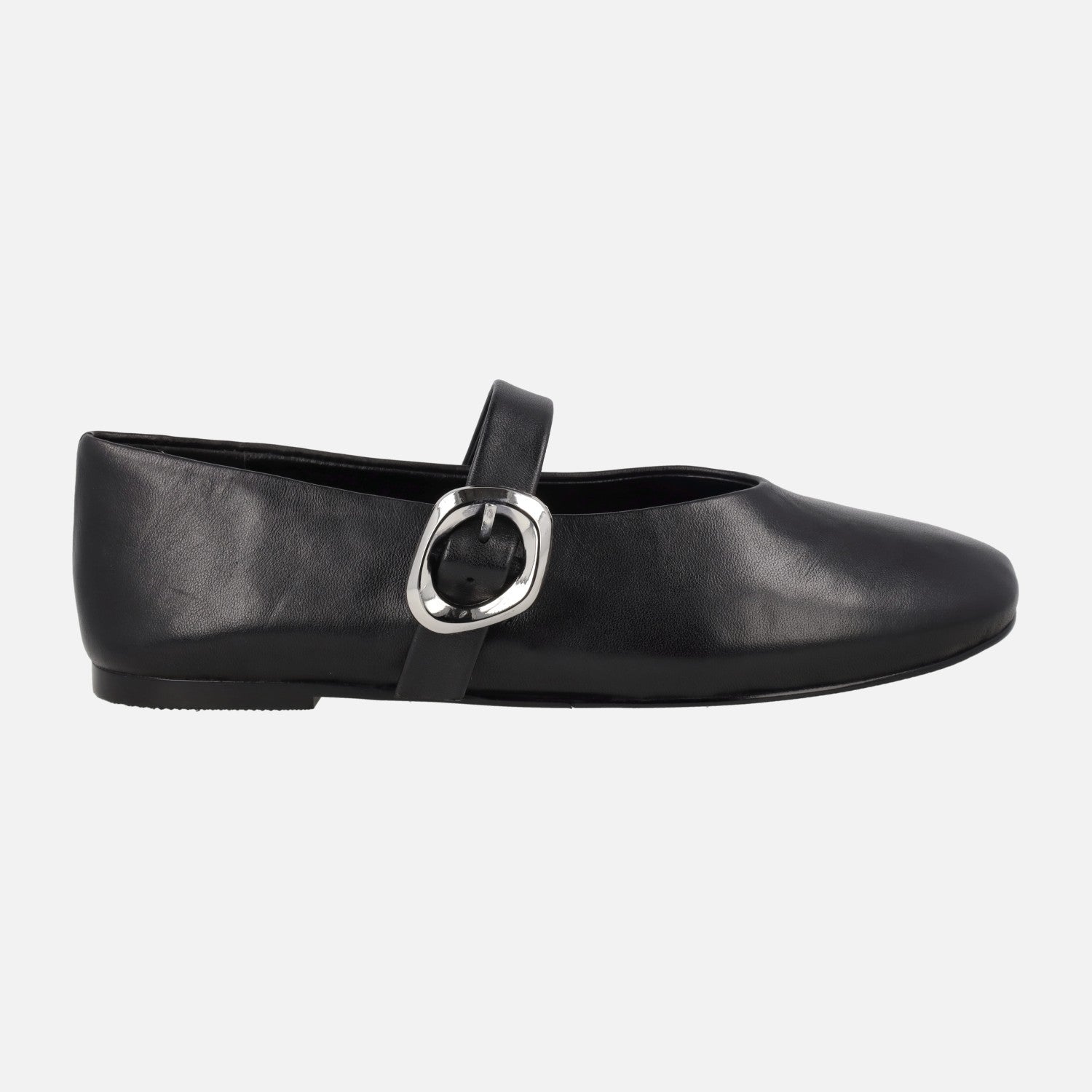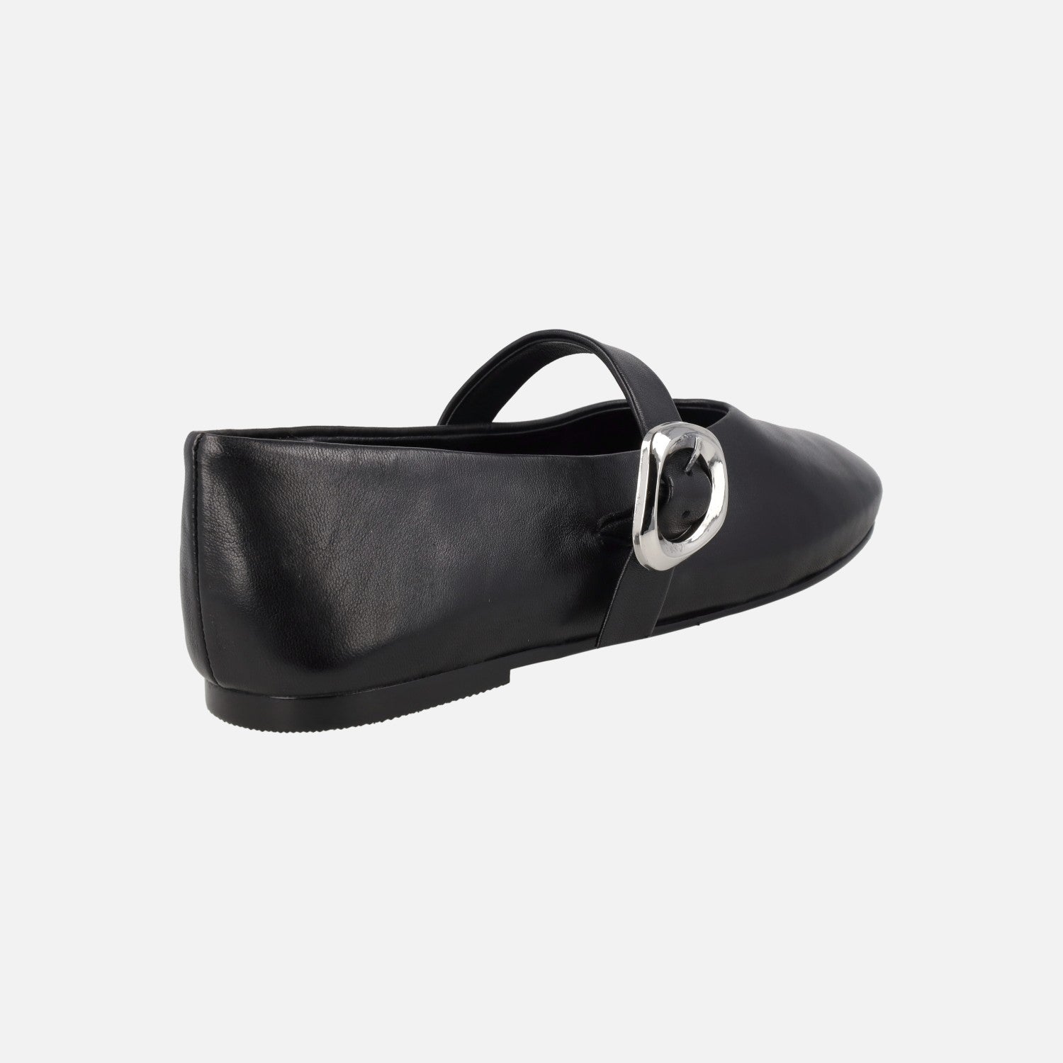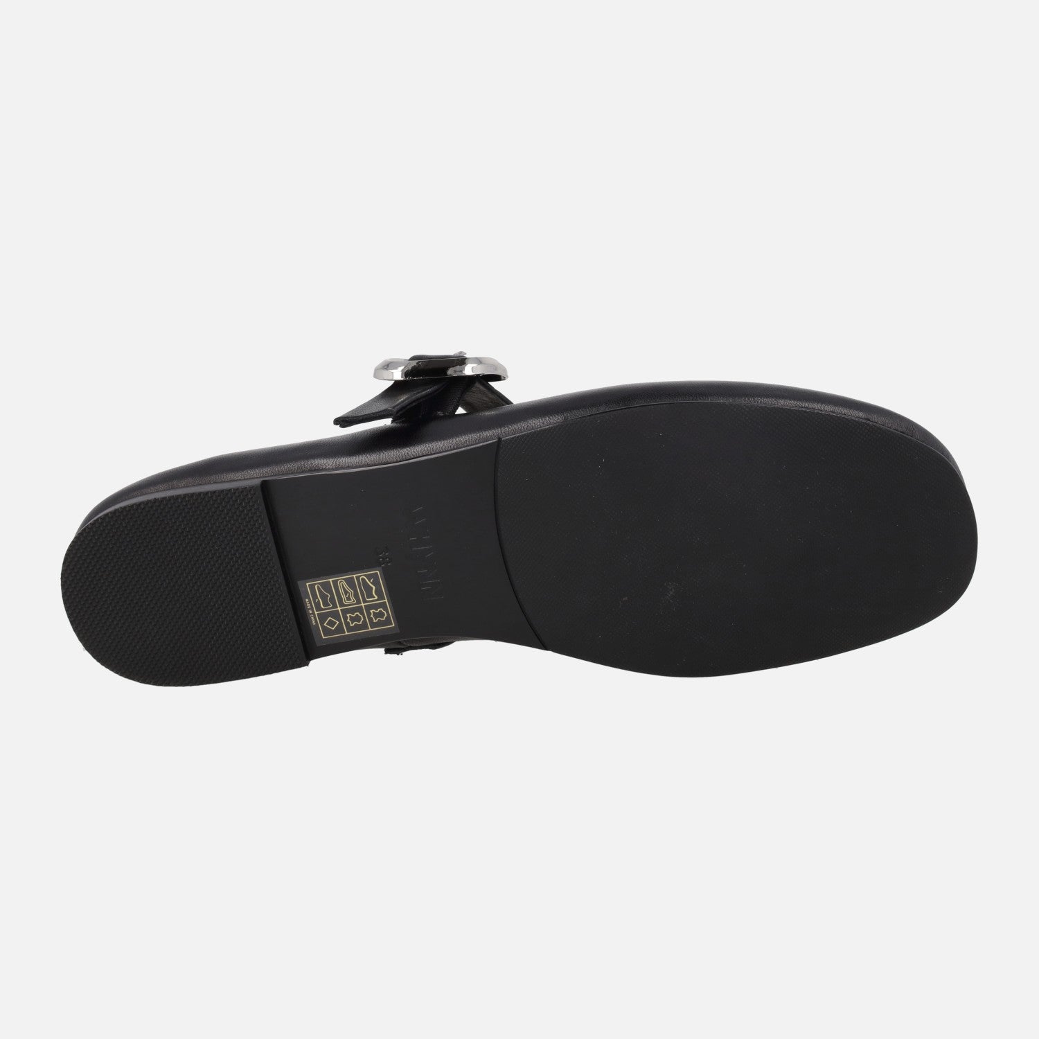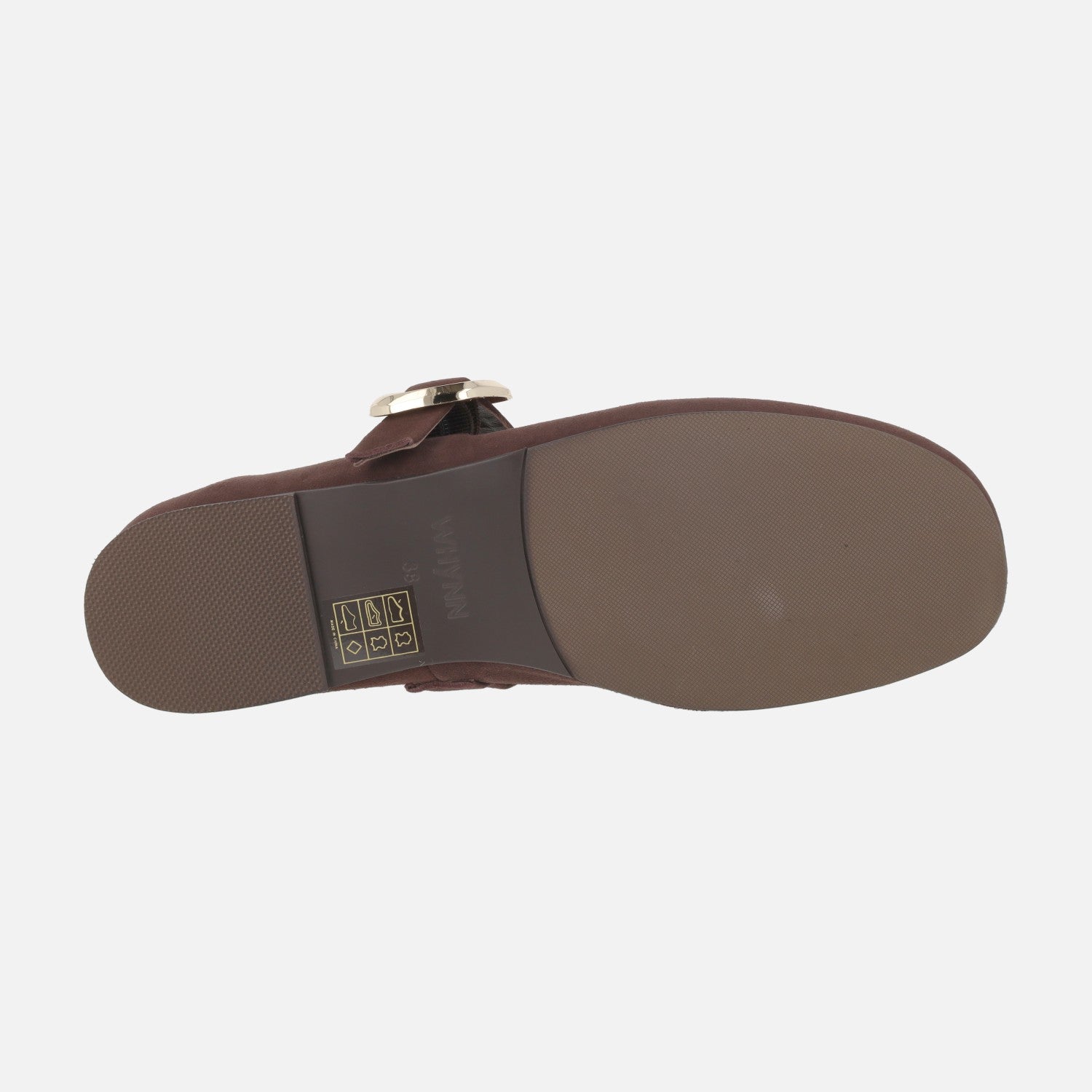 Merceditas plano para mujer de la marca Whynn, modelo Atenas. La pulsera lleva una hebilla plateada a modo de cierre. El forro y plantillas son de piel y el piso sintético. Disponibles en Napa negra y en Ante Burdeos Oscuro (amarronado). Tipo de zapato muy versátil y cómodo que se va adaptando a cada tendencia.