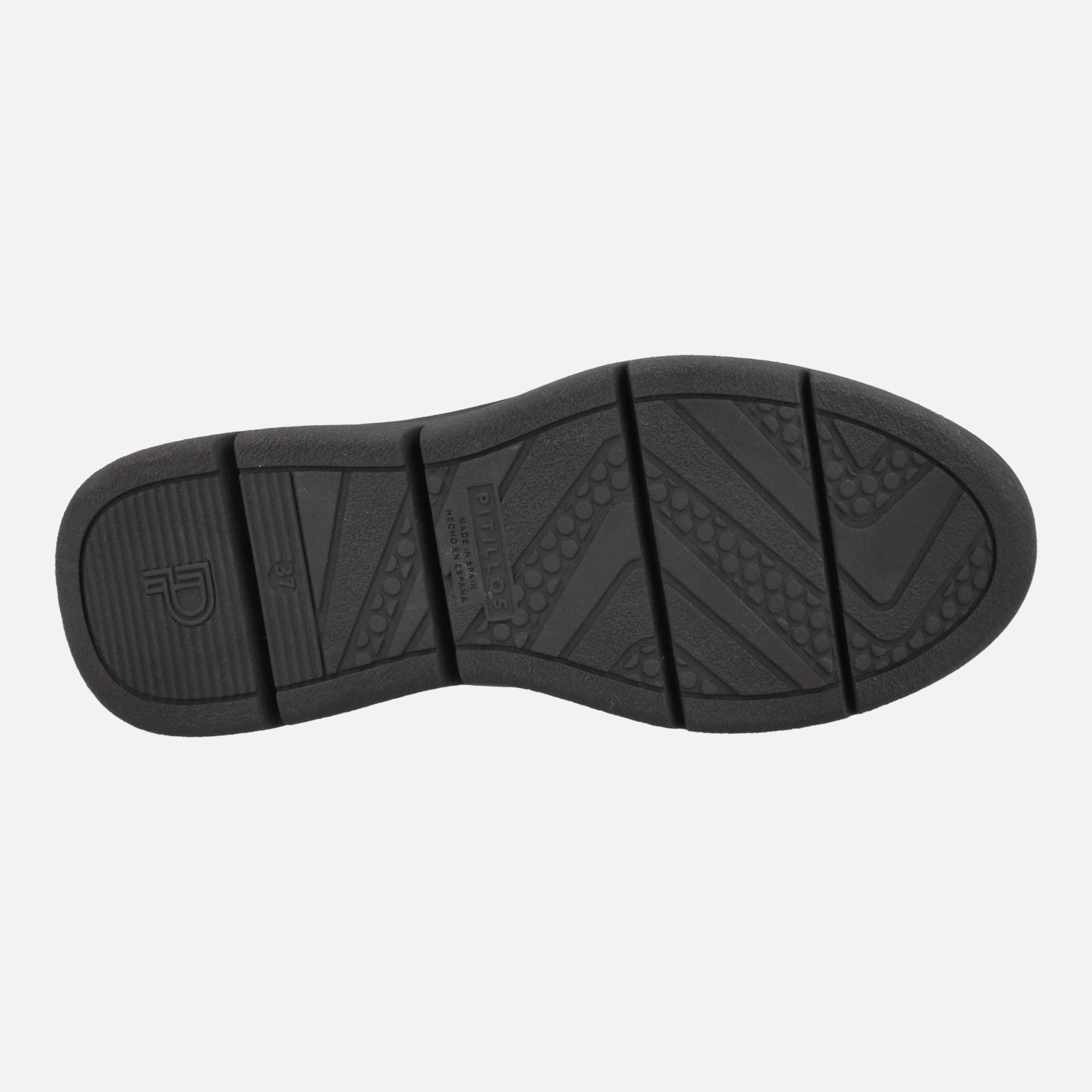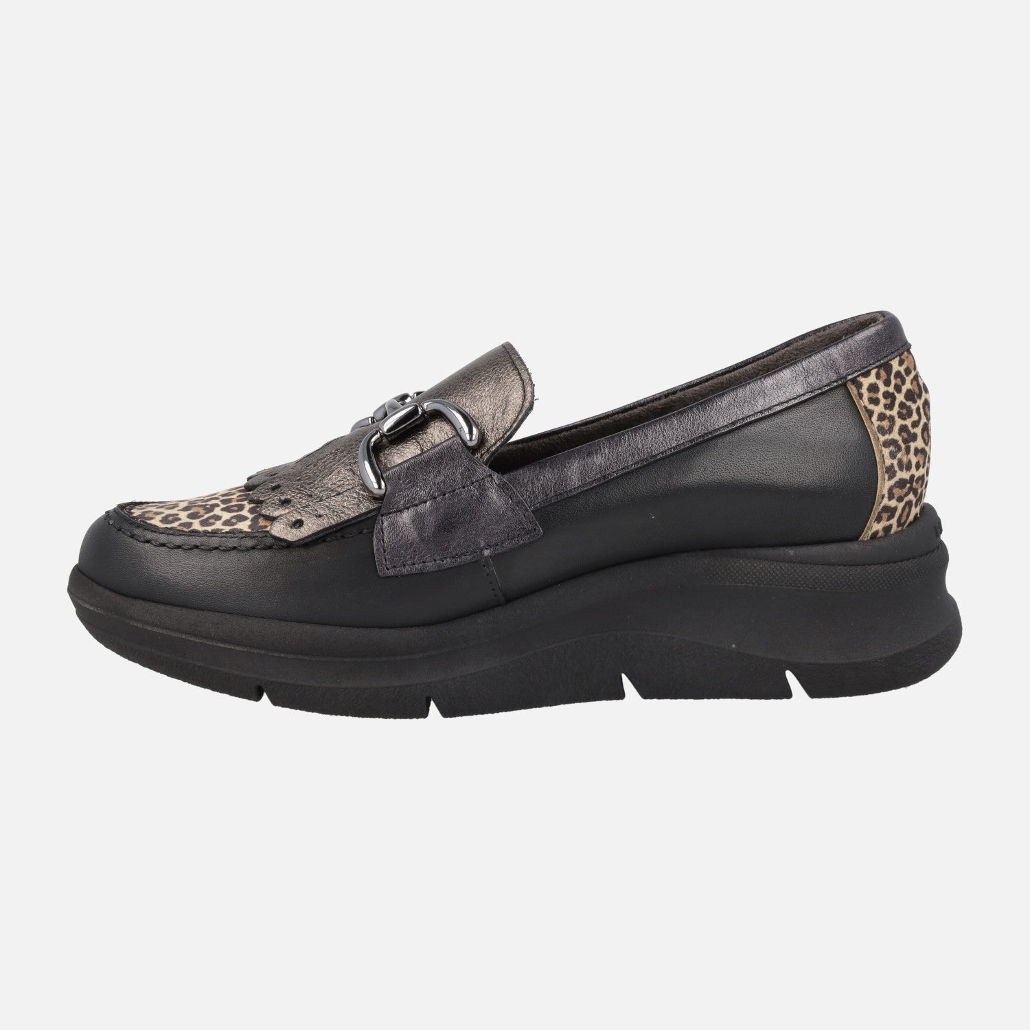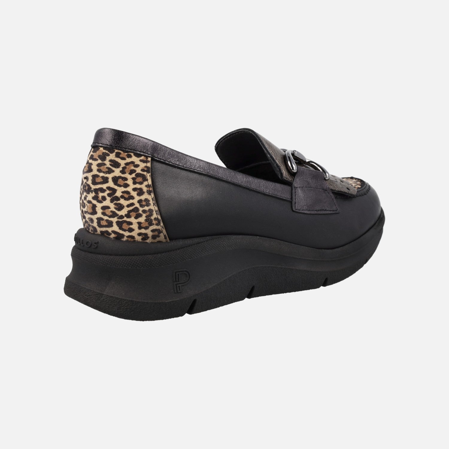 Mocasines confort para mujer de la marca Pitillos, modelo 10753 Negro. Mocasines elaborados en piel y tejido, combinando negro, metalizados y animal print leopardo. Adorno metálico plateado. Interior textil con plantillas extraíbles. Piso de goma, de 4 cm de altura trasera (2 cm parte delantera). Made in SPain.