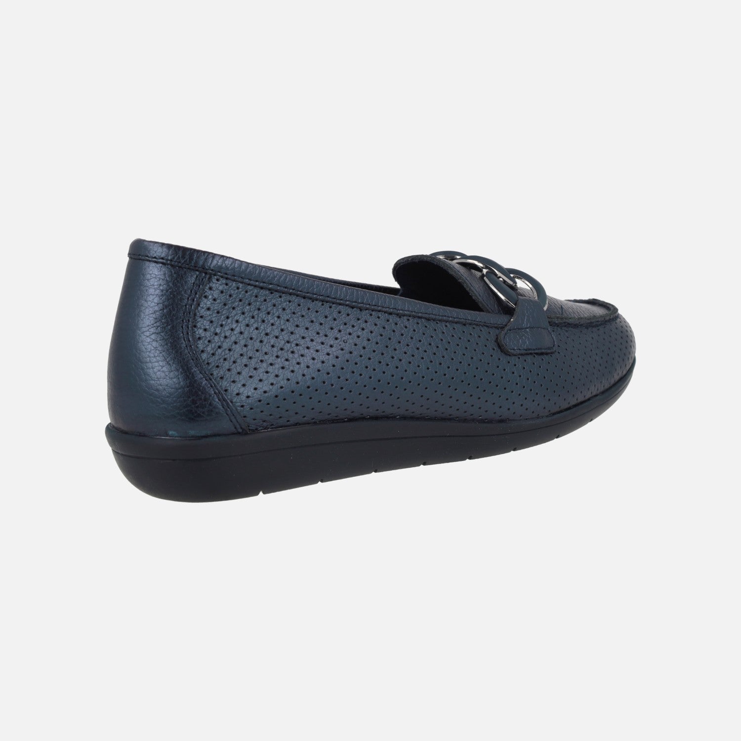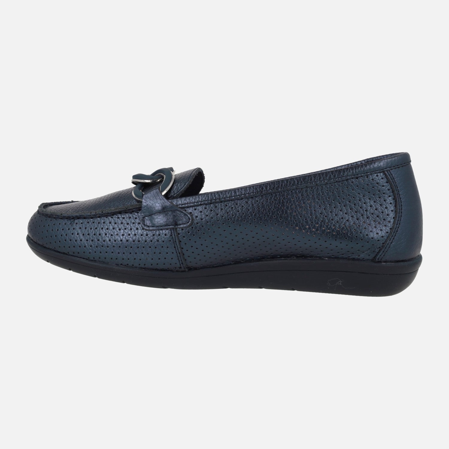 Mocasines confort para mujer de la marca española 24 Horas, modelo 26456, disponibles en beige y en azul marino metalizado. Mocasines de piel con calados, adorno metálico a modo de cadena en la pala. Interiores en piel con plantillas extraíbles. Suela sintética, de 2,5 cm de altura en la parte de atrás.