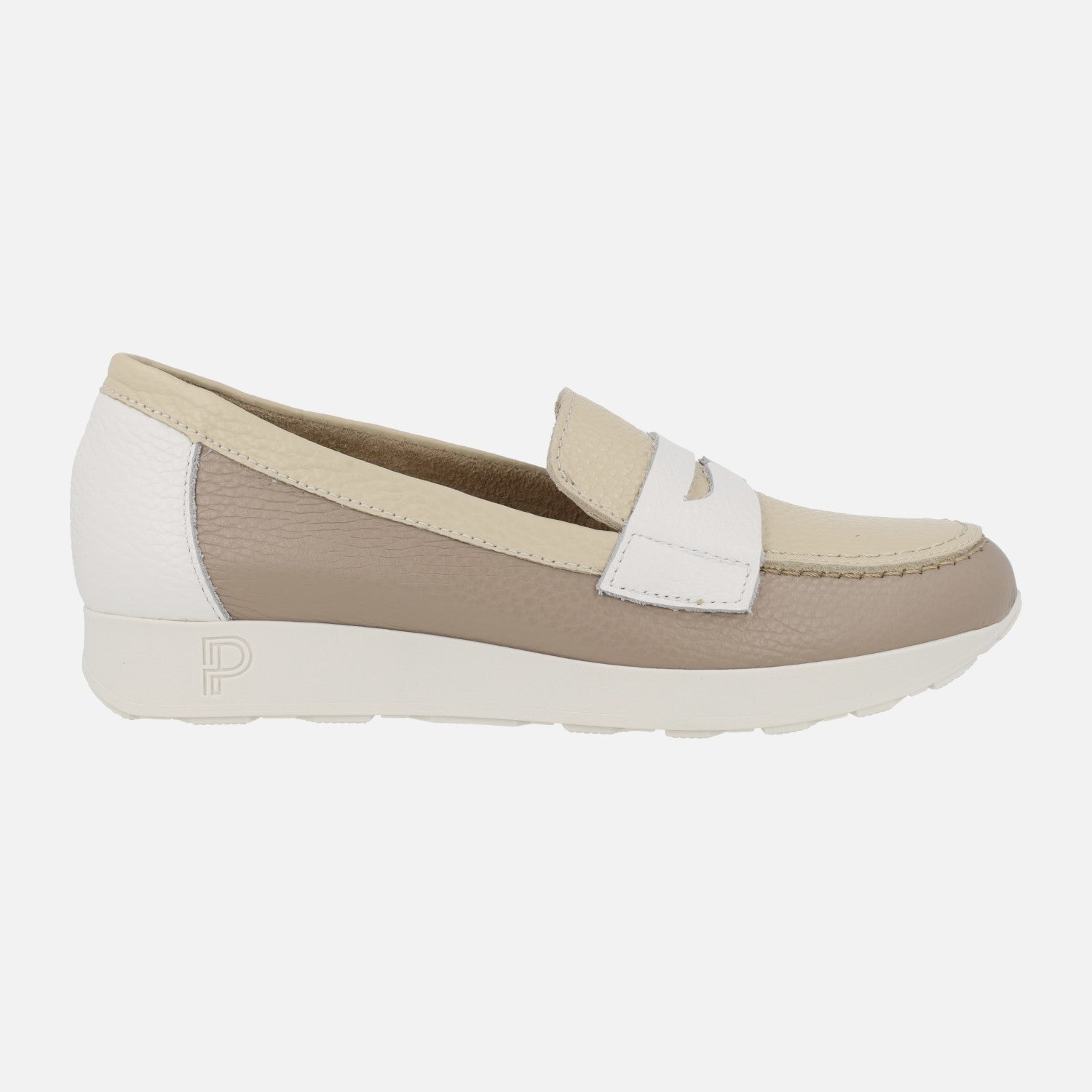 Mocasines confort para mujer de la marca Pitillos, modelo 11100 Piedra. Mocasines de piel con adorno de antifaz, que combinan blanco, crema y taupe. Interior textil con plantillas extraíbles. Piso sintético con 3 cm de altura trasera (2 cm parte delantera).