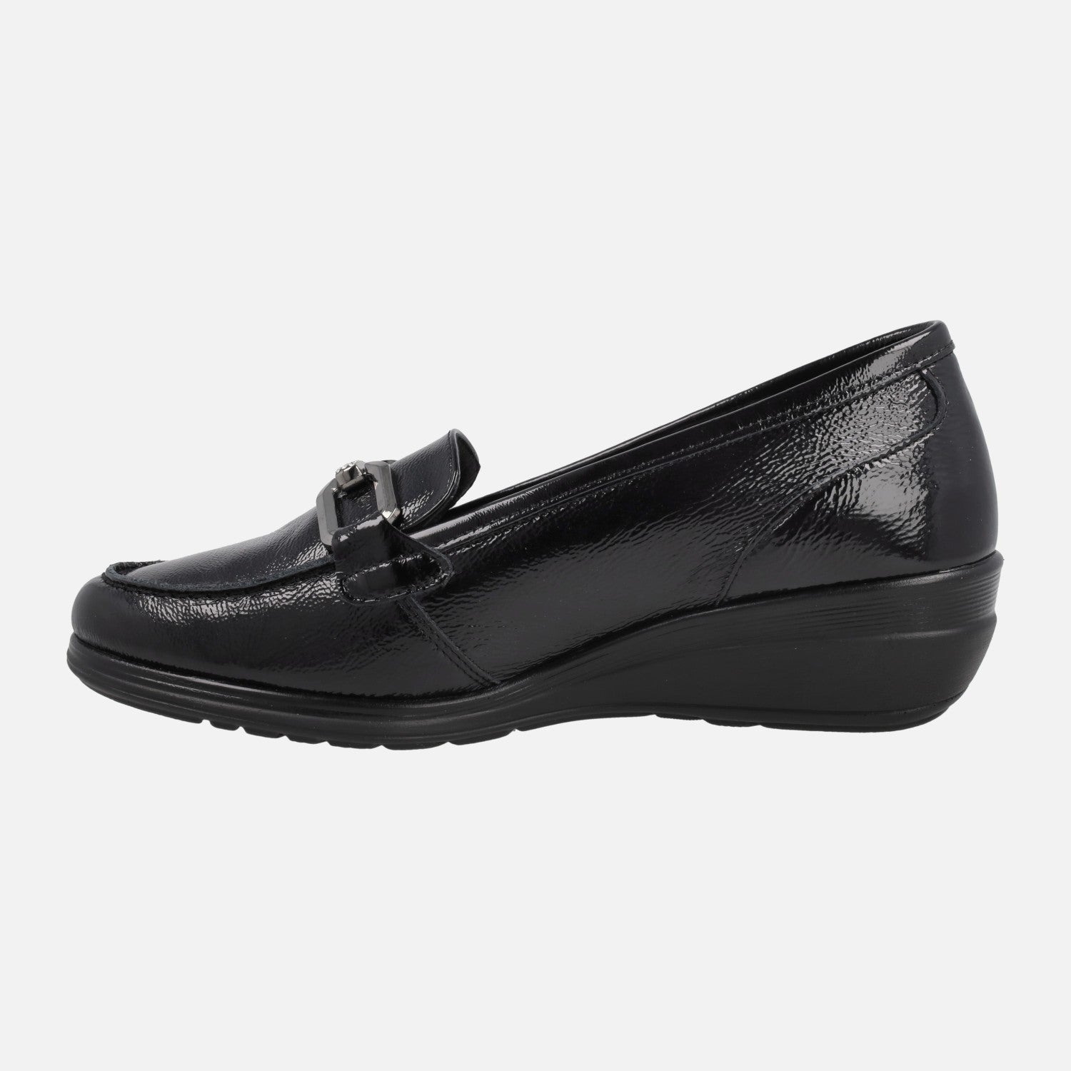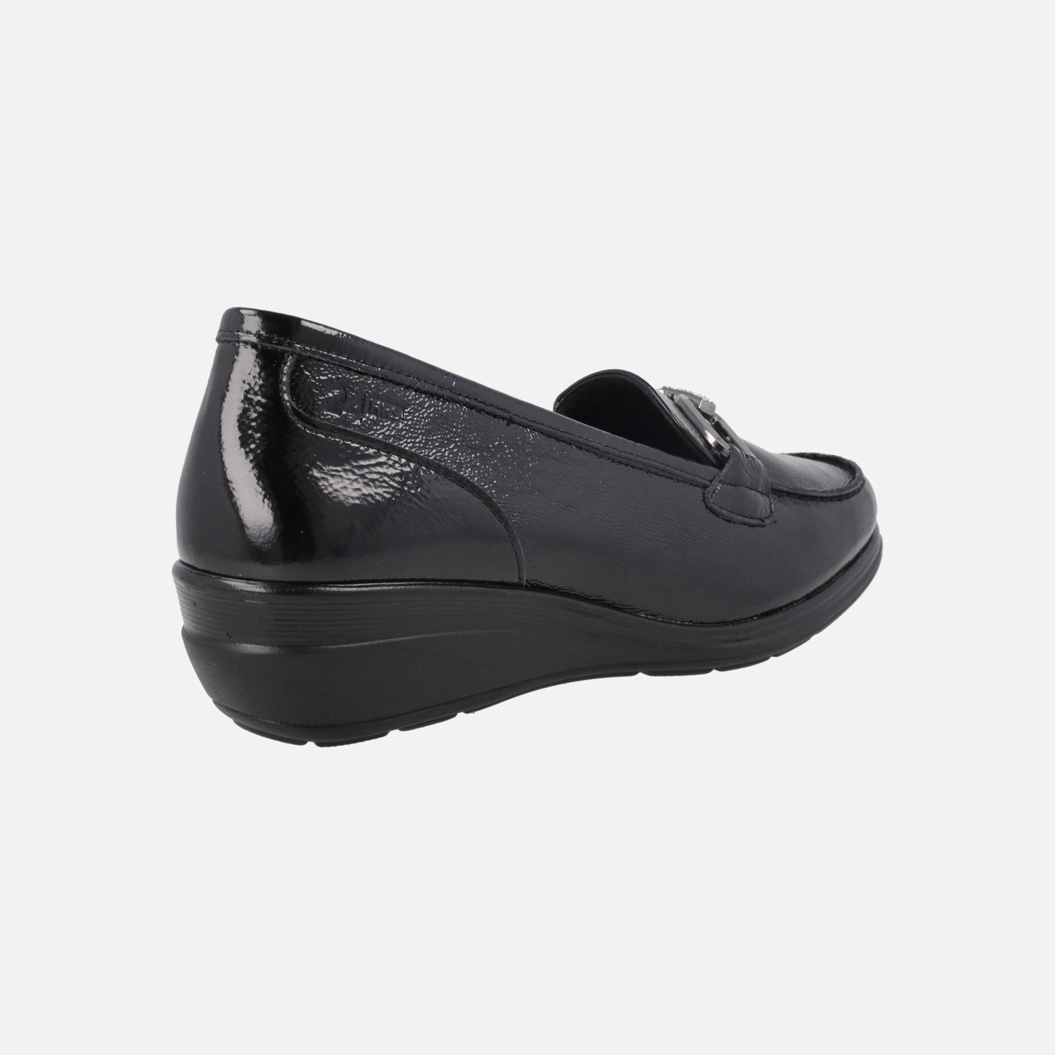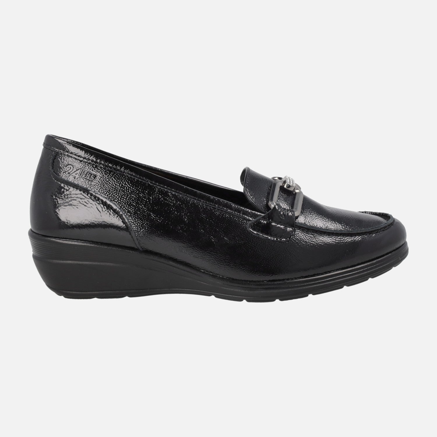 Mocasines confort en charol negro con cuña baja y adorno metálico