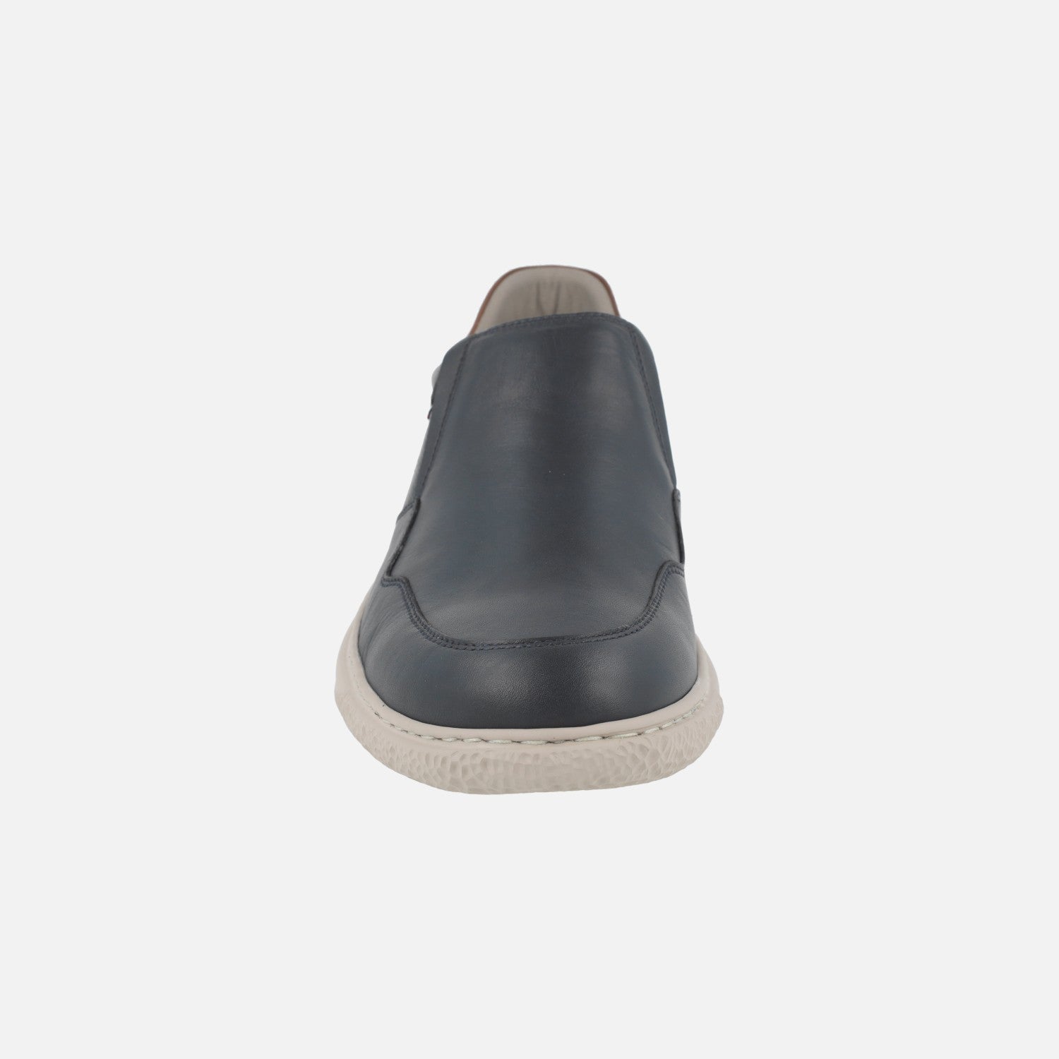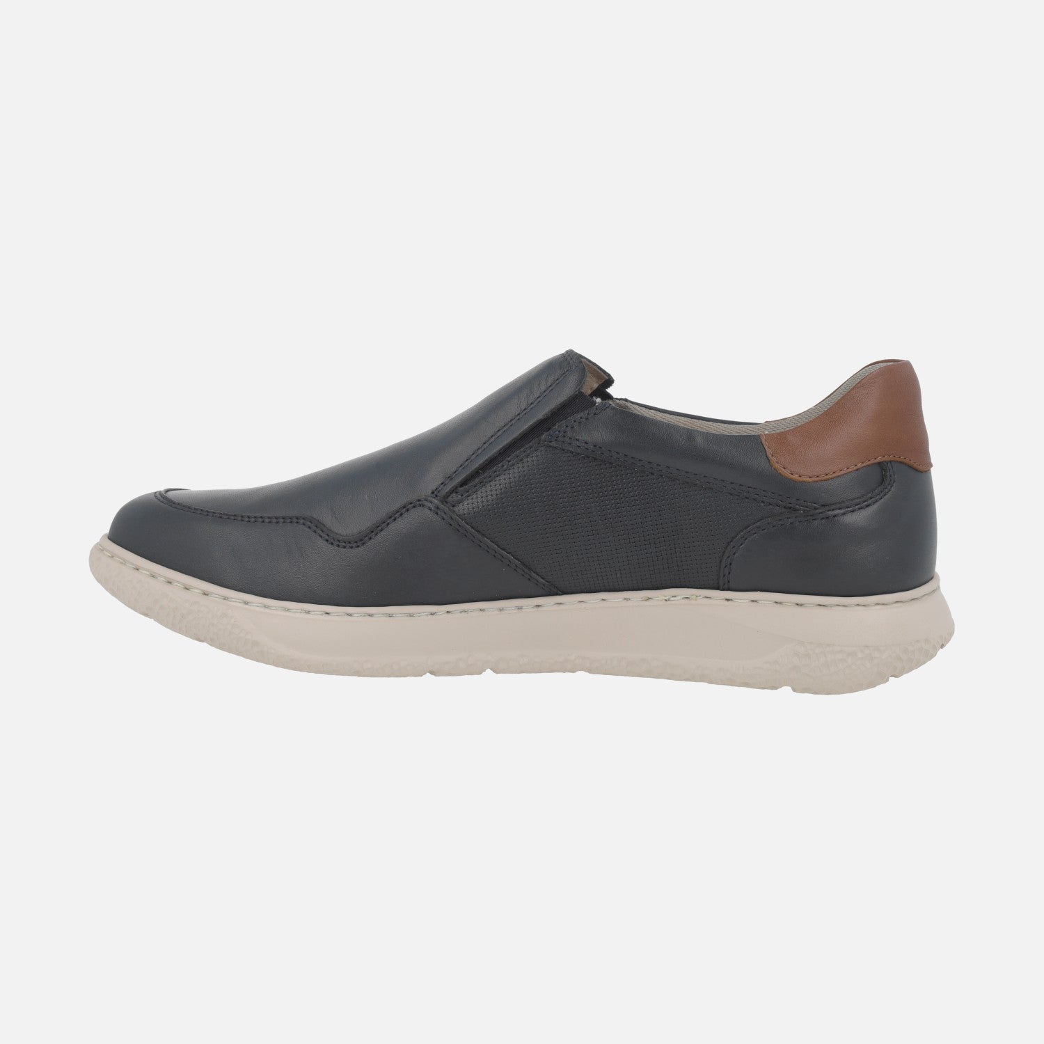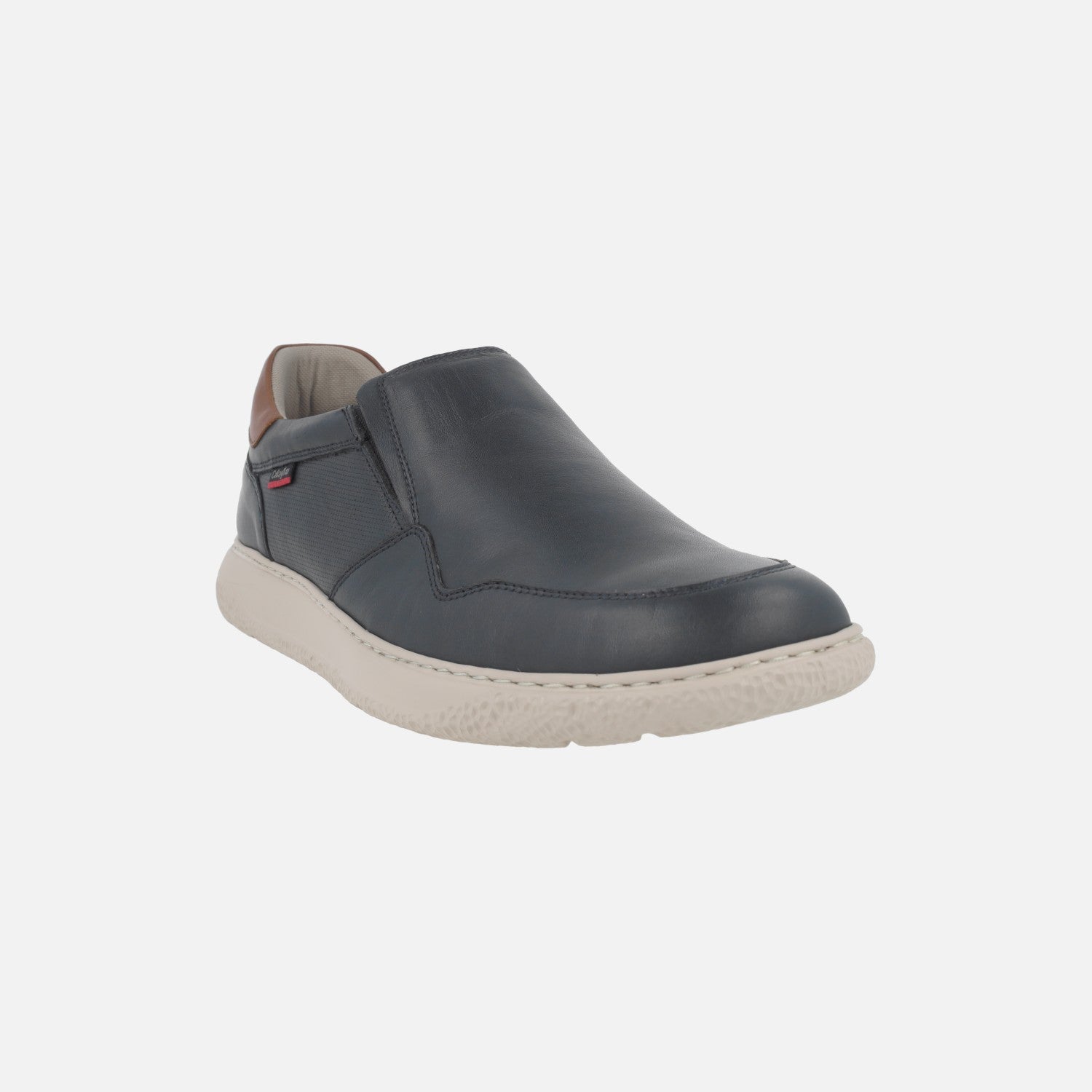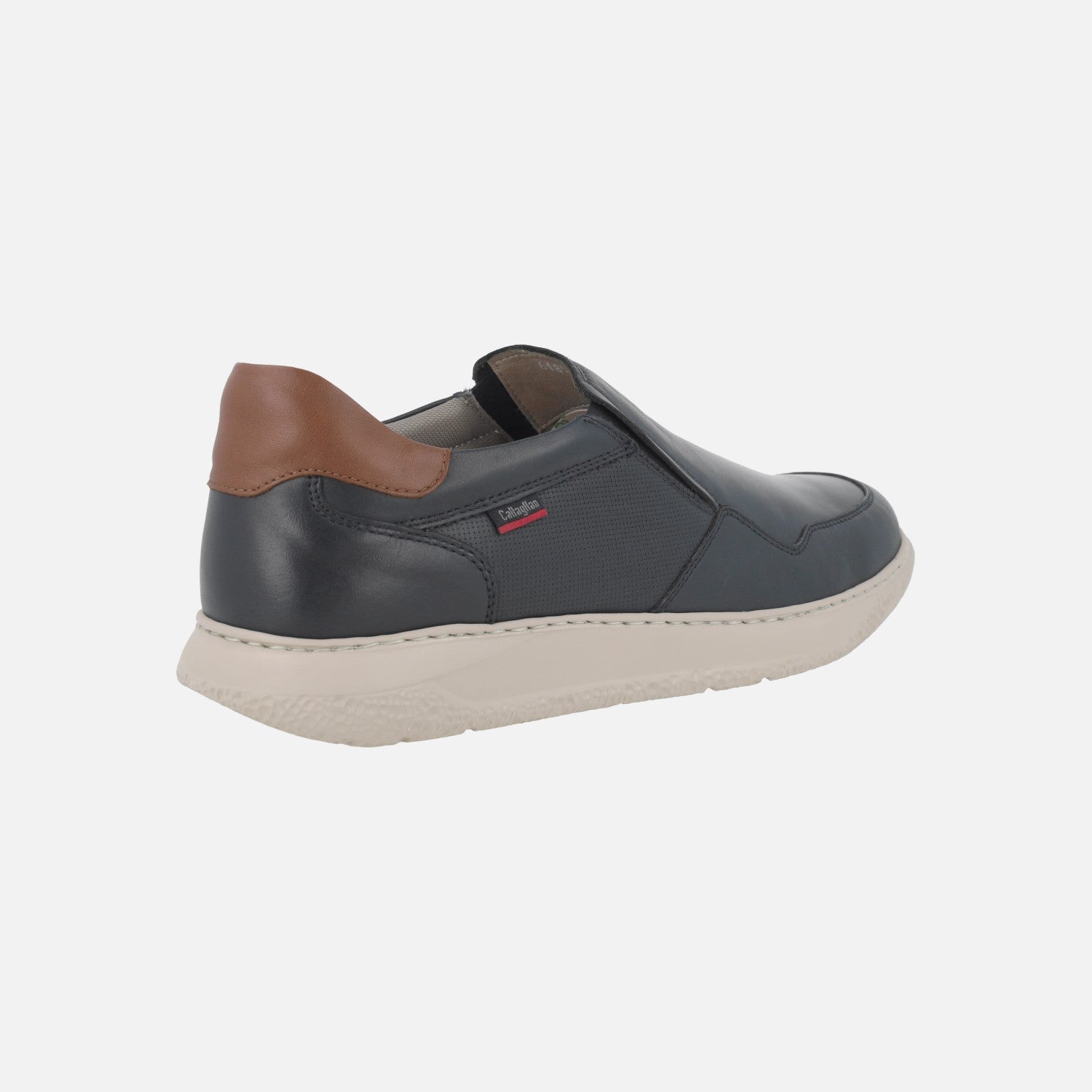 Mocasines confort para hombre de la marca Callaghan modelo 61804 Marino. Mocasines de piel azul marino, con detalles en marrón. Elásticos laterales, para mejor calce y sujeción. Interior textil, con plantillas extraíbles. Piso sintético ultralight.