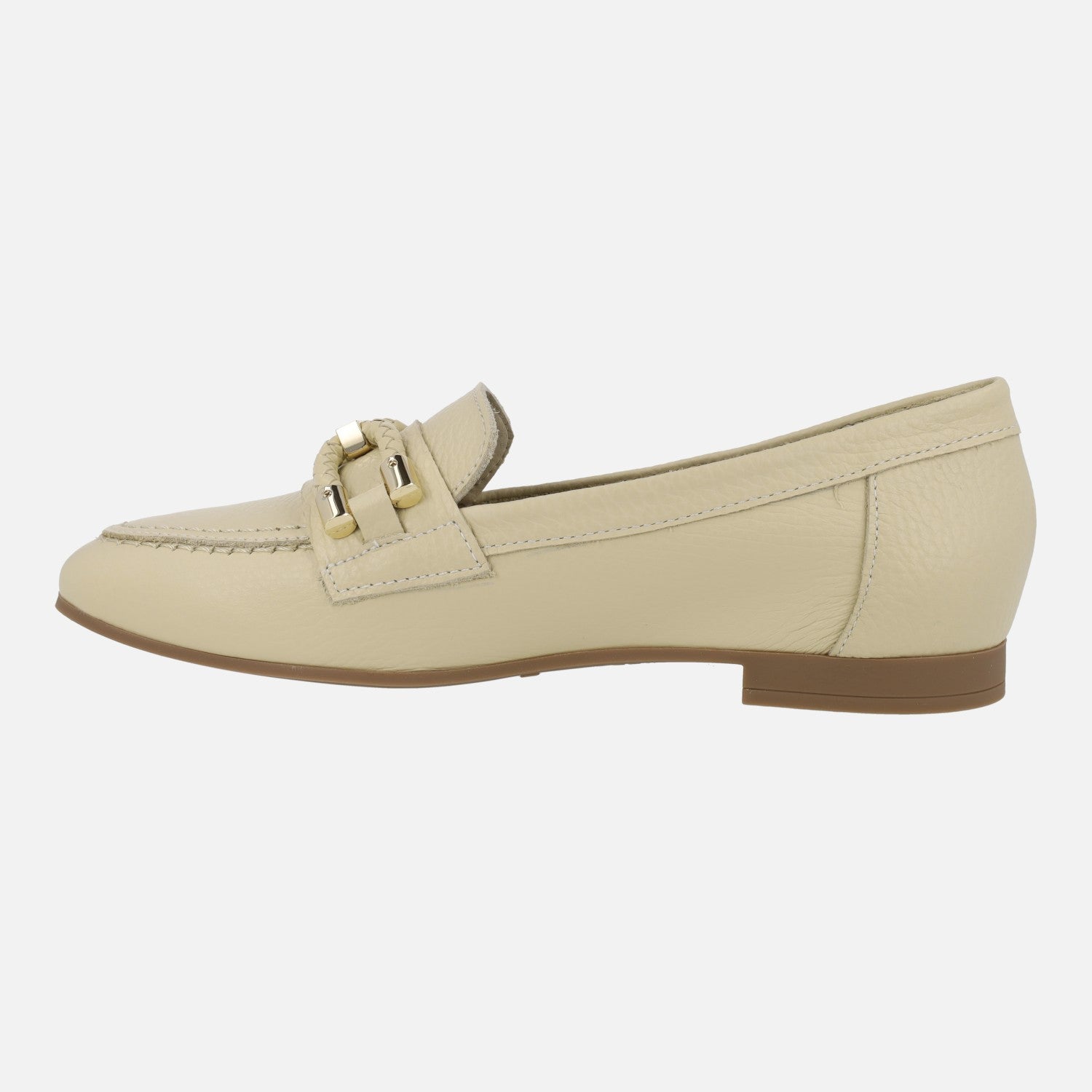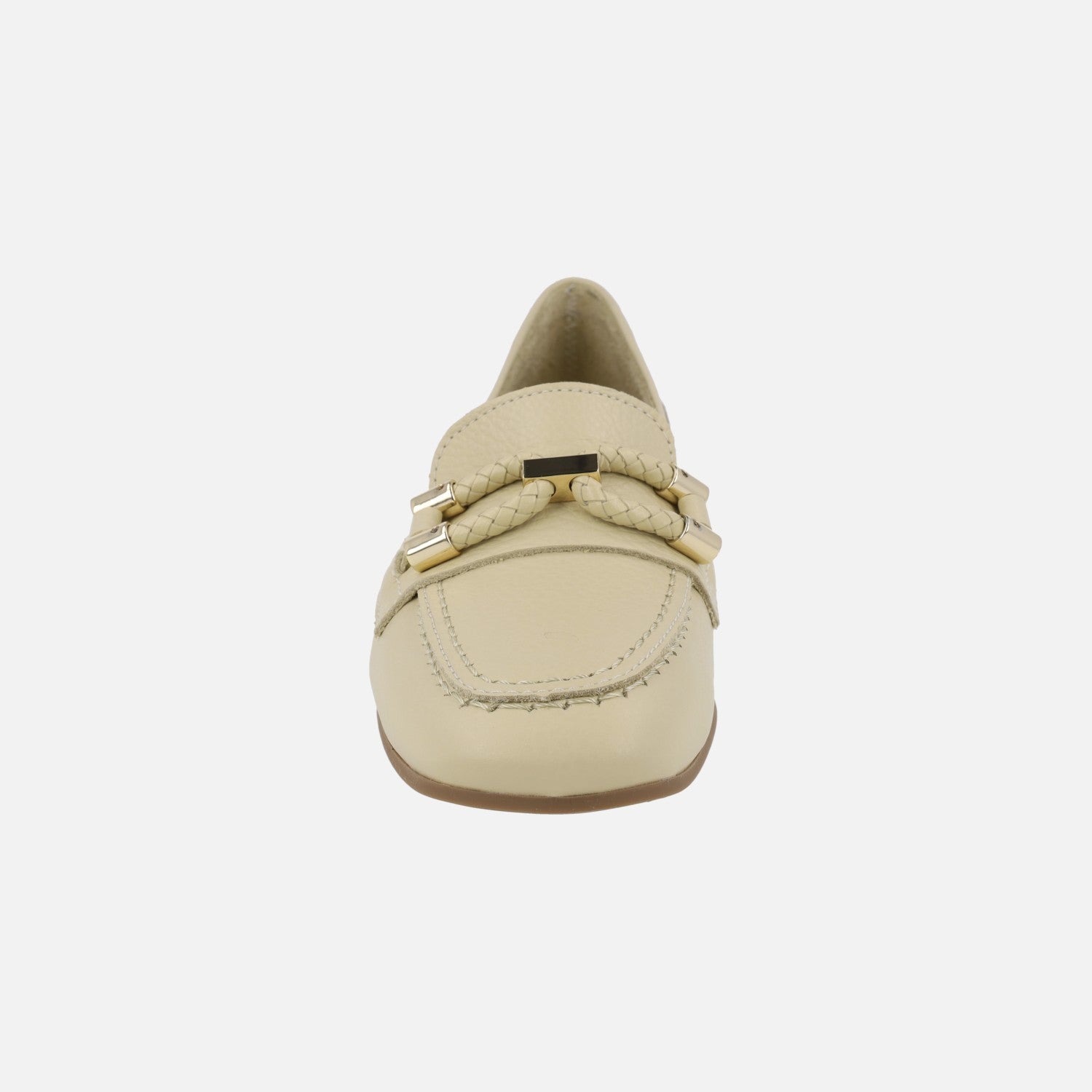 Mocasines bajos de piel de la marca Pitillos modelo 11140 crema. Mocasines de piel color beige crema, con un adorno metálico y de piel trenzada en el empeine. Interior textil. Piso sintético con un tacón bajo de apenas 2 cm.