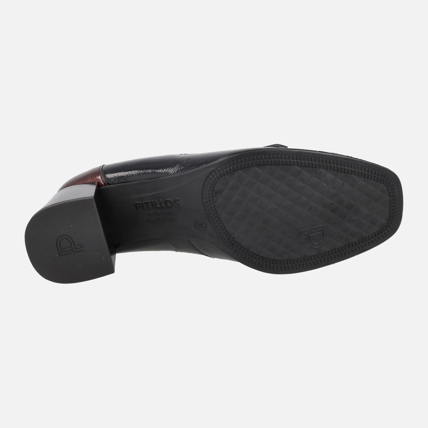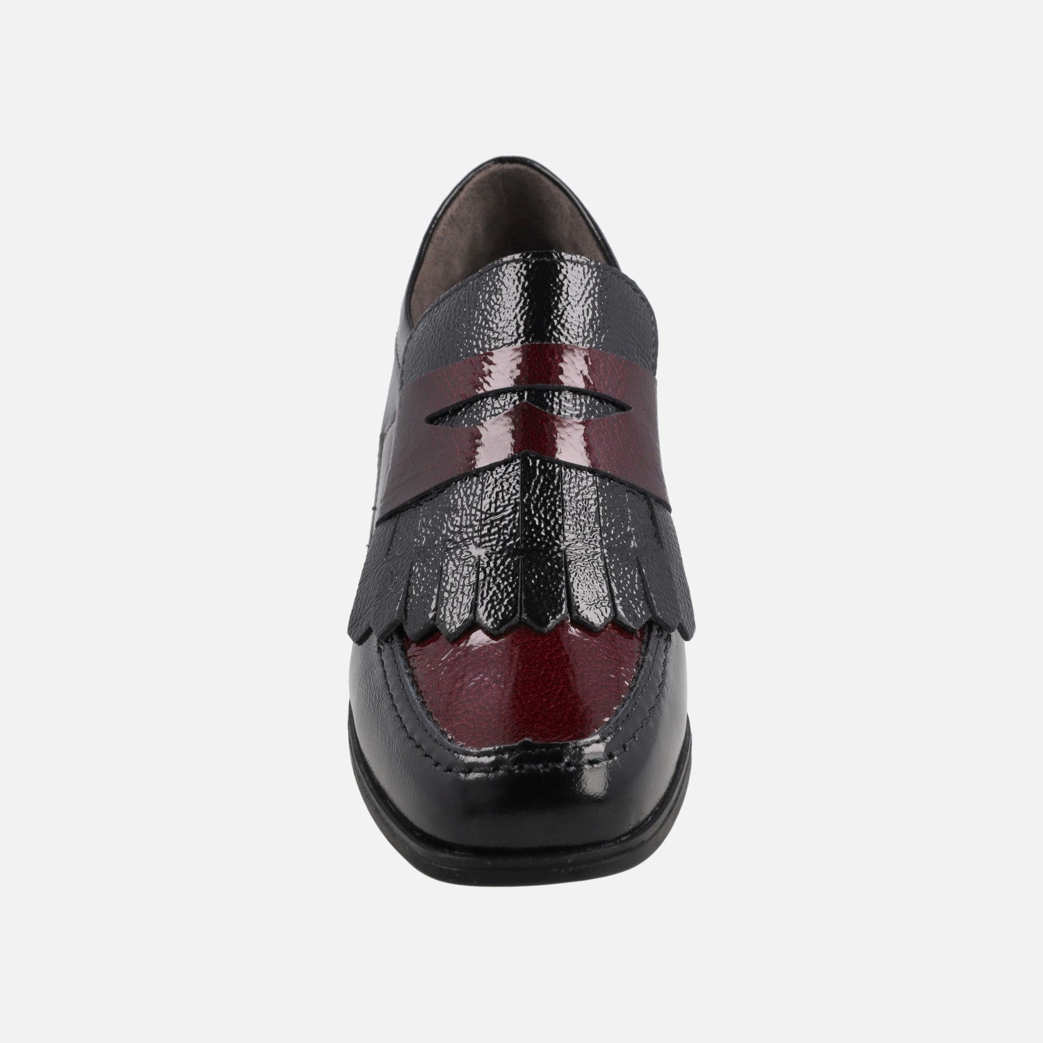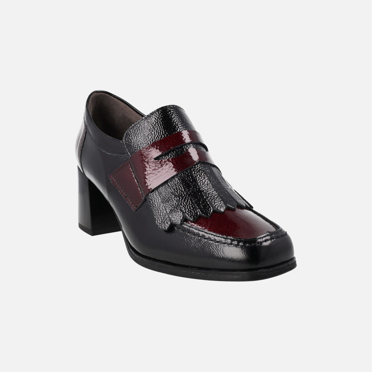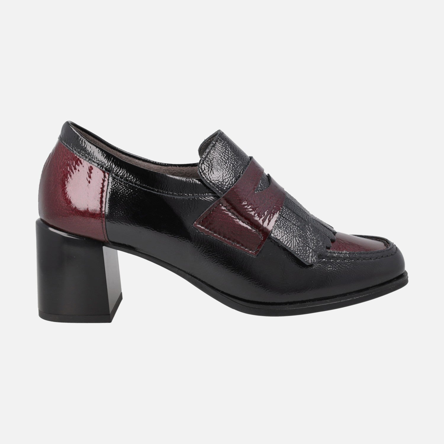 Zapatos mocasines de tacón de la marca Pitillos, modelo 10834 Negro/Burdeos. Mocasines de charol, con copete, antifaz y talonera en burdeos y resto del zapato en negro. Lleva una pieza con flecos en charol negro debajo del antifaz. Interior textil con plantillas extraíbles. Tacones anchos, de 6,5 cm de altura.