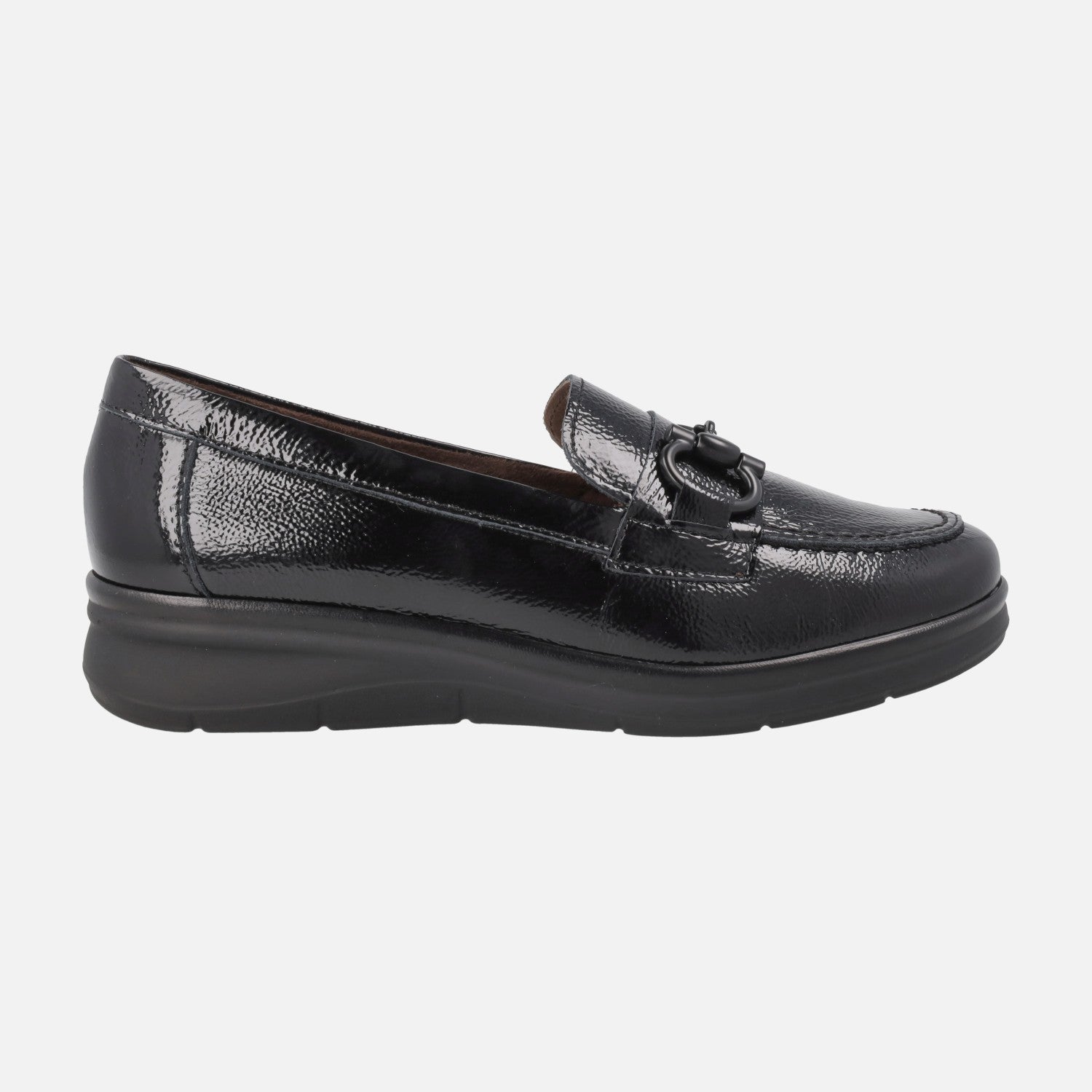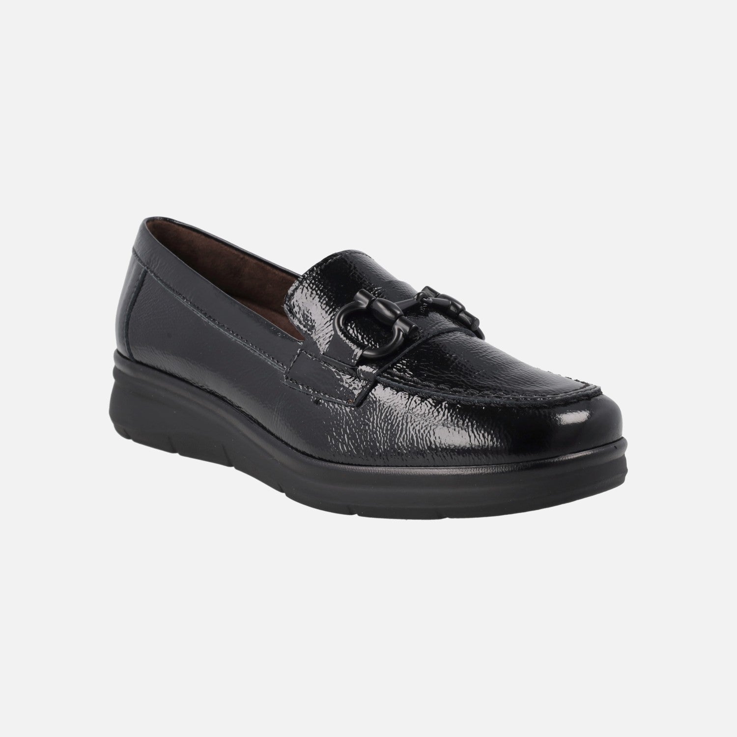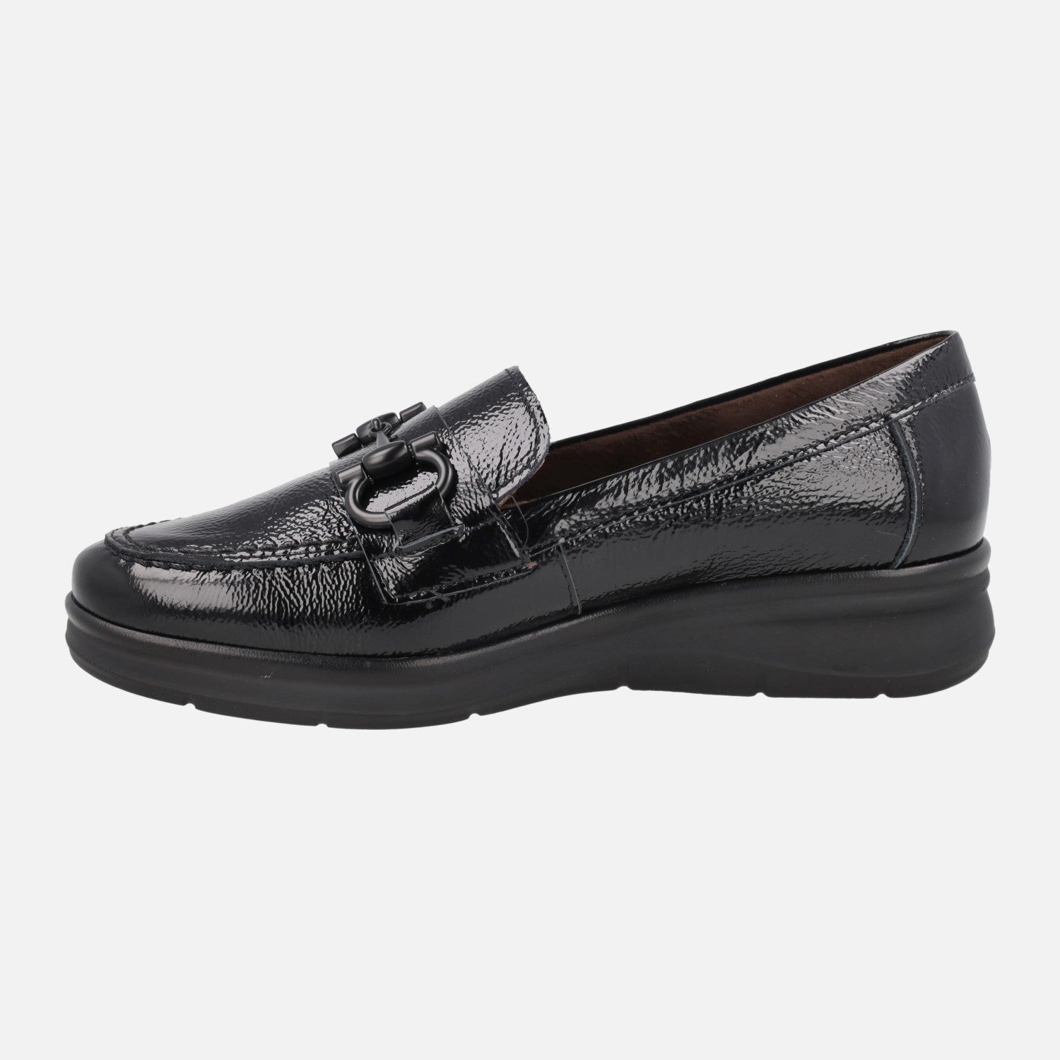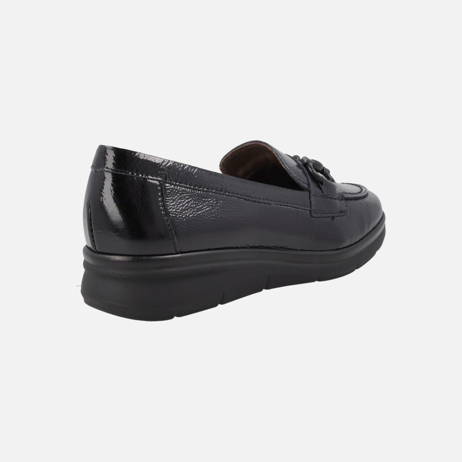Mocasines confort del modelo 10701 en piel charol color negro, con adorno metálico al tono. El  interior es textil. La plantilla es extraíble y también en tejido. El piso es sintético, con una cuña de 3,5 cm. de altura  en la parte trasera y 2 cm. en la parte delantera.