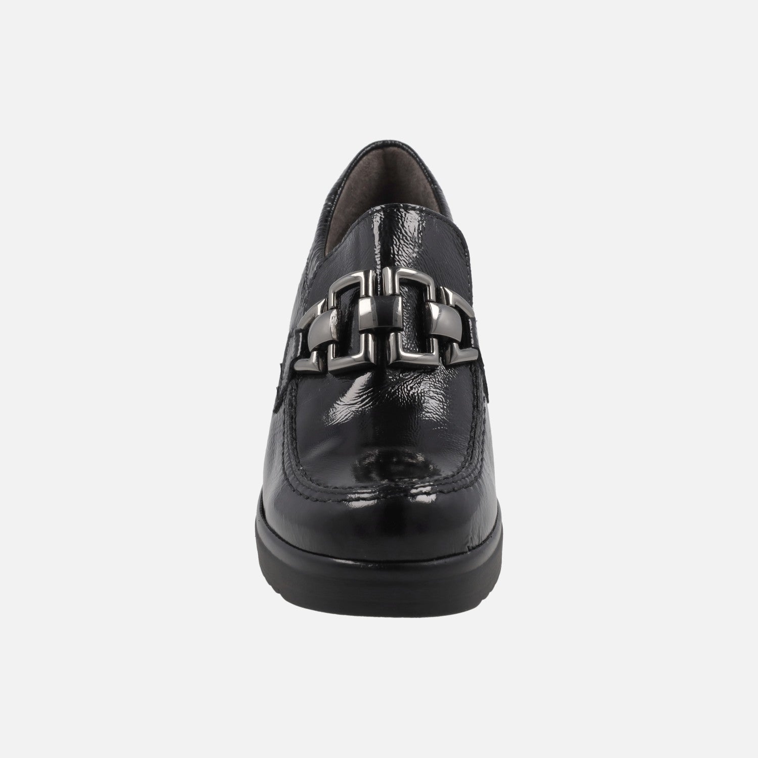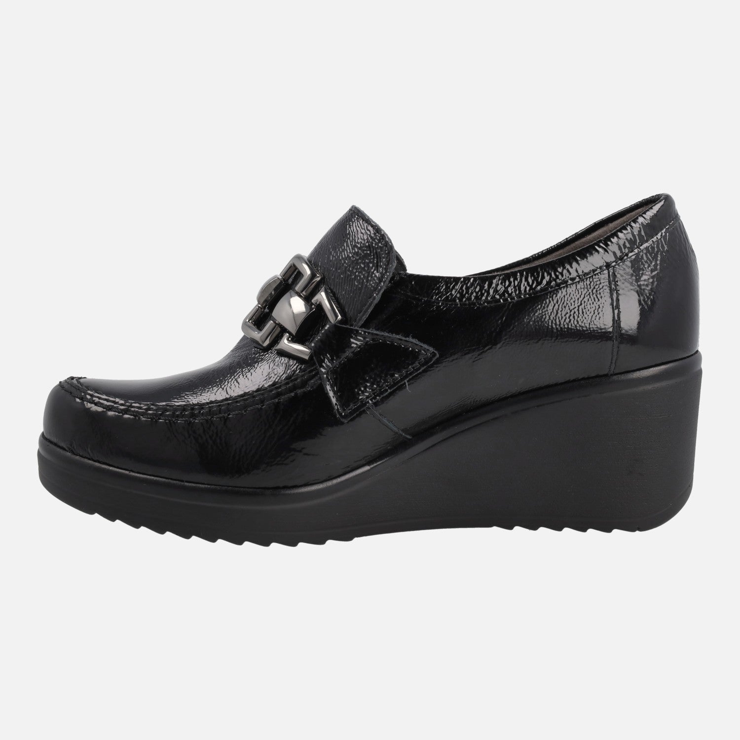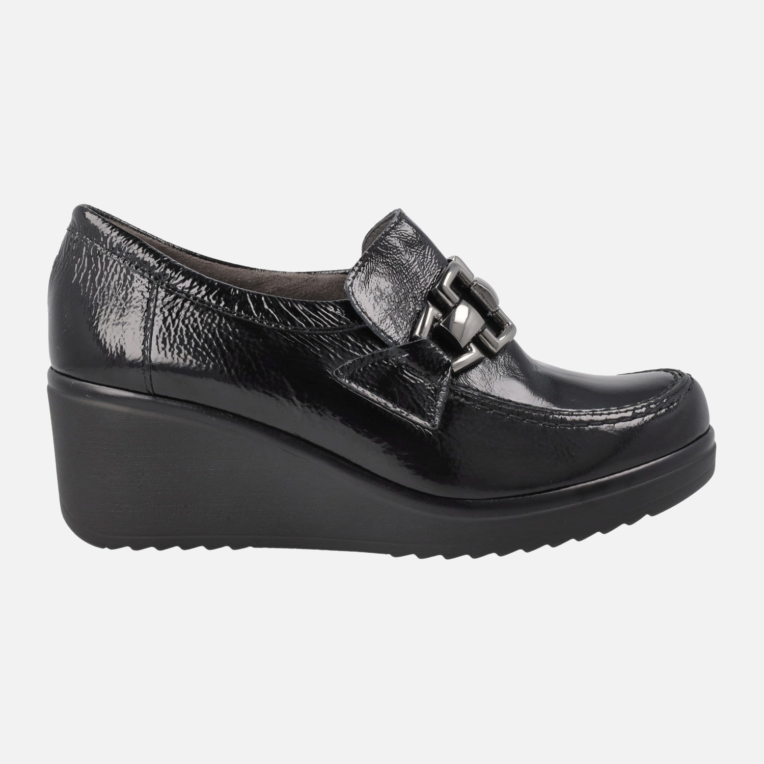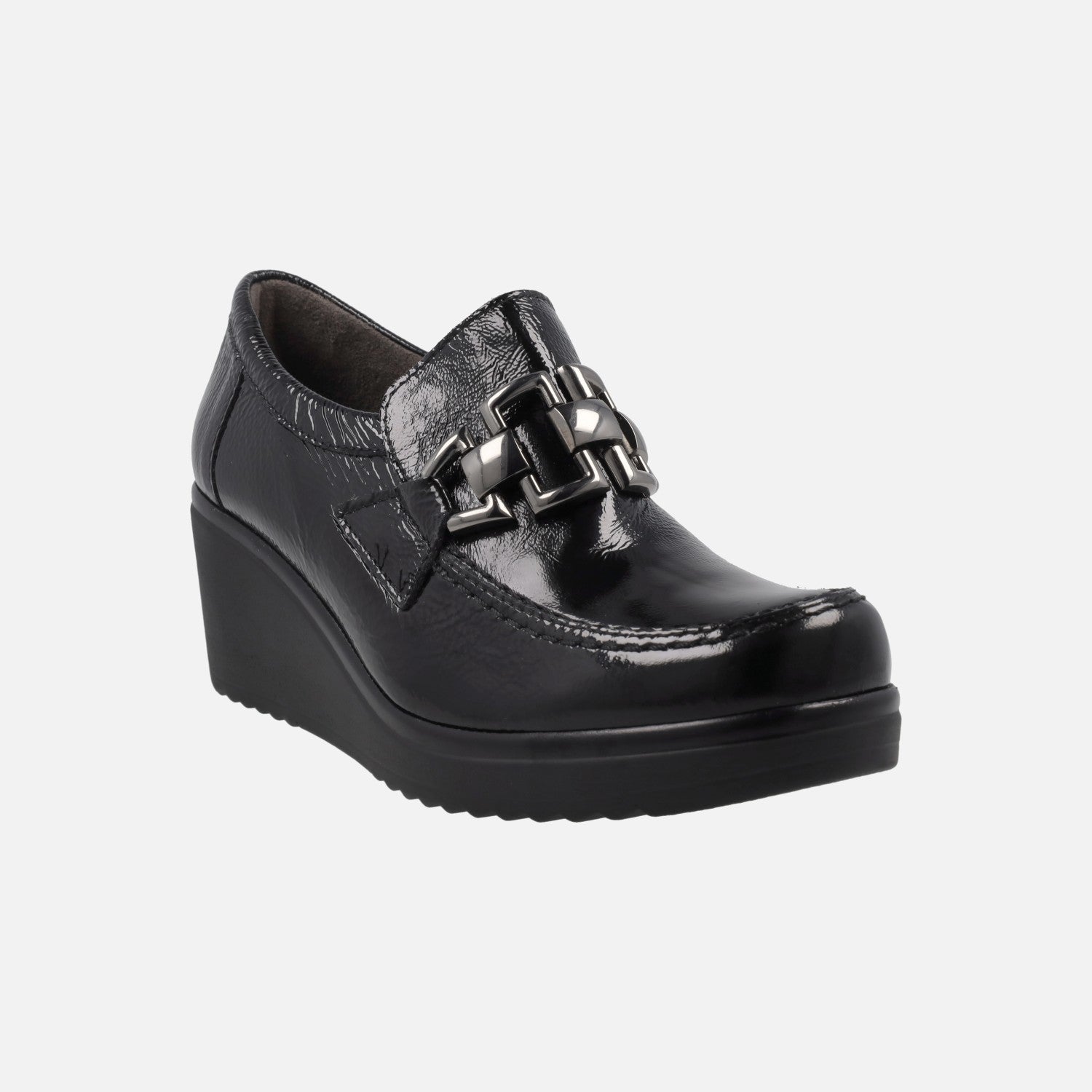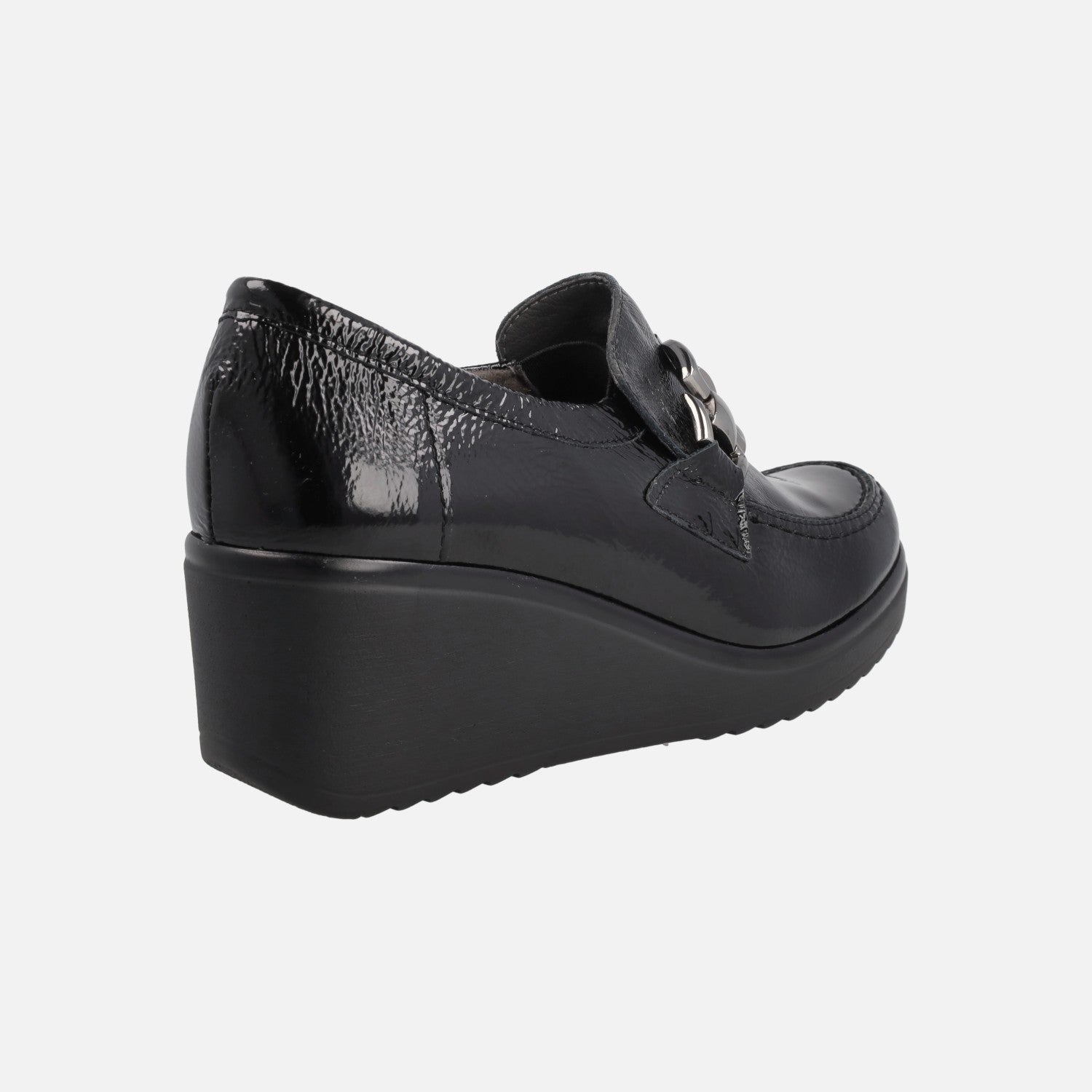 Mocasines negros de charol de la línea Pasodoble de Pitillos, modelo 20232 negro. Mocasines de cuña, con exterior en piel charol negra y adorno metálico plateado cruzando el empeine. Interior textil con plantillas extraíbles. Pieza elástica en el interior del empeine para mayor calce. Cuña sintética con una altura trasera de 6 cm (2 cm parte delantera). Made in Spain.