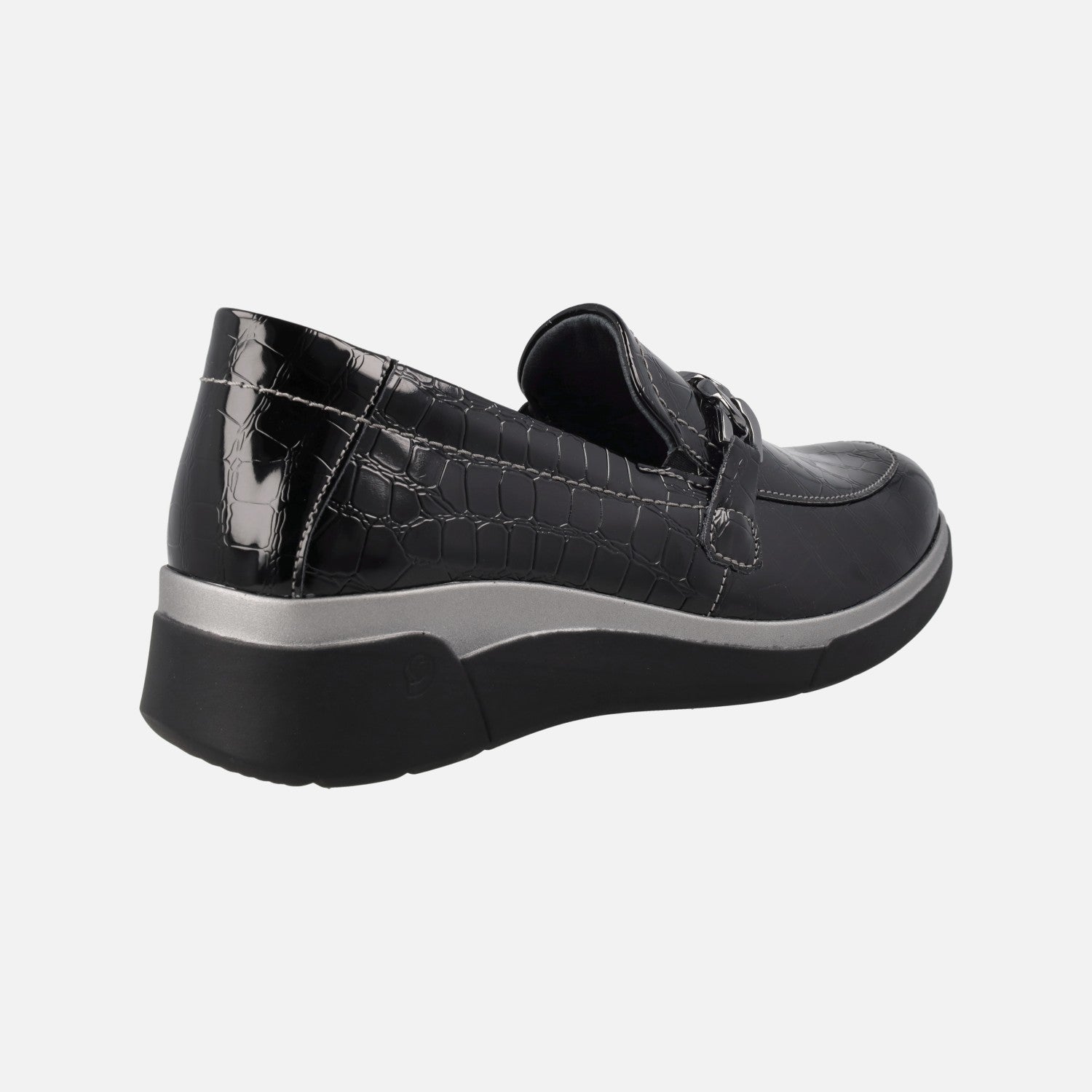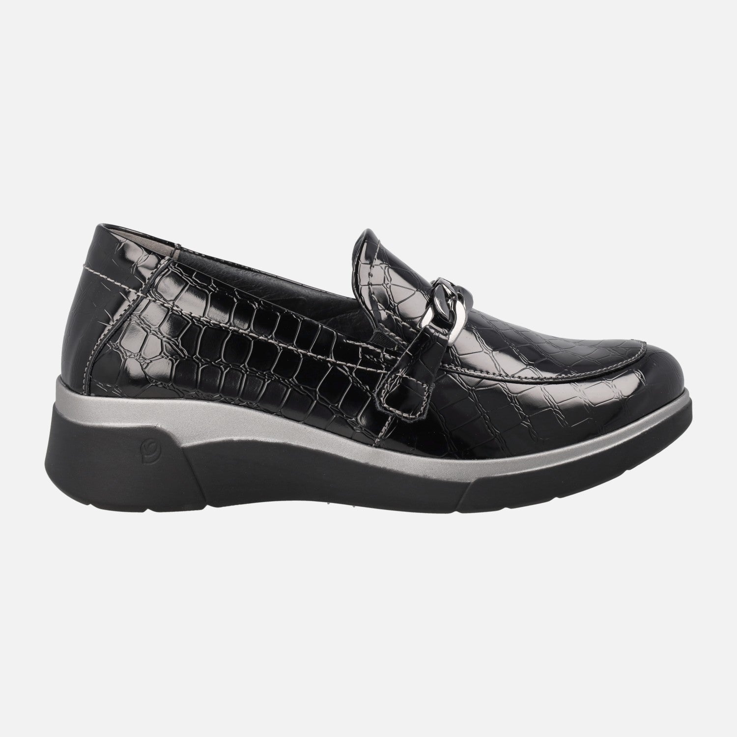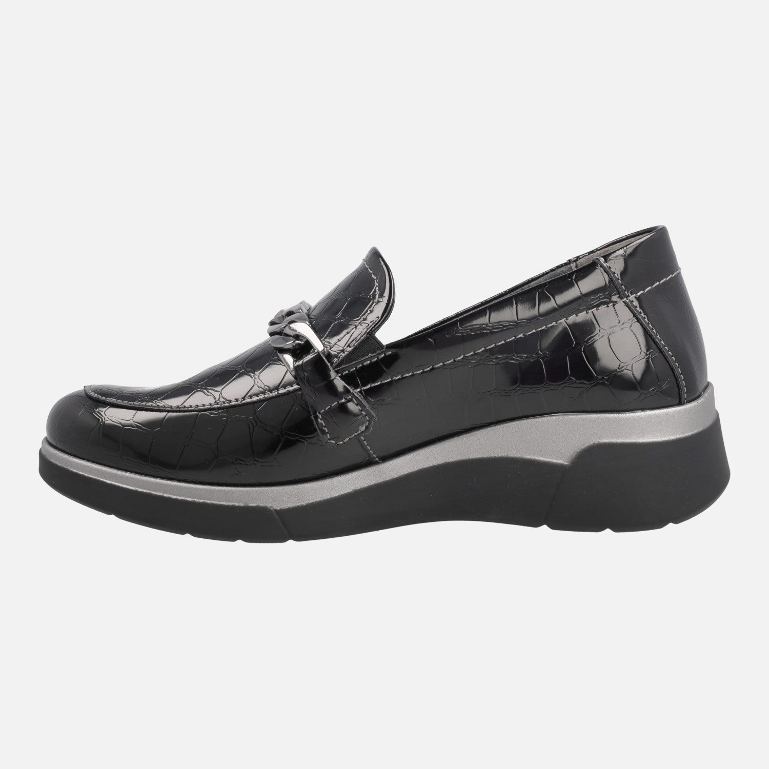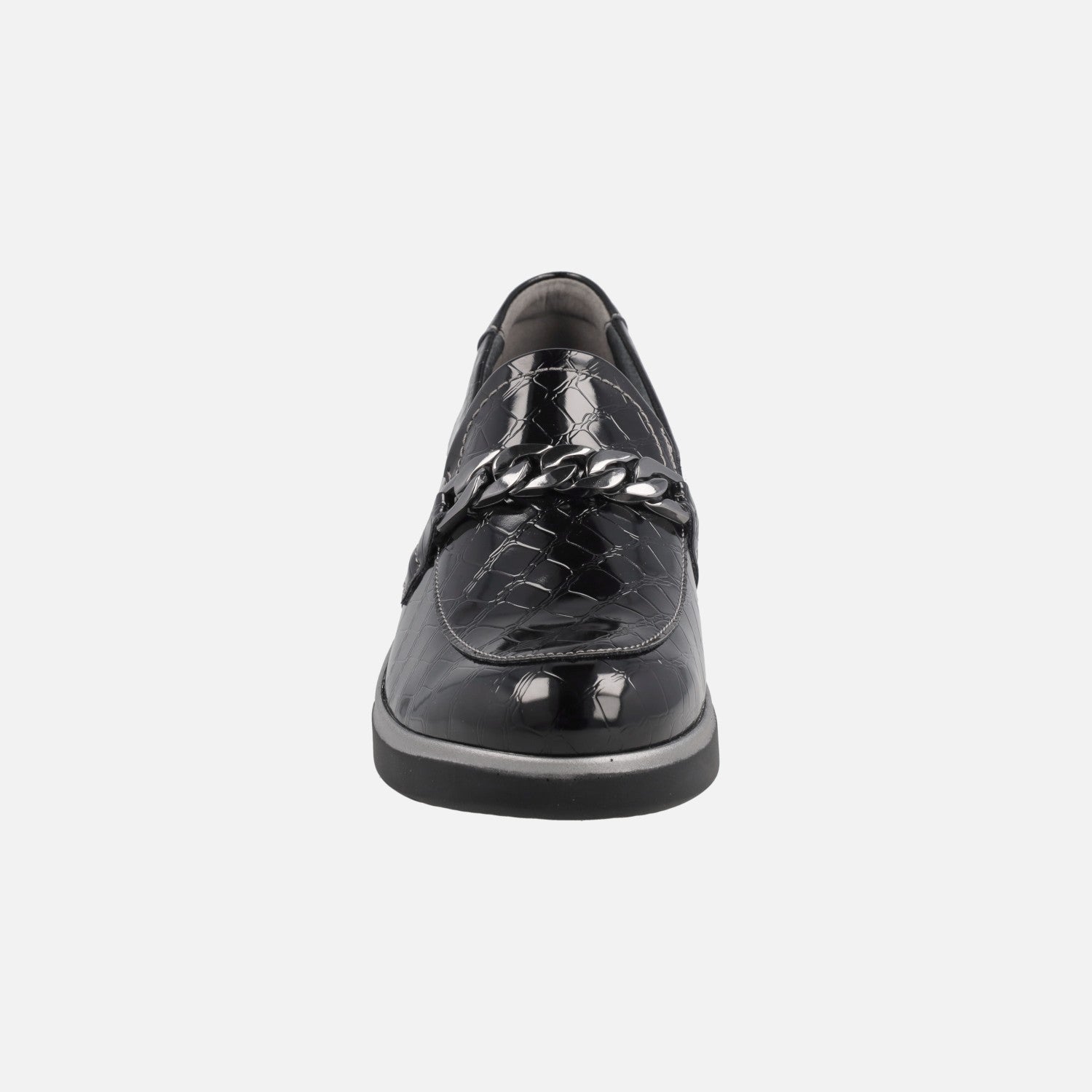 Mocasines confort para mujer de la marca Leyland modelo 3581 Negro. Mocasines elaborados en piel sintética grabada coco, en color negro. Adorno de eslabones plateados en la pala. Interior mixto en piel y tejido con plantillas extraíbles. Piso sintético, con 4 cm de altura trasera (2 cm parte delantera).