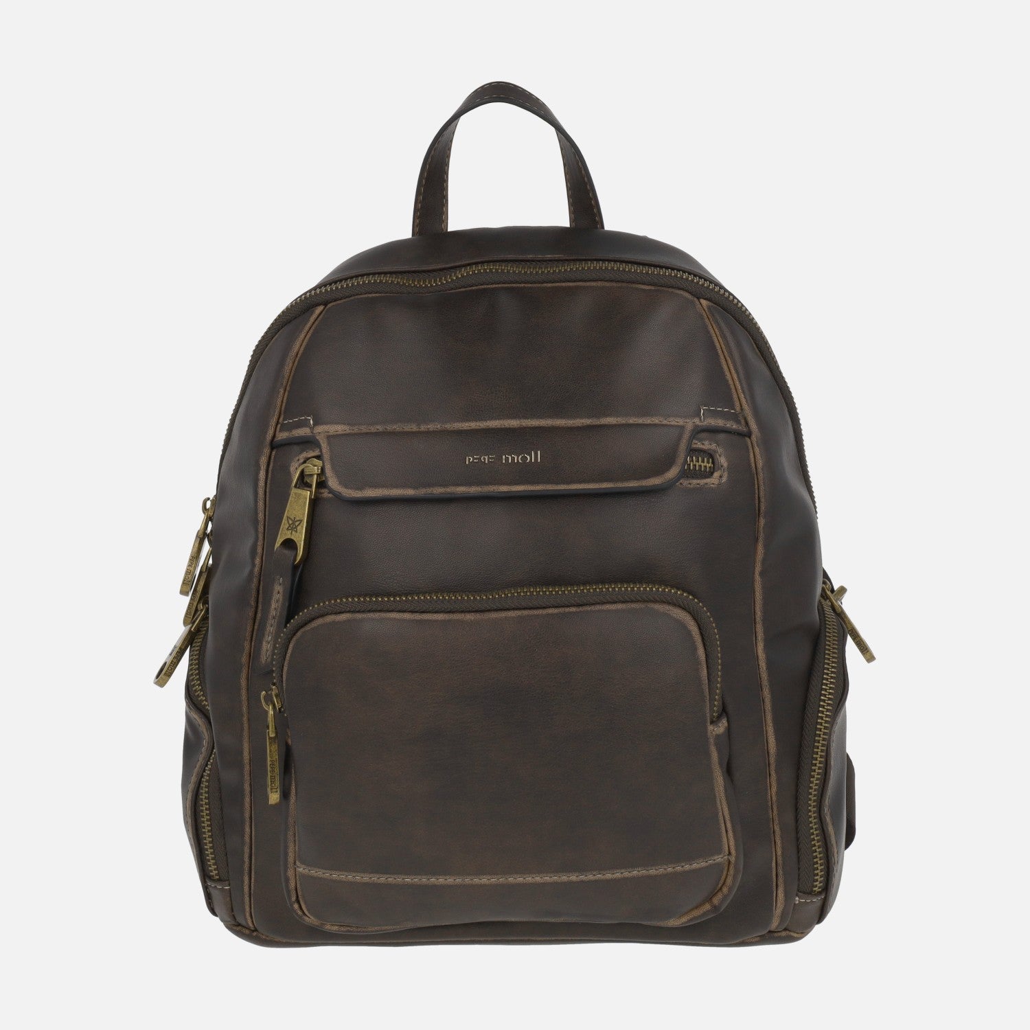 Mochilas efecto gastado de la marca Pepe moll modelo 252222 Nathalia brown. Mochilas elaboradas en materiales sintéticos efecto piel 100% poliuretano. Compartimento central, bolsillos laterales, delanteros y traseros todos con cierre de cremallera. Interior textil con bolsillos internos. Asa fija para llevar de mano. Dos asas ajustables a la espalda para llevar de mochila. Medidas_ 32 cm de alto x 30 cm de ancho inferior x 24 cm de ancho superior x 14 cm de fondo.