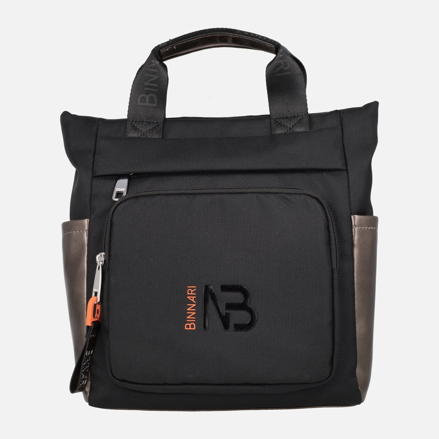 Mochilas para mujer de la marca Binnari modelo 20733 Negro. Mochilas elaboradas en tejido nylon en combinado negro con detalles en bronce. Dos bolsillos delanteros y uno trasero todos ellos con cierre de cremallera. Bolsillos laterales. Compartimento principal con cremallera. Dos asas para llevar de mano. Asas traseras ajustables para mochila. Medidas: 29 cm de alto x 27,5 cm de ancho x 9 cm de fondo.