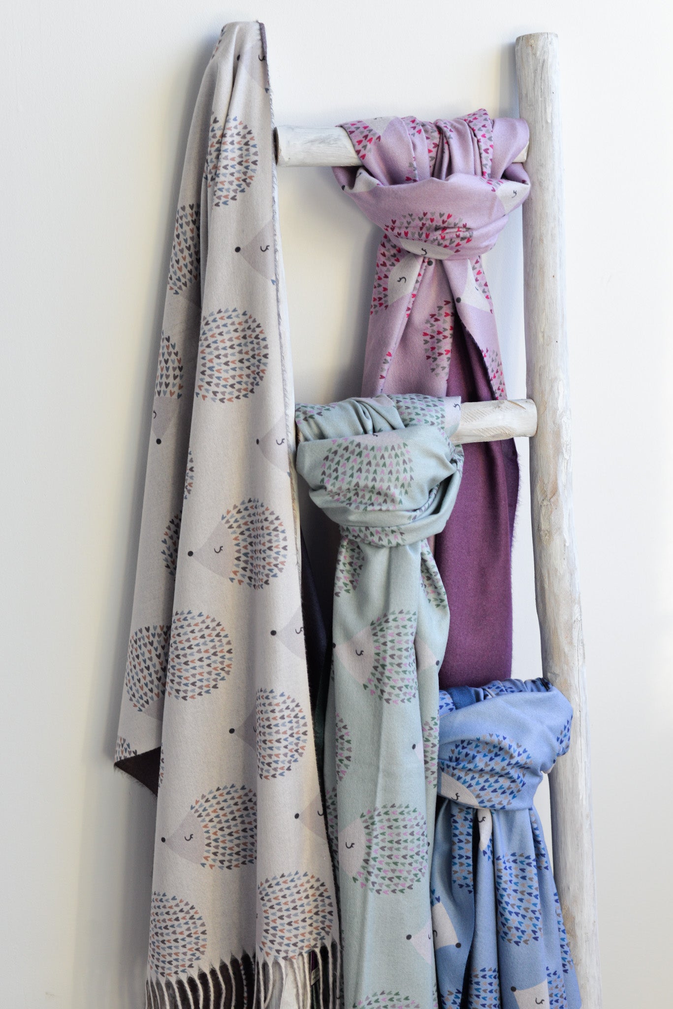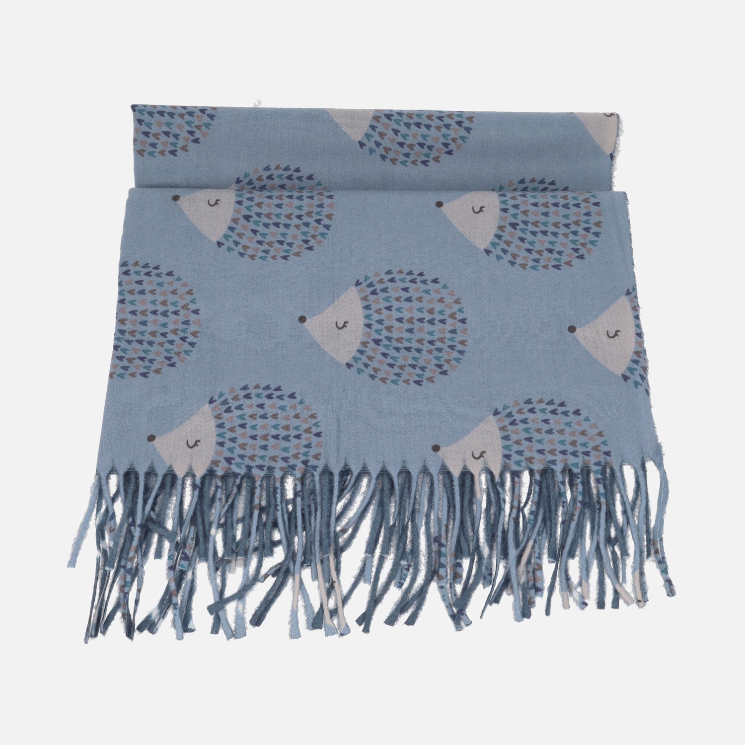 Preciosas pashminas con diseño de erizos y el otro lado liso. Tejido suave. Elaborados en tejido 80% poliéster y 20% viscosa. Disponibles en beige, azul y rosa. Ancho 71 cm y largo 206 cm (contando los flecos).