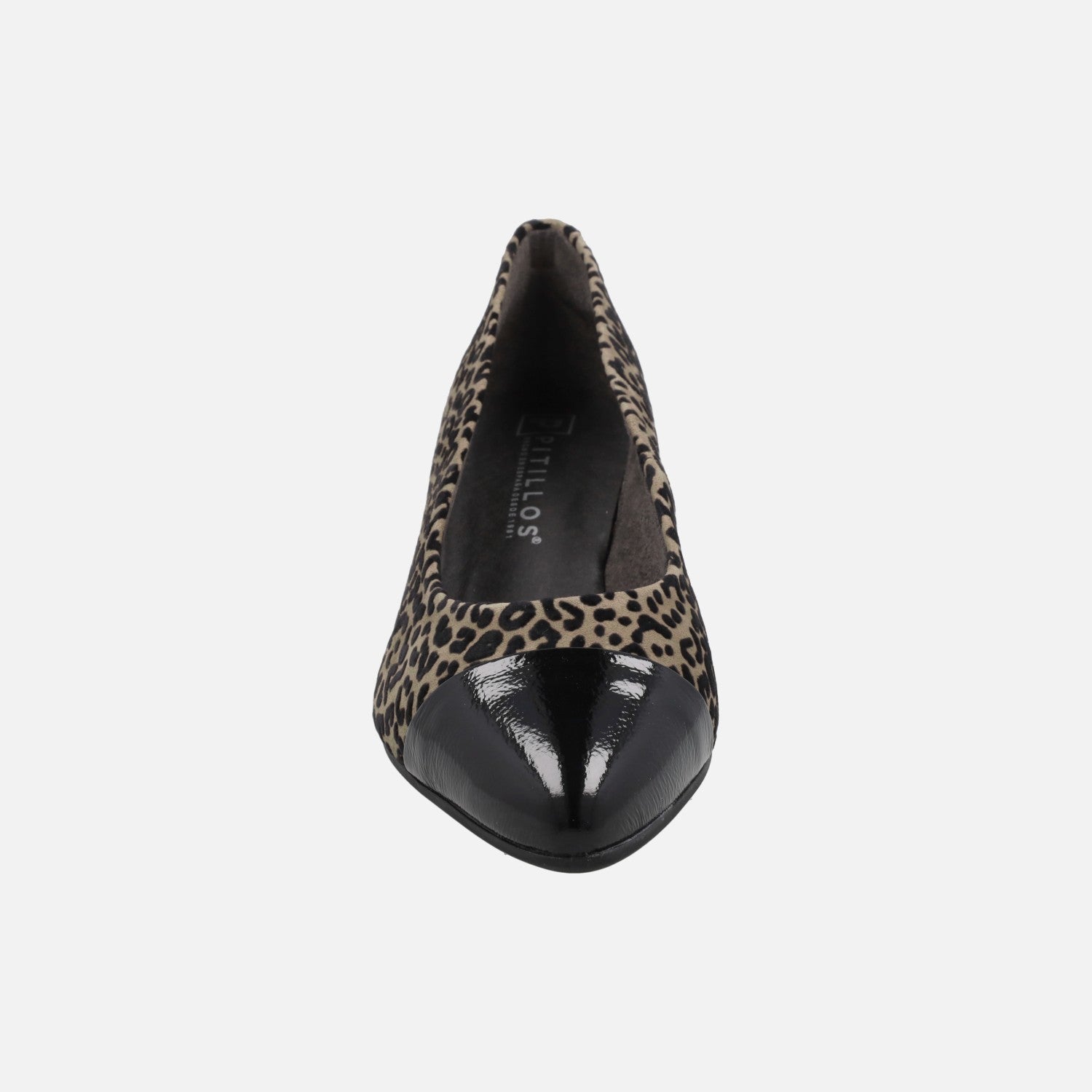 Elegantes zapatos corte salón de la marca Pitillos, modelo 10856. Zapatos de tacón elaborados en tejido con estampado leopardo y puntera en piel charol negra. Tacones de 5 cm de altura. Interiores en tejido suave. Piso sintético. Made in Spain.