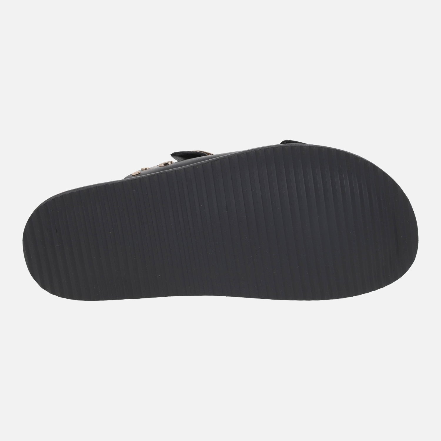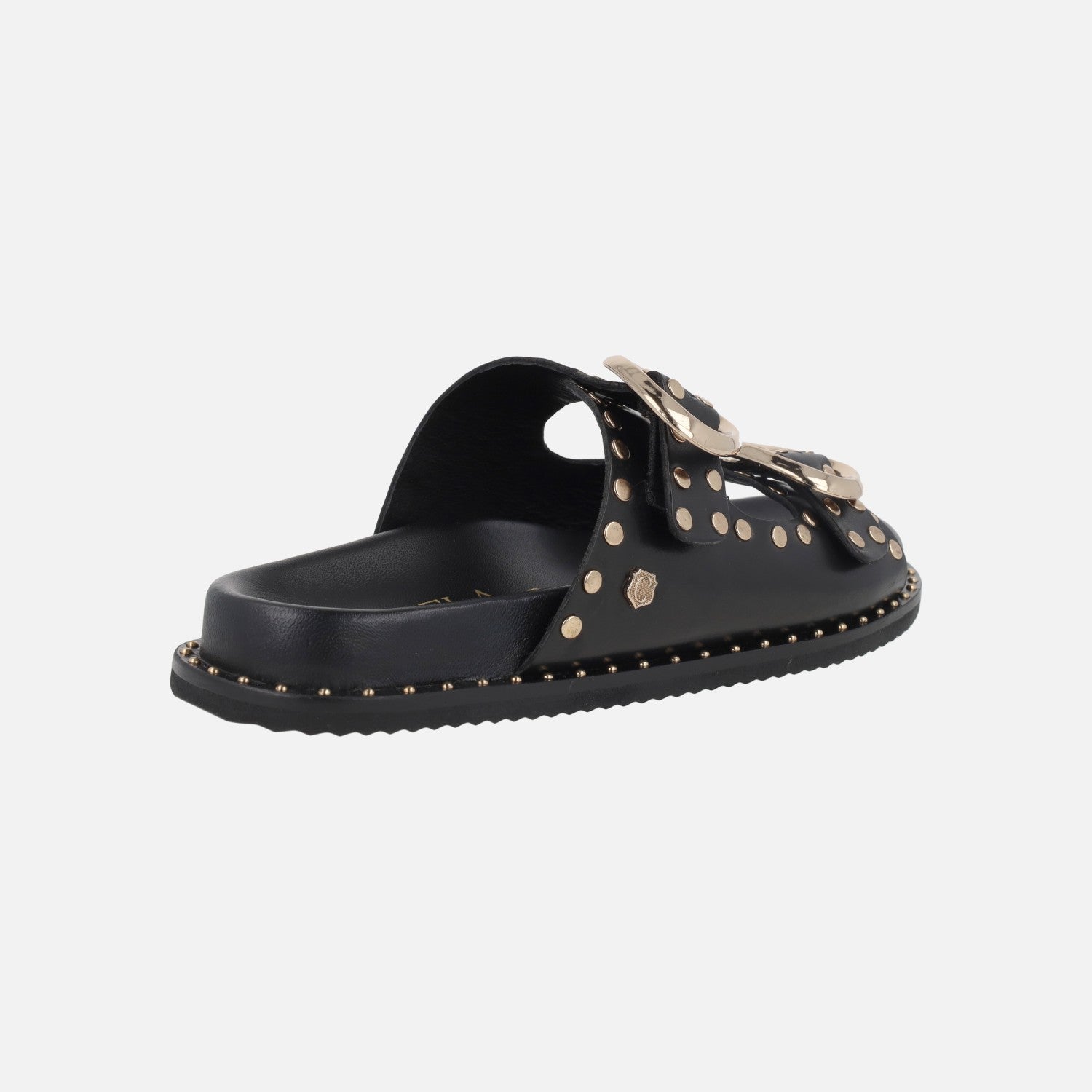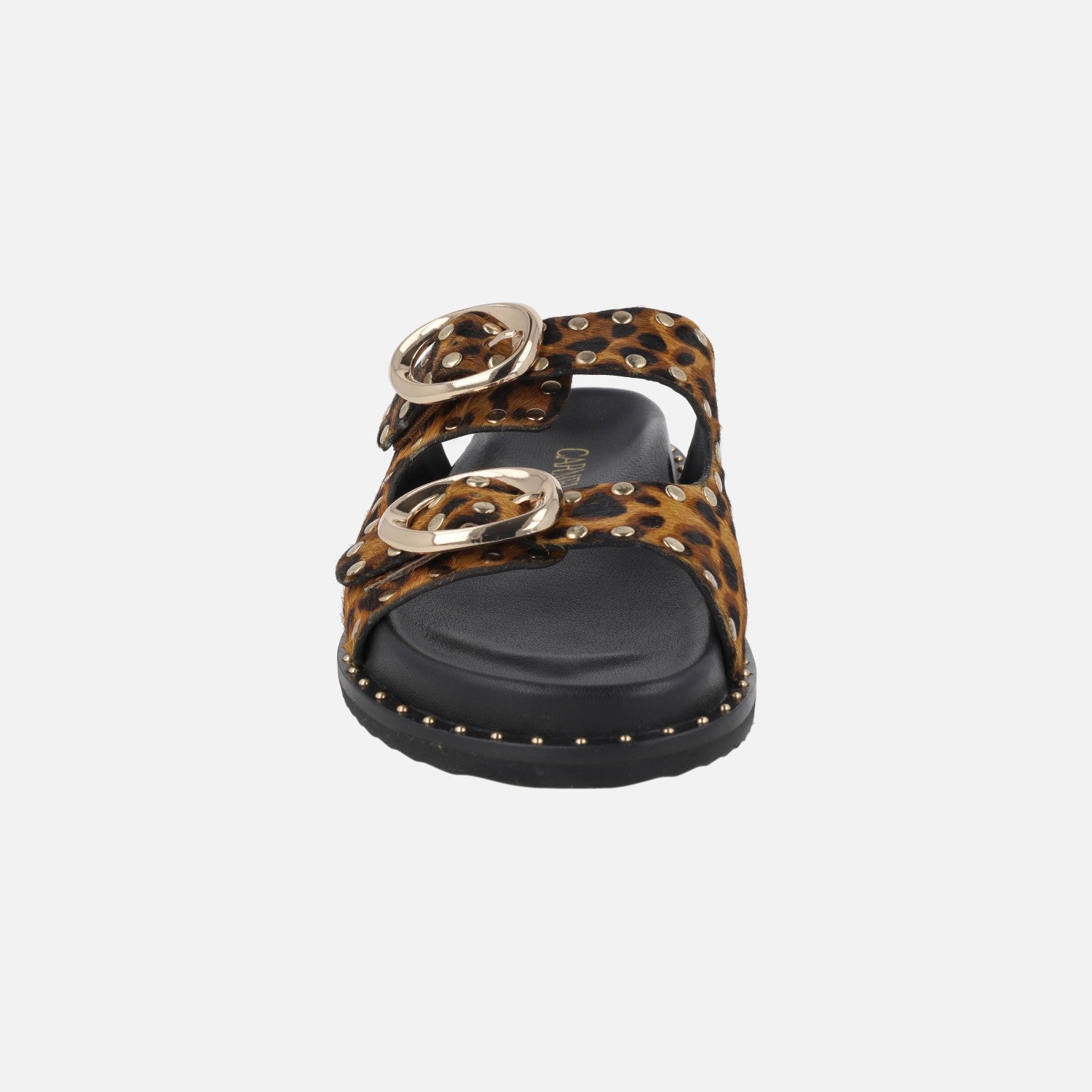 Elegantes sandalias con hebillas de la marca Carmela shoes modelo 163056, disponibles en piel leopardo o piel negra. Sandalias con exterior en piel y detalle de hebillas y tachas metálicas doradas. Interiores forrados de piel. Suela sintética de 3 cm de altura trasera (2,5 cm parte delantera).